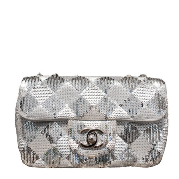 A must-have for any fashion expert, this Silver Sequin Mini Flap from Chanel is truly remarkable.
