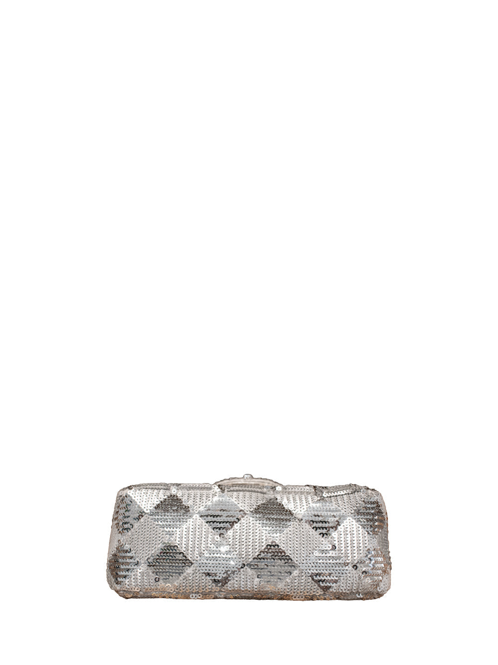 Its 2014 design boasts a stunning geometric pattern made of matte and metallic silver sequins, complemented by silver hardware and a chain link strap with silver metallic leather.