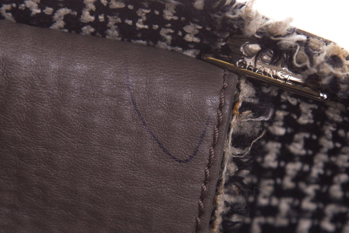 Chanel Slate Gray '09 Tweedy Lambskin and Tweed Tote Handbag Double Tweed and Ribbon Interwoven Chain Interior Tweed Lining. This item is in good condition; some fraying on handles and lining as well some discoloring/marks on leather