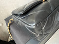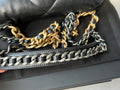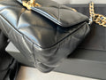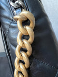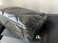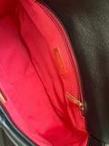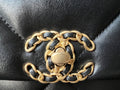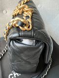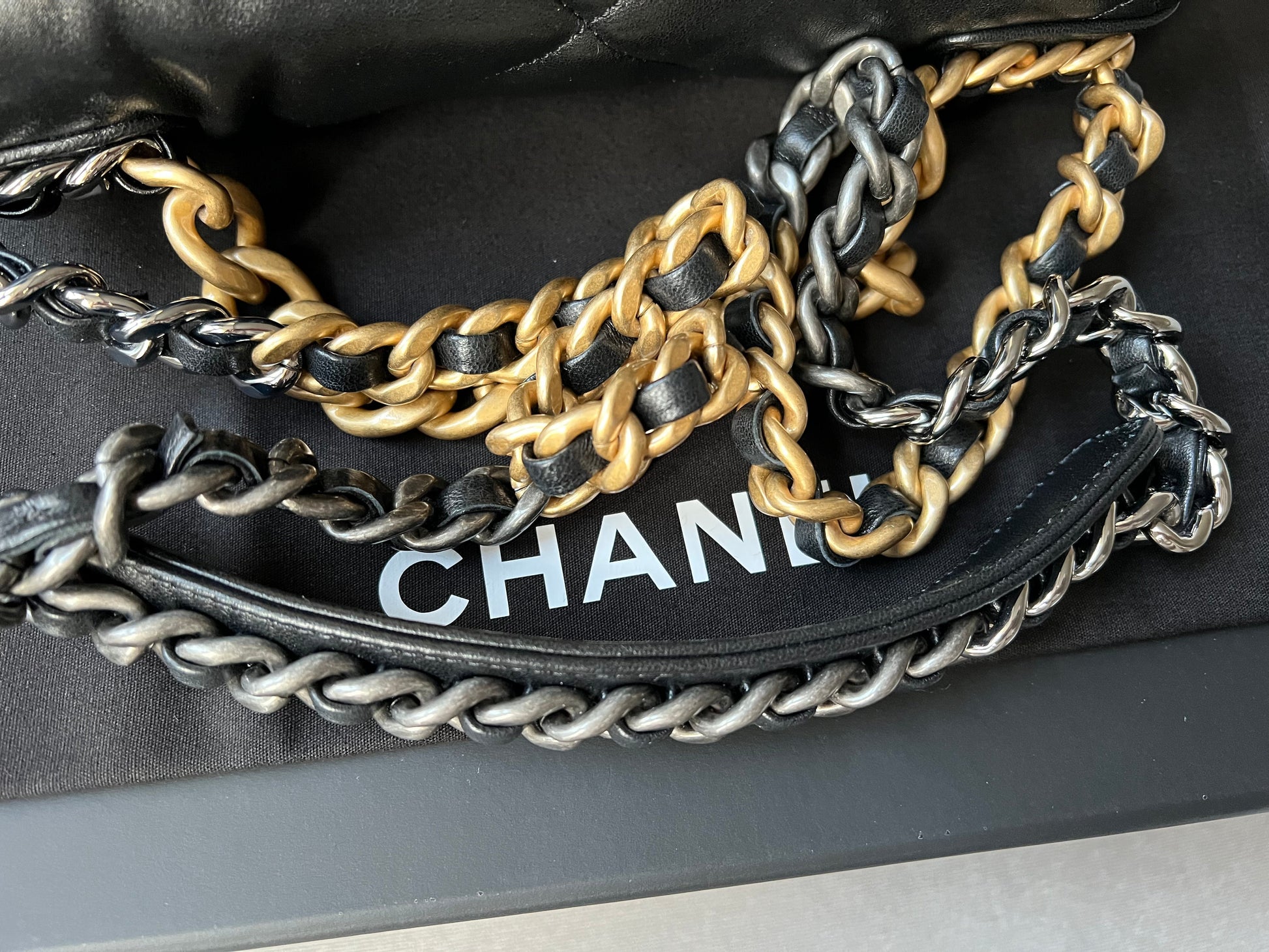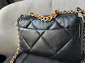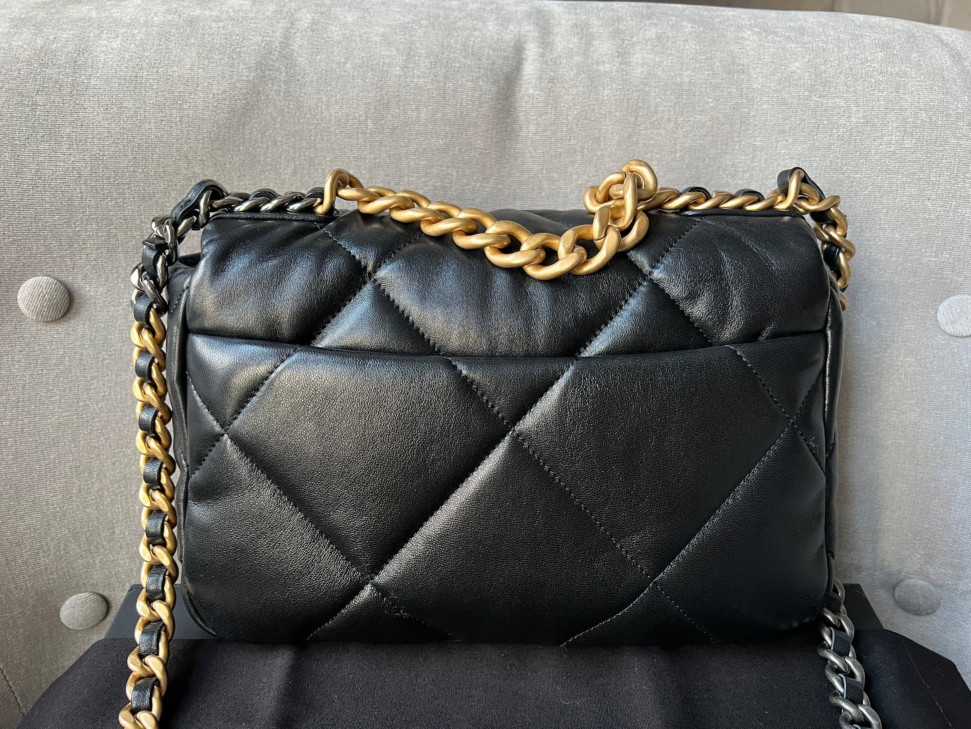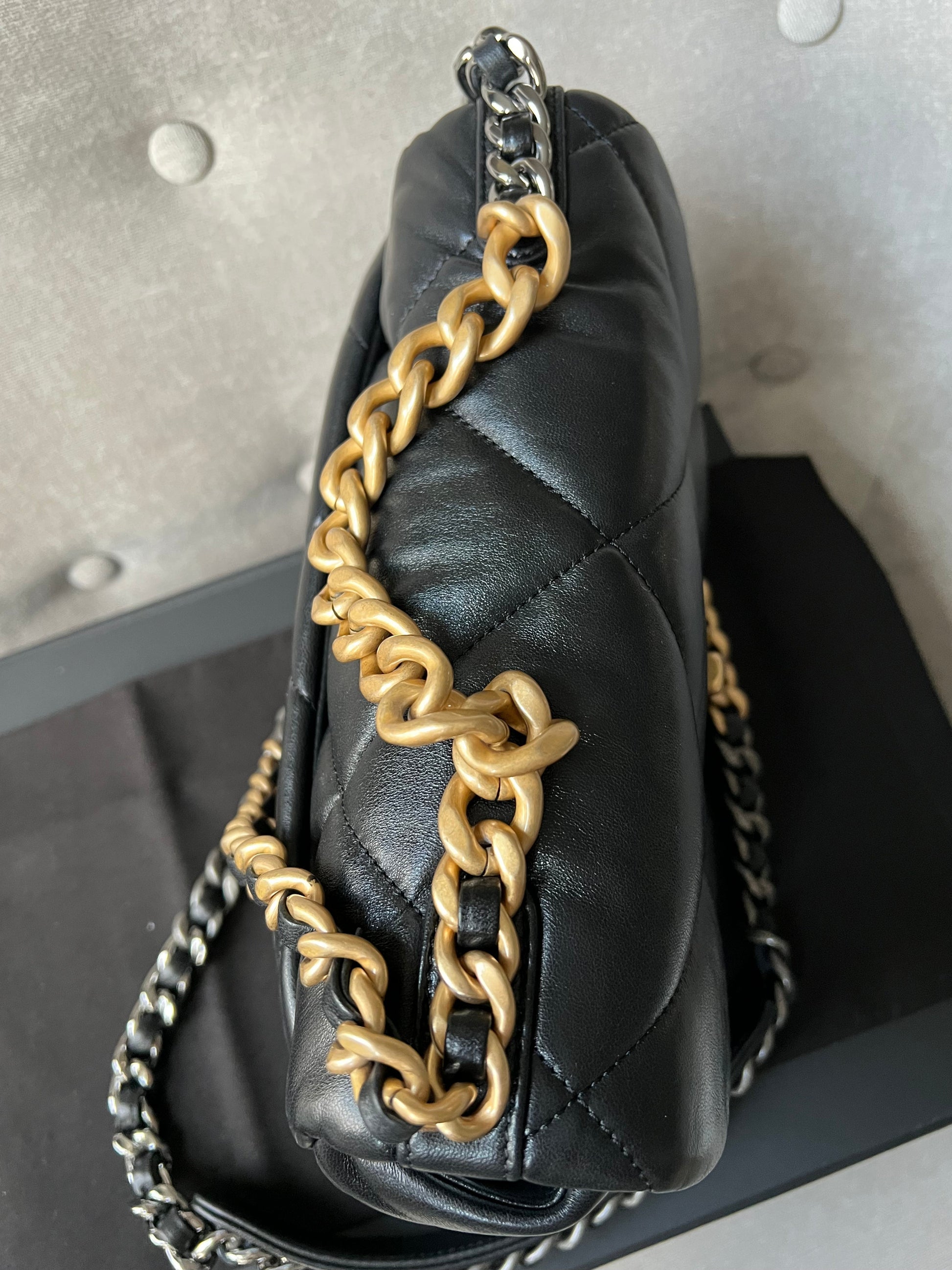 Chanel Small 19 in Black Lambskin with Gold and Ruthenium hardware. This classic quilted and on trend Chanel 19 flap bag is highly sought after. The chunky interwoven chain can be used as a top handle or sits elegantly on your shoulder. The puffy lambskin is buttery soft and is paired with the two tone hardware. Can be carried by the top handle or cross body with the longer strap subject to size. Although termed "small" it is more medium in size for this style of bag. Goes with any outfit.