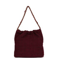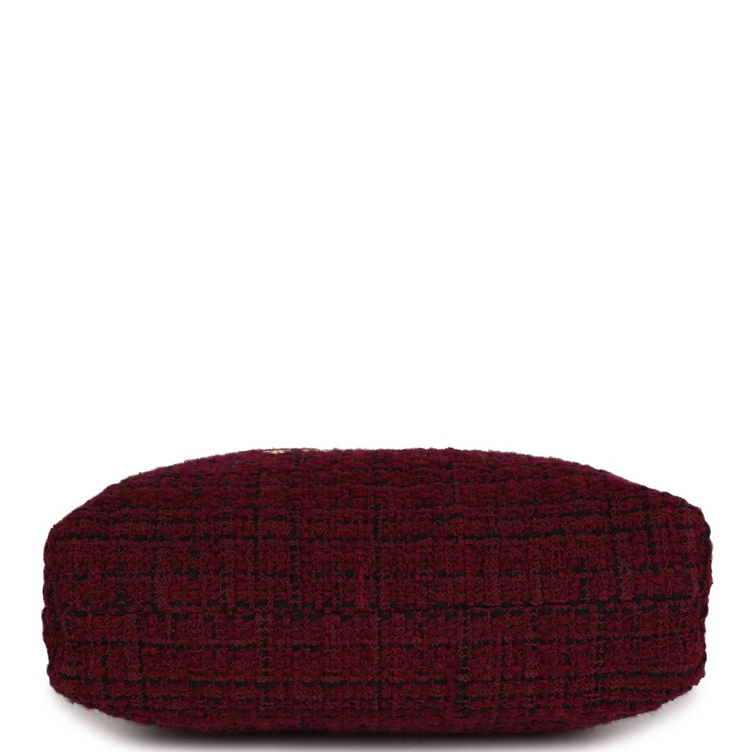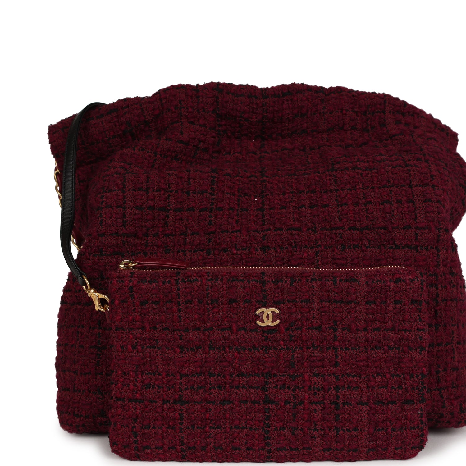 This Small 22 hobo bag is in Burgundy and Black tweed fabric with gold tone hardware and has the signature diamond quilting, CHANEL on the front in gold metal, removable pouch, and long gold tone and burgundy leather chain.