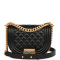 This Small Boy Messenger bag is in black quilted caviar leather with antique gold tone hardware and features a full front flap with the Le Boy CC push lock closure and an antique gold tone chain link and black leather padded shoulder/crossbody strap.