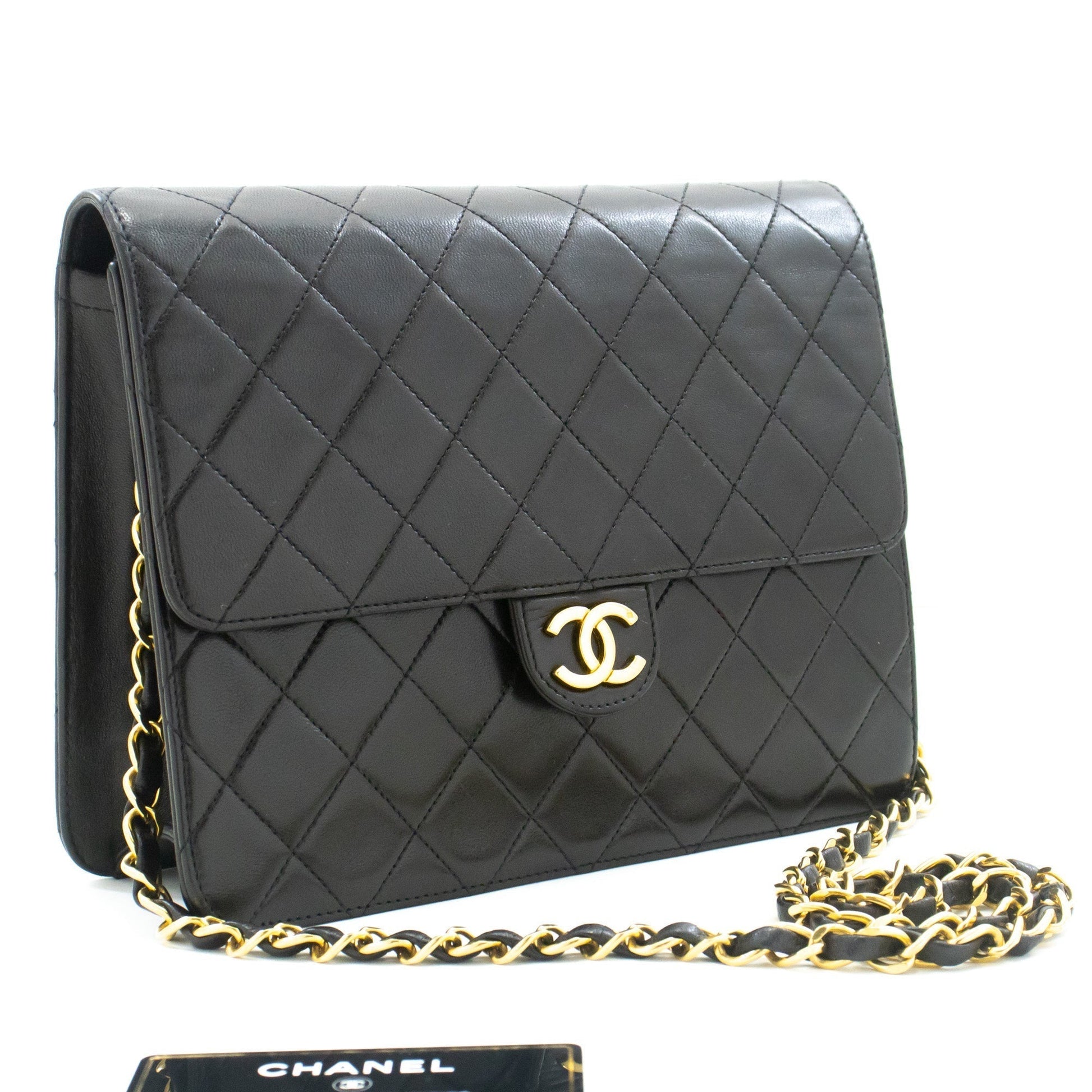An CHANEL Small Chain Shoulder Bag Clutch Black Quilted Flap made of black Lambskin.