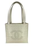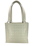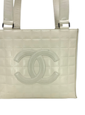 We the ity of this CHANEL Small Chocolate Bar Square Stitch Tote Bag crafted from white square stitched quilted leather and silver-tone hardware. This classic bag features a large embossed 'CC' logo at center and dual flat leather shoulder straps.
