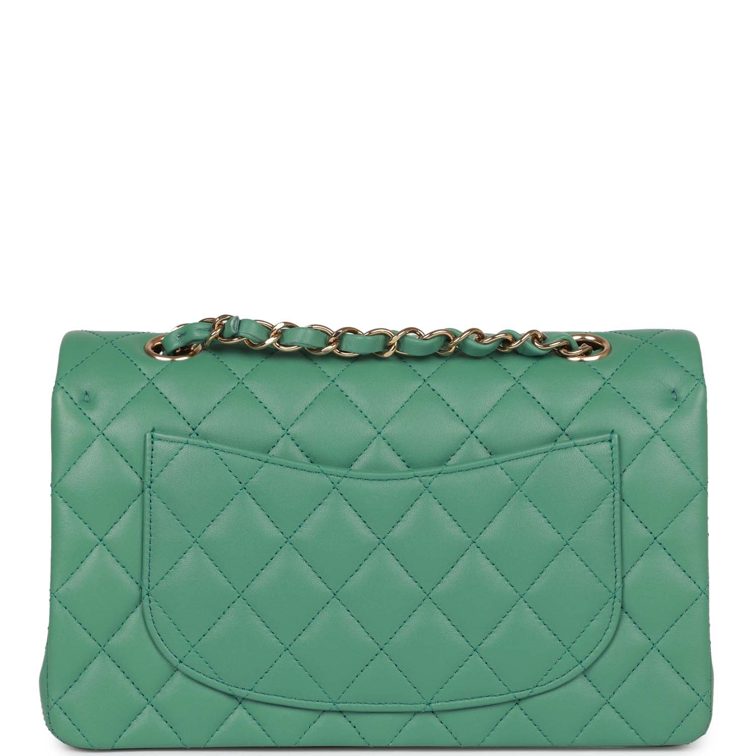 This Small Classic Double Flap bag is in Green lambskin leather with light gold tone hardware and features a front flap with signature CC turnlock closure, half moon back pocket, and adjustable interwoven light gold tone chain link and green leather shoulder strap