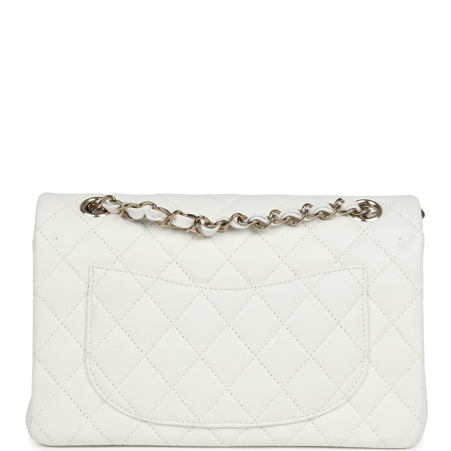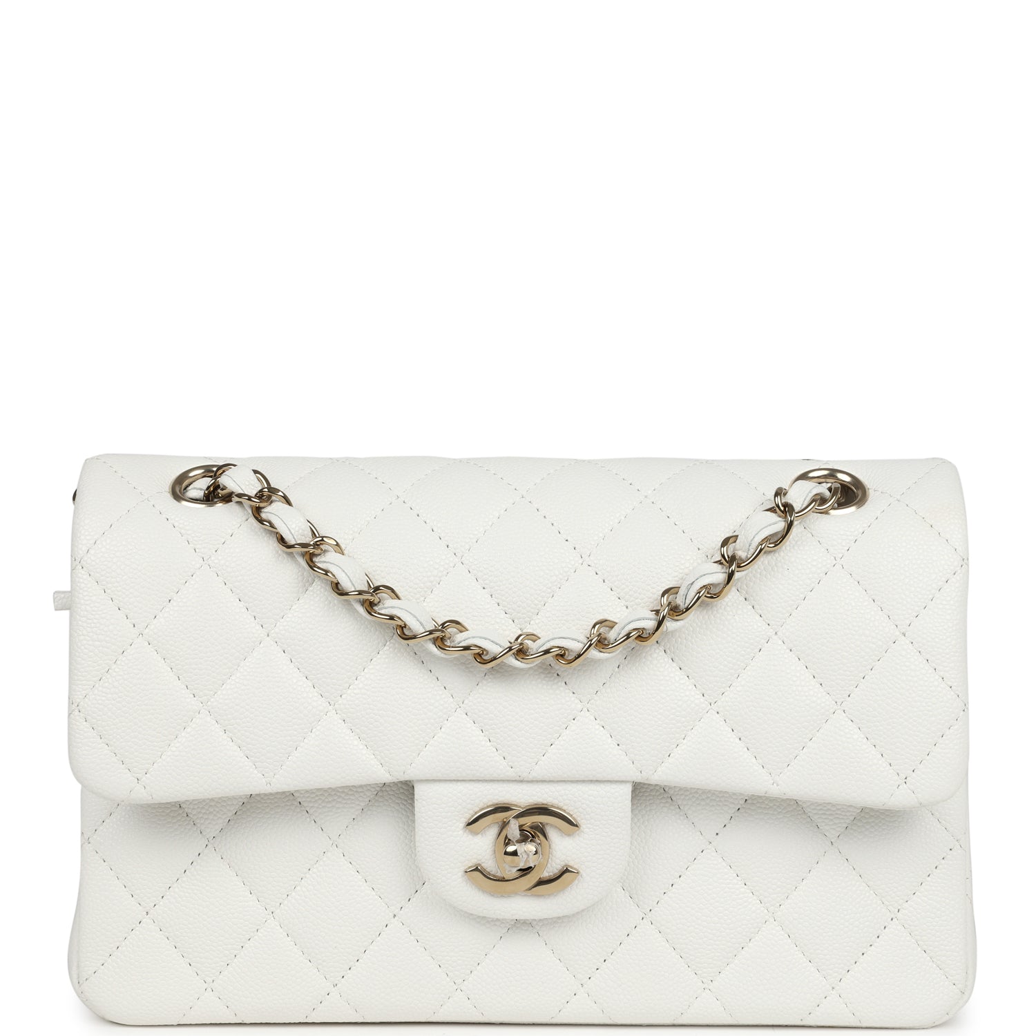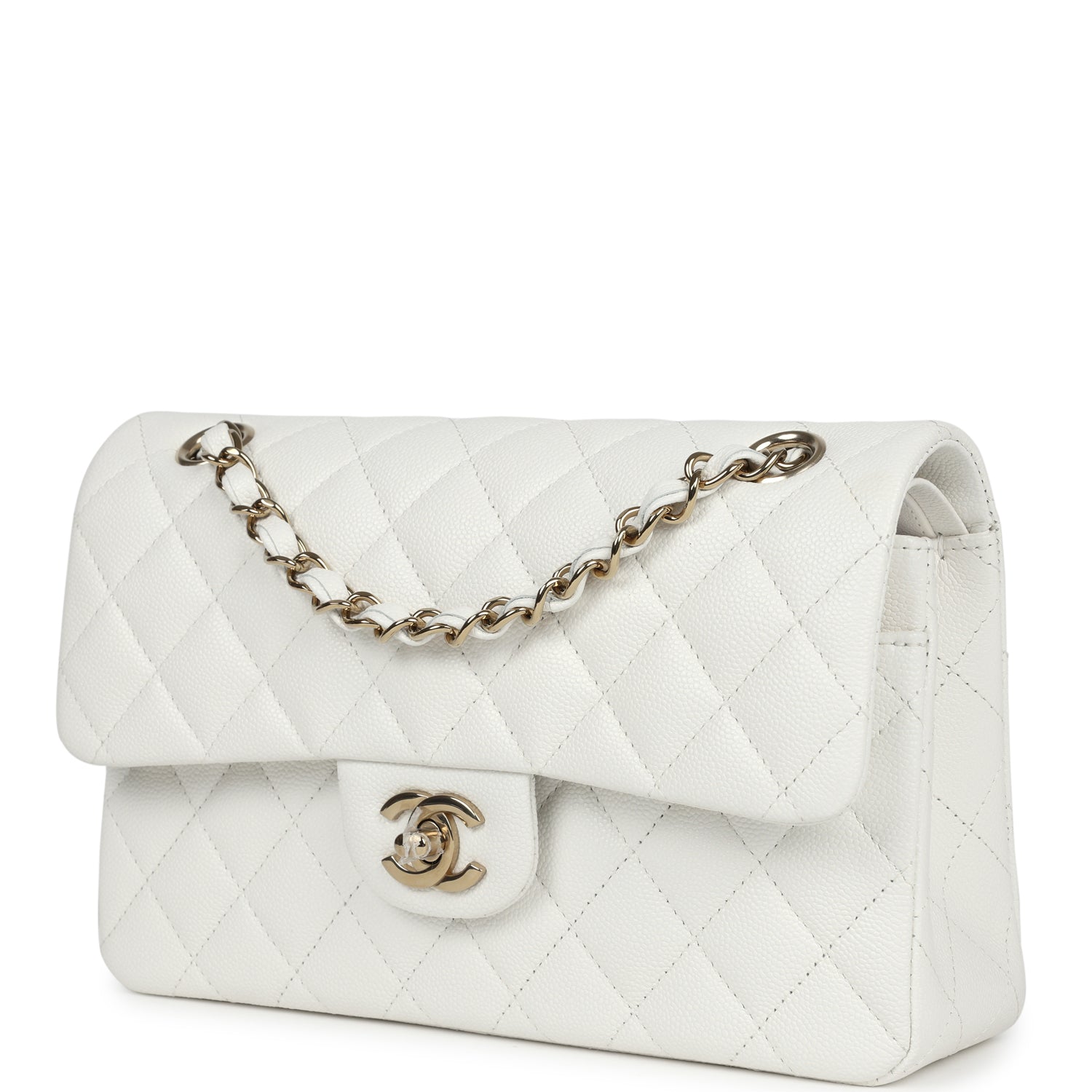 This Small Classic Double Flap bag is in white caviar leather with light gold tone hardware and features a front flap with signature CC turnlock closure, half moon back pocket, and adjustable interwoven light gold tone chain link and white leather shoulder strap