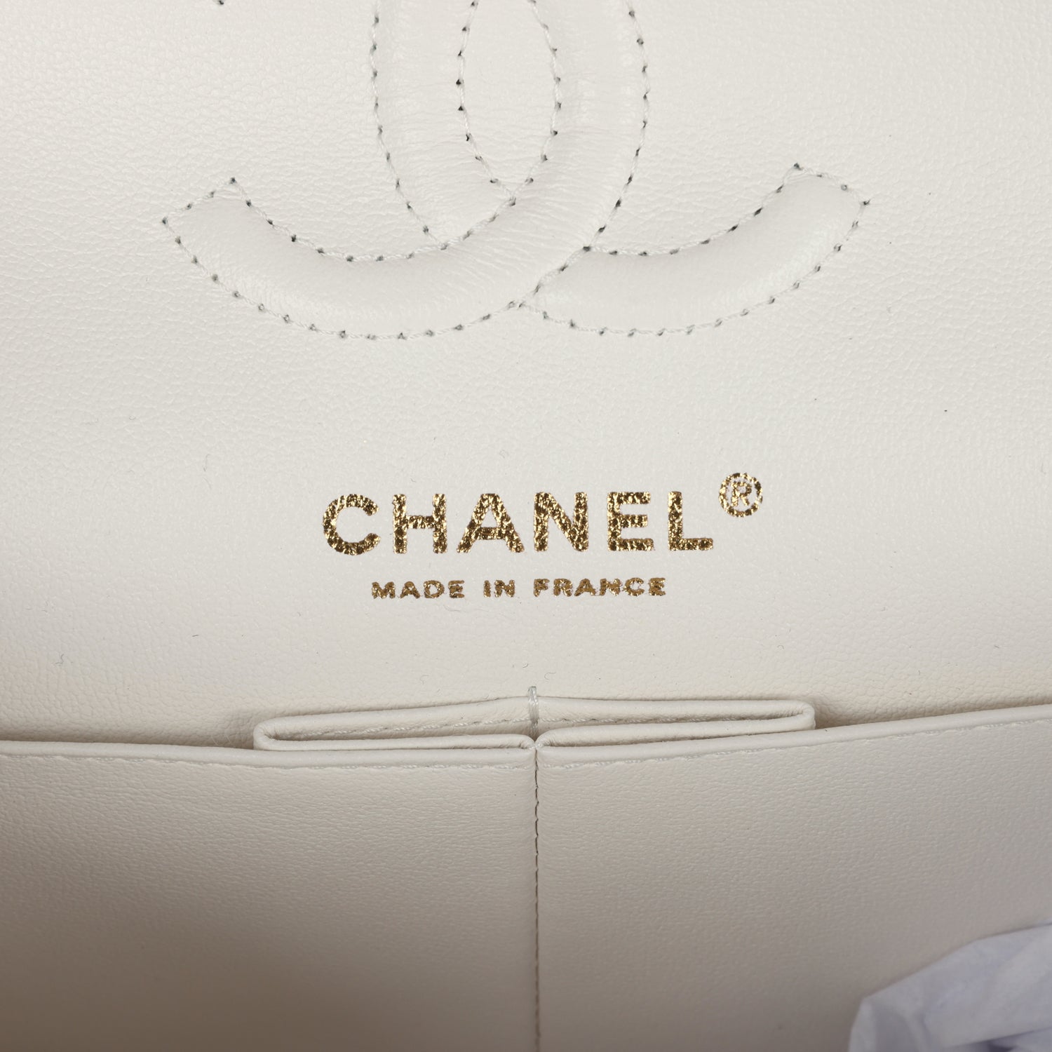 The interior is lined in white leather with the "love letter" zipper compartment underneath the first flap, an "outer" slit pocket under the second flap, and an interior compartment with two open pockets separated by a "lipstick" compartment.