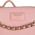 This Small Rectangular Vanity Case is in Pink Quilted Caviar leather with light gold hardware, tonal stitching, CC logo on front of vanity case, top zip around closure with leather pull, 3 interior card slots and a long crossbody/shoulder light gold interwoven with pink leather chain strap.