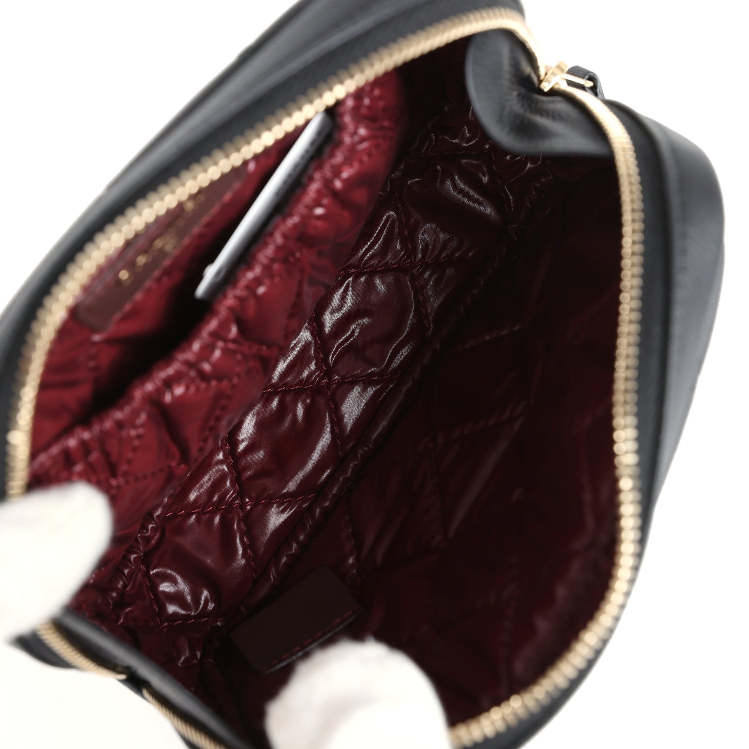 The interior is lined in burgundy quilted nylon fabric and has one pocket on rear wall.