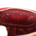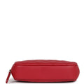 This Chanel small quilted curvy cosmetic pouch is in red caviar leather with light gold hardware, featuring signature diamond quilt, signature CC logo on front of pouch, and a zipper closure.