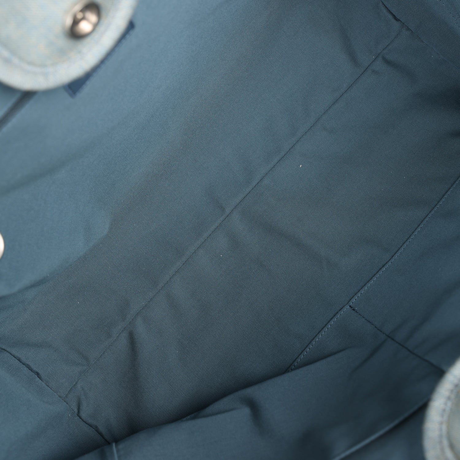 The interior is lined in blue fabric and has two open pockets on the front wall and a zipper pocket with a Chanel pull on the rear wall.
