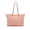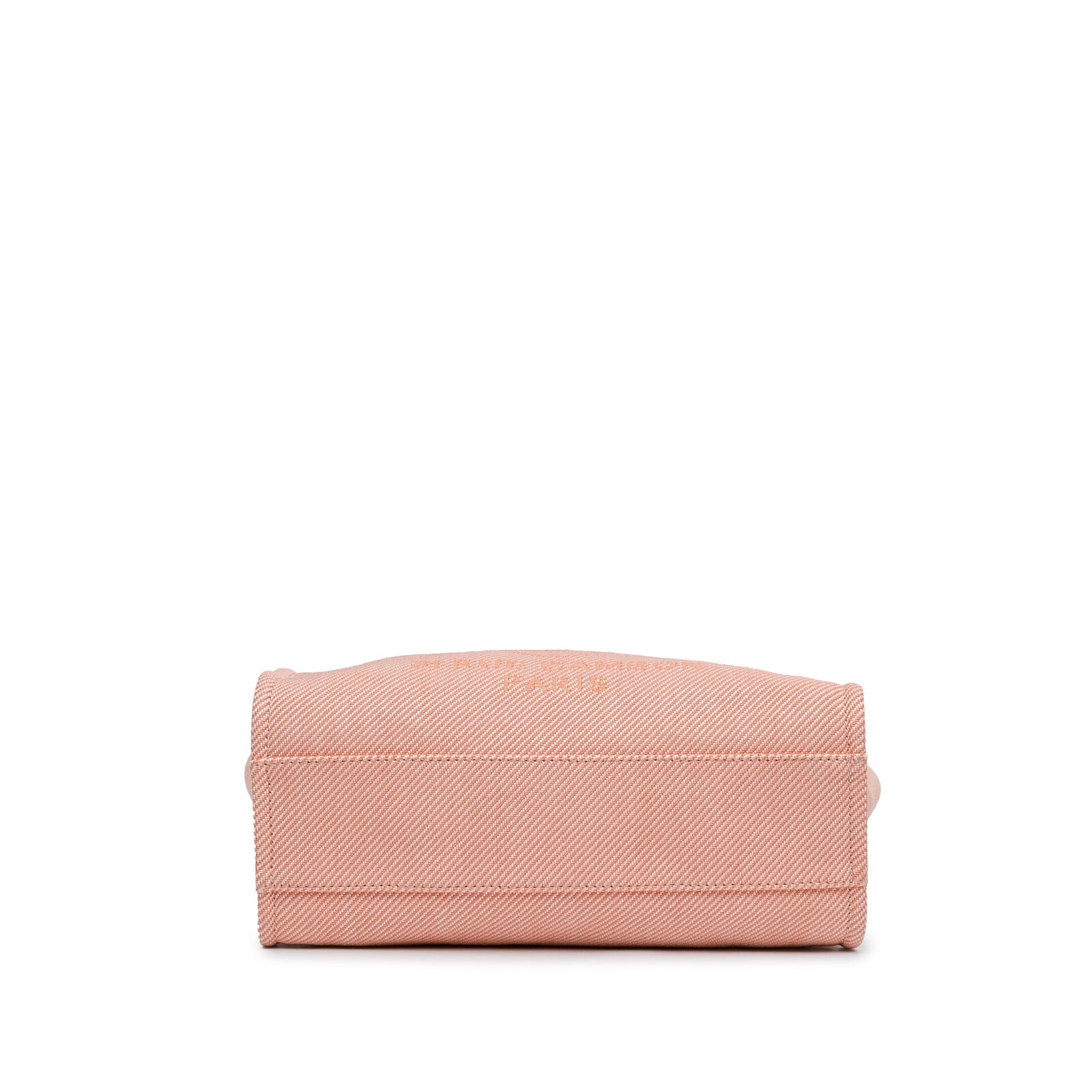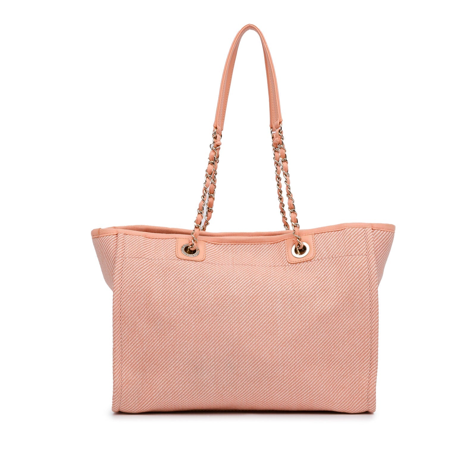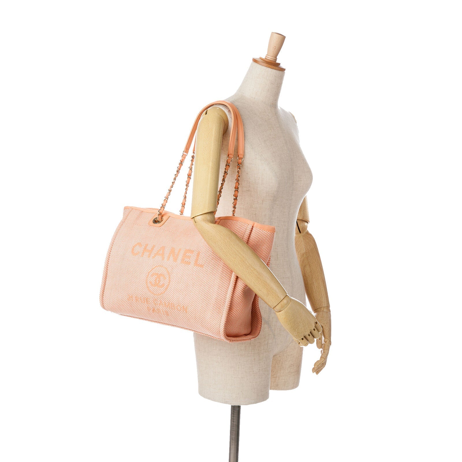 Introducing the iconic Auth Chanel Small Deauville Tote in a stunning Pink Salmon hue. Crafted from durable canvas fabric, this bag exudes elegance and sophistication. Perfect for adding a pop of color to your outfit, it features the classic Chanel logo subtly embossed on the front. With its spacious interior and comfortable leather handles, this tote seamlessly combines style and practicality. Elevate your look with this timeless piece from Chanel's esteemed Deauville collection.