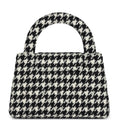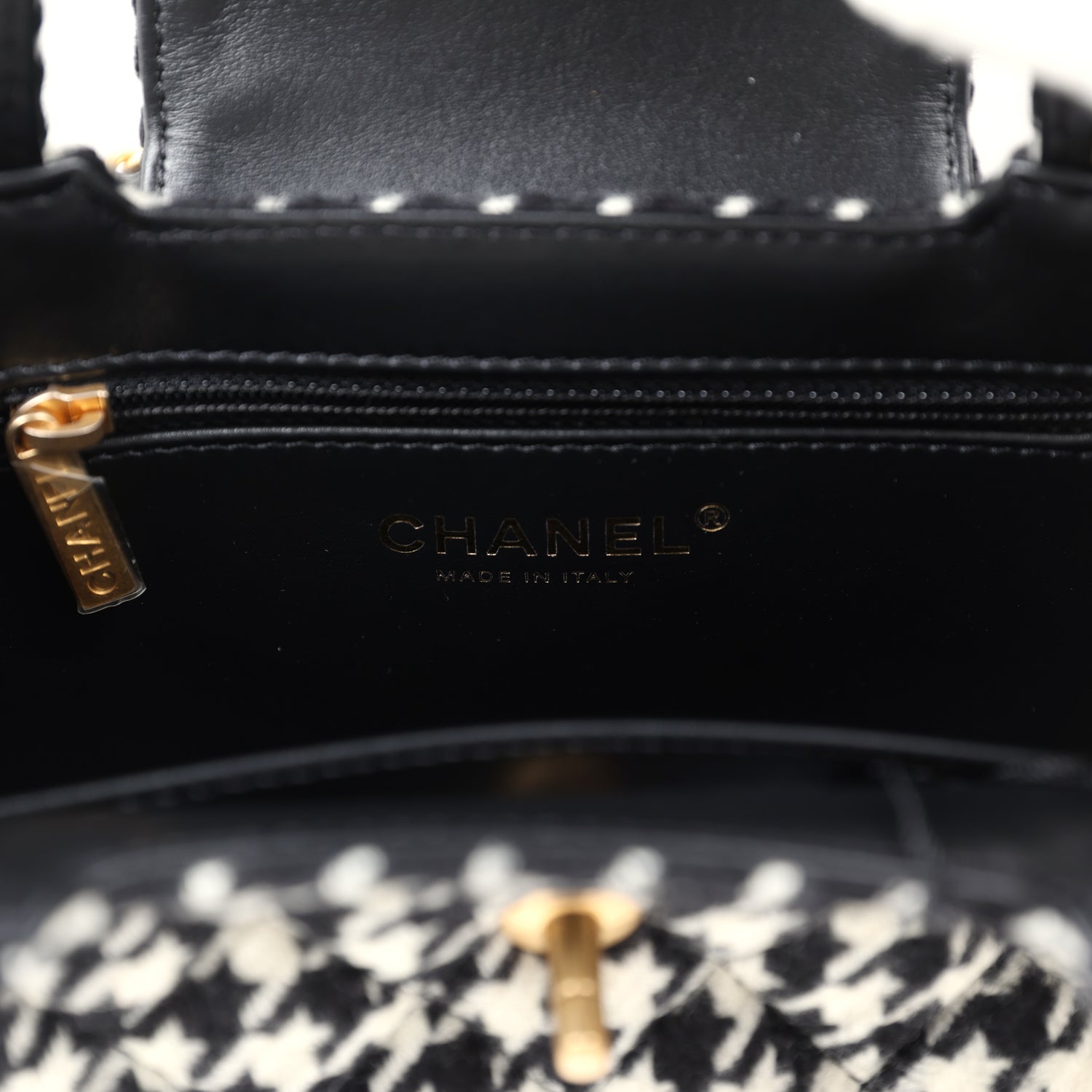This small Chanel Kelly is in black and white houndstooth tweed fabric with brushed gold hardware, tonal stitching, two flat back top handles and a chain strap interwoven with leather, tab flap with CC turnlock acts as a closure, zip pocket against back wall, slit pocket against front wall.