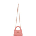The interior is lined with pink leather and has one zipper and one slip pocket.