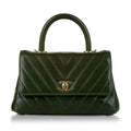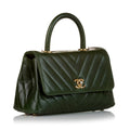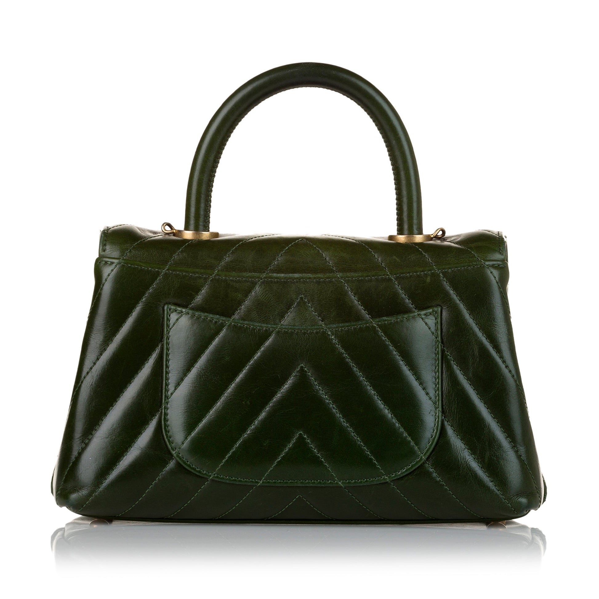 This flap bag features a quilted lambskin leather body, a leather woven chain strap, a flat leather top handle, a front flap with a CC turnlock closure, and interior zip pocket.