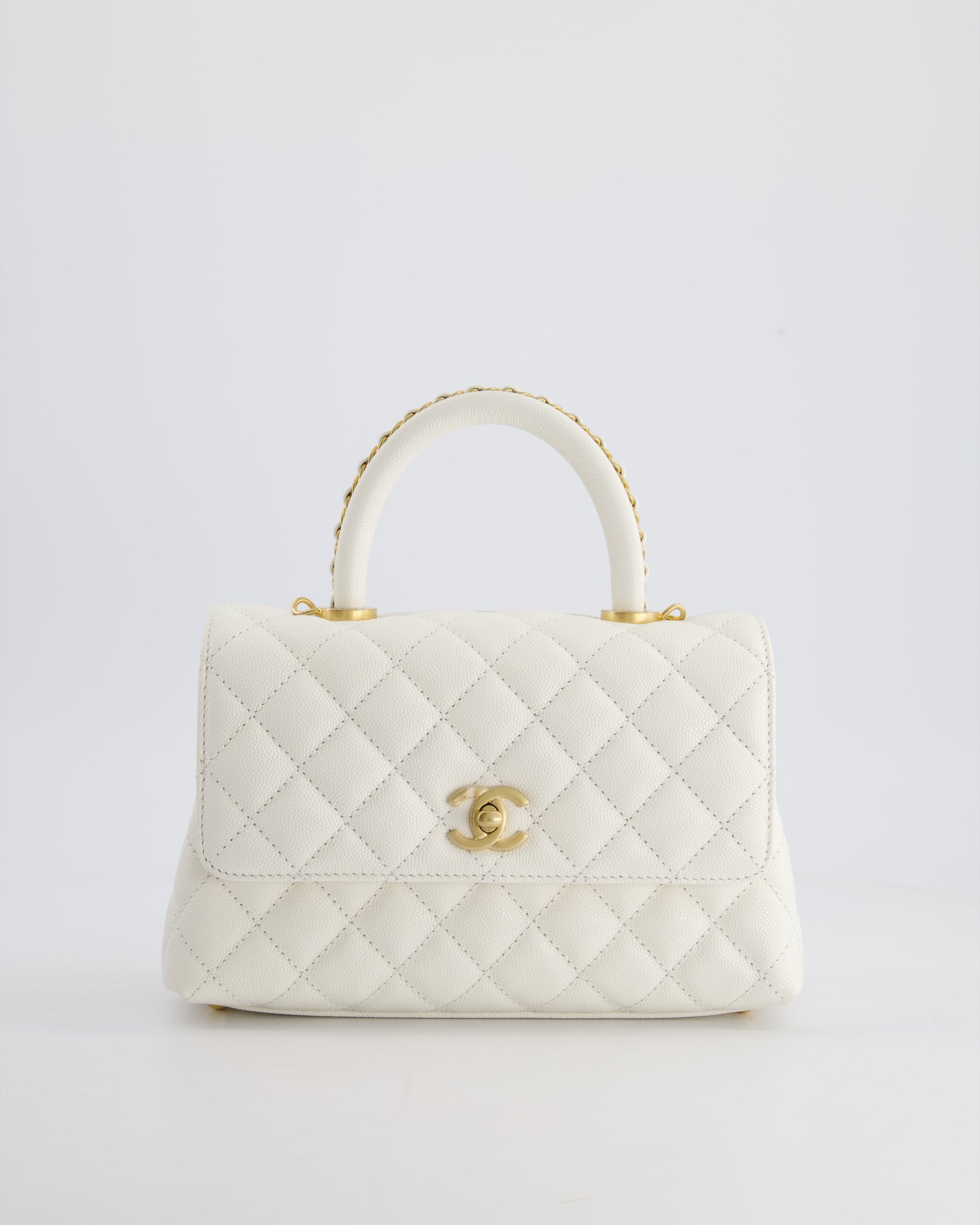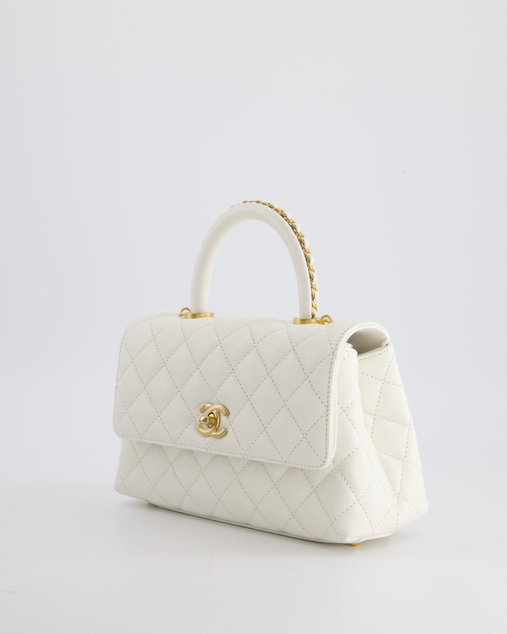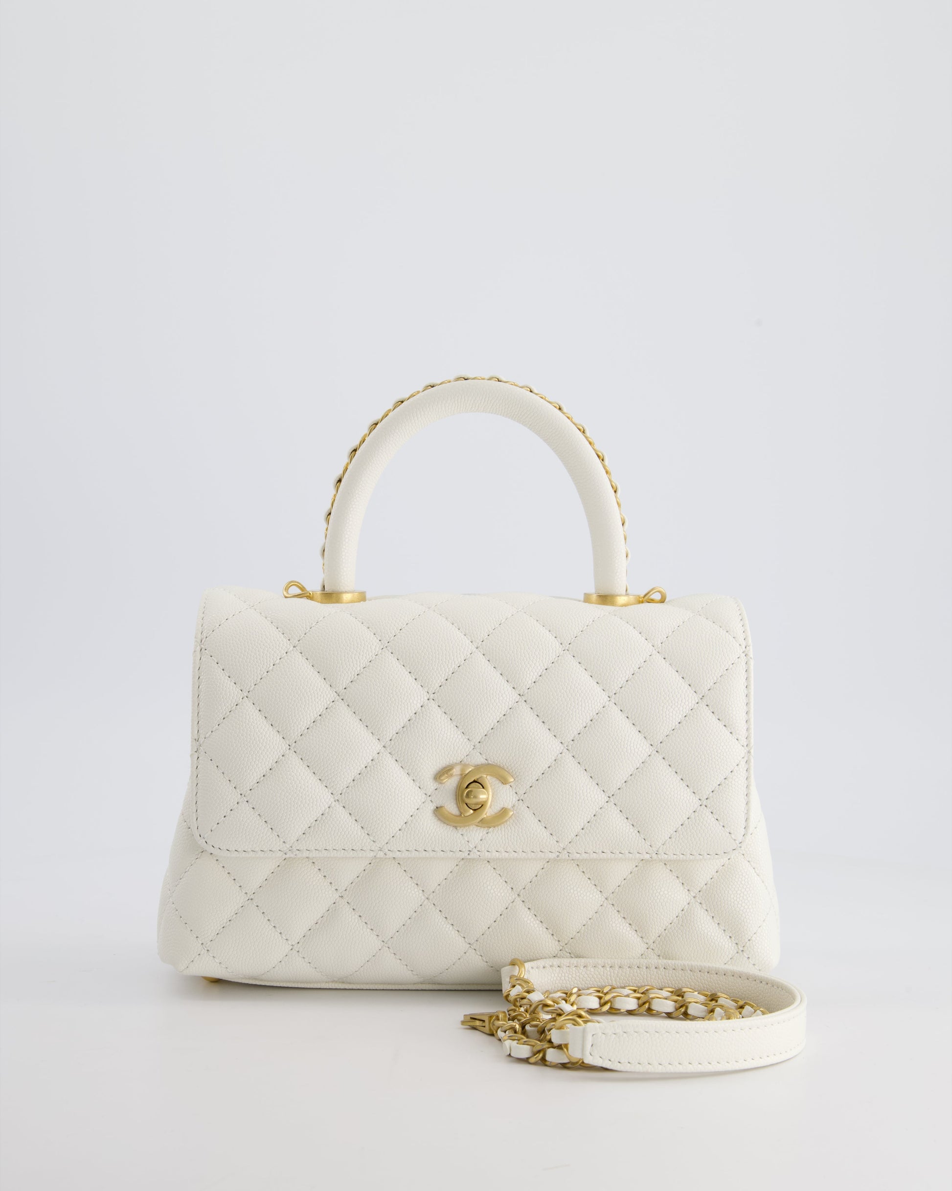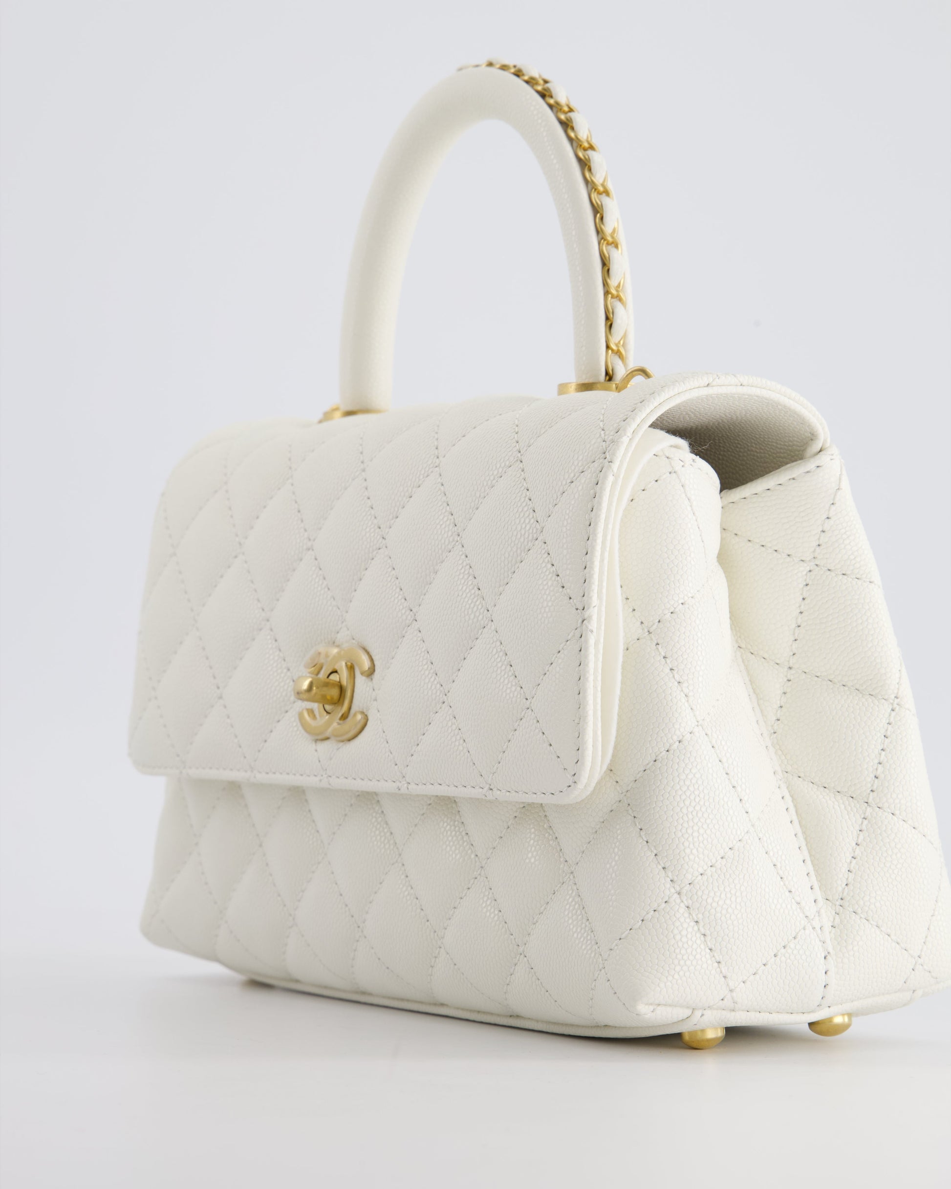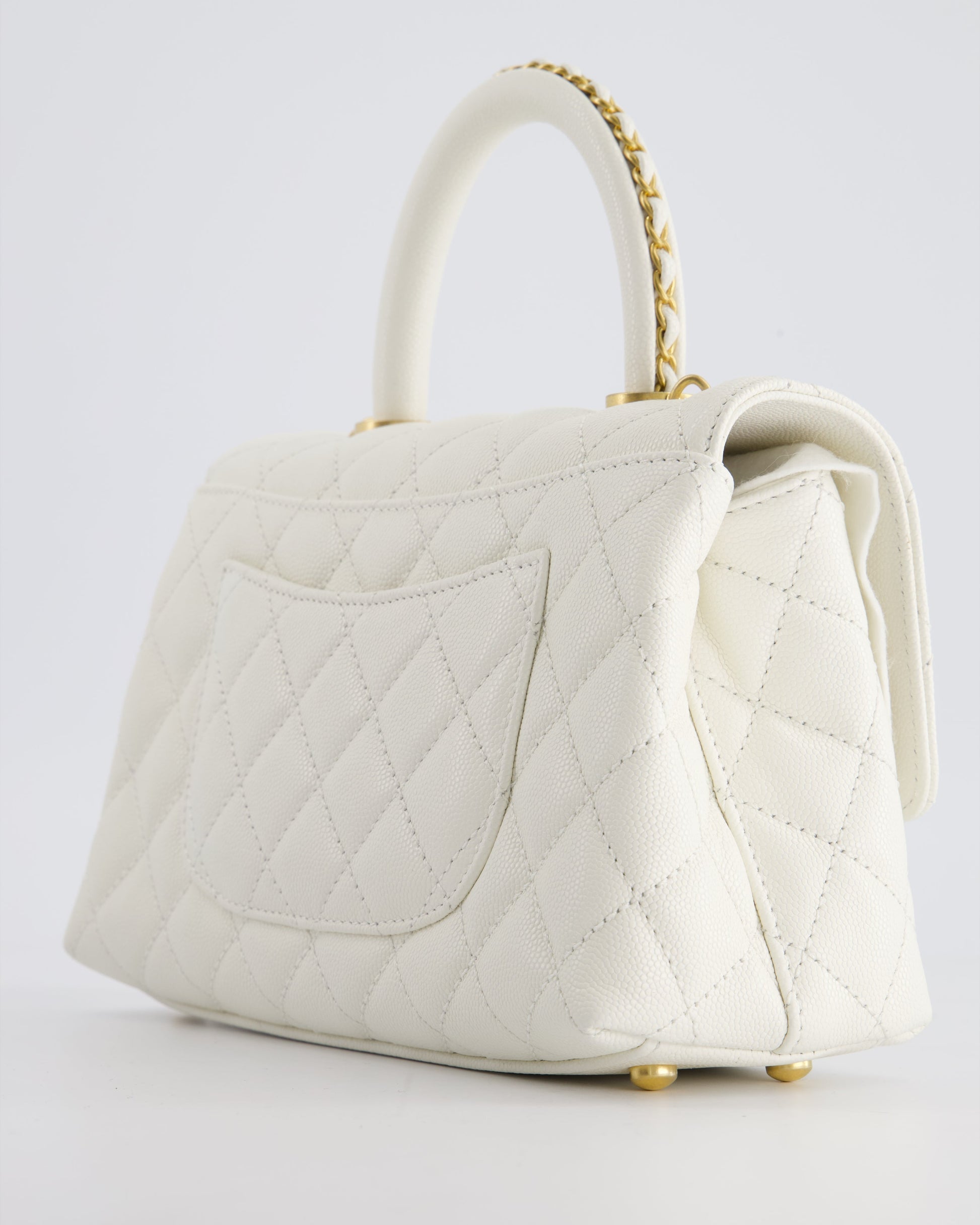 Chanel Small White Caviar Quilted Coco Flap Bag with Brushed Gold Hardware and Chain Detail Handle