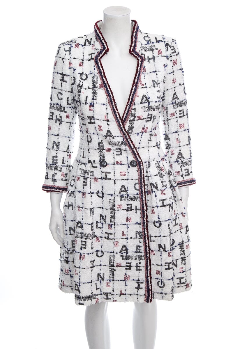 Chanel Spring 2020 White/Red/ Blue Logo Tweed Coat/Dress. This item is in very good condition; some minor discoloring on lining at under arms.