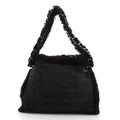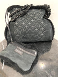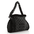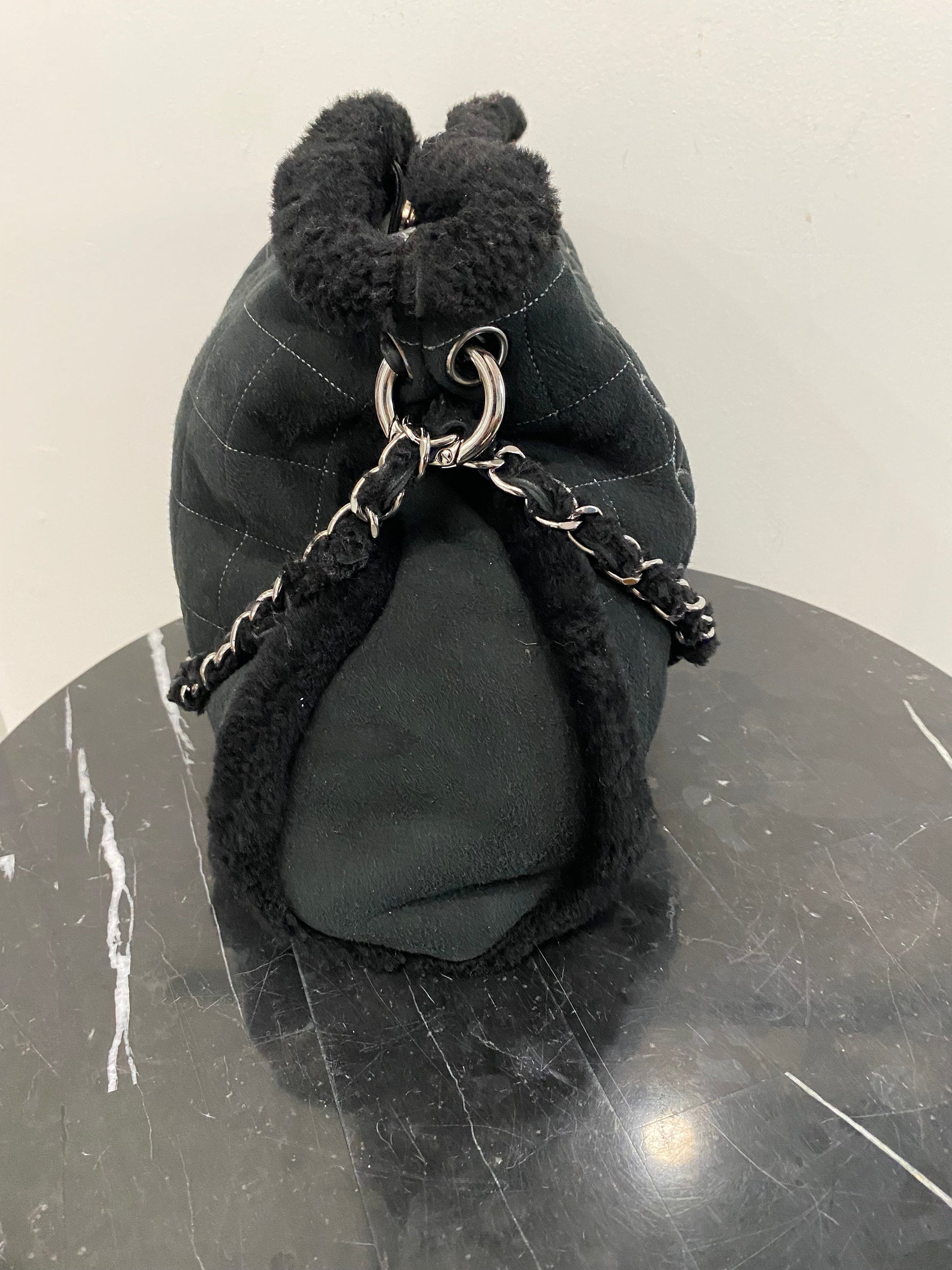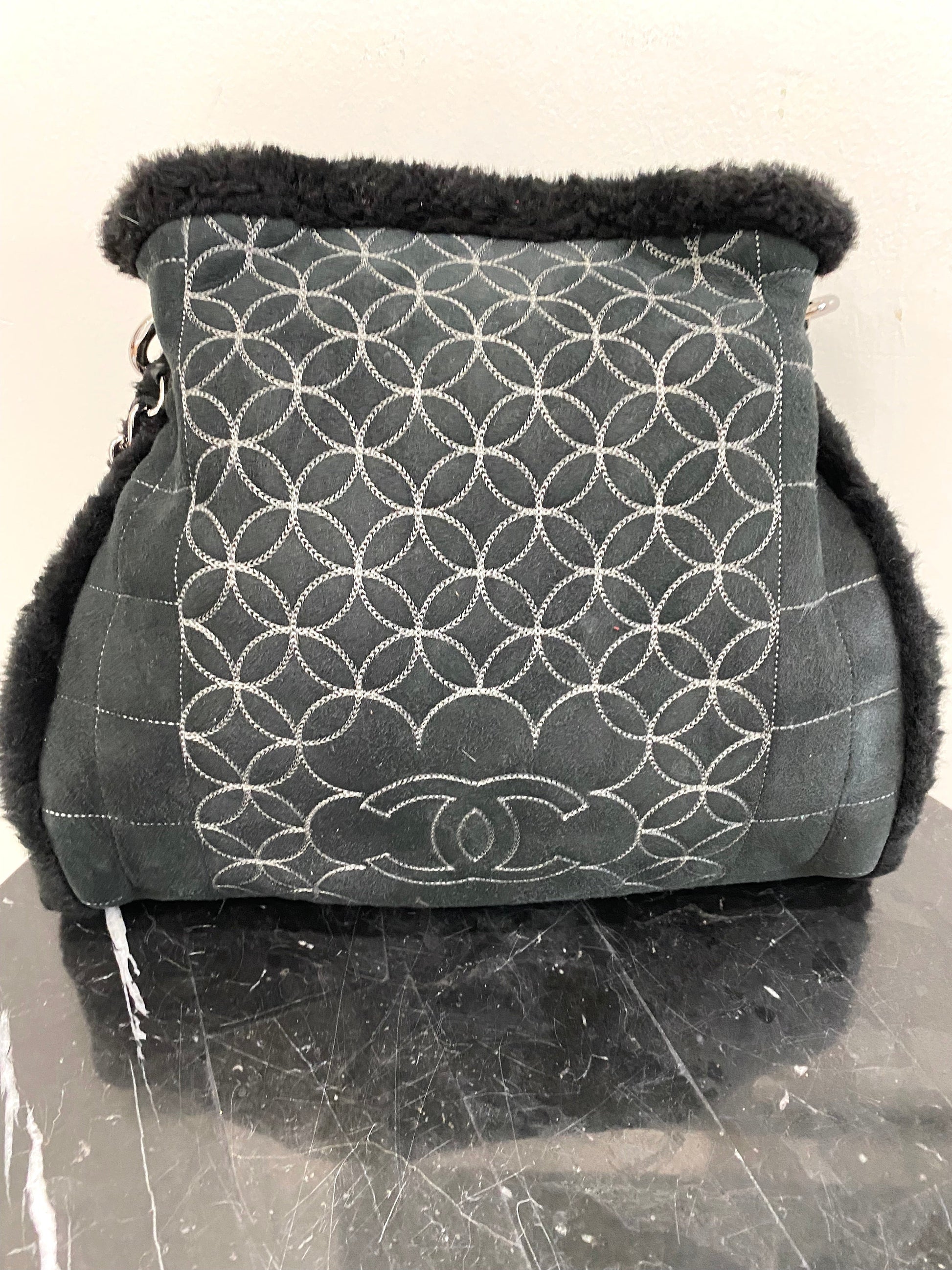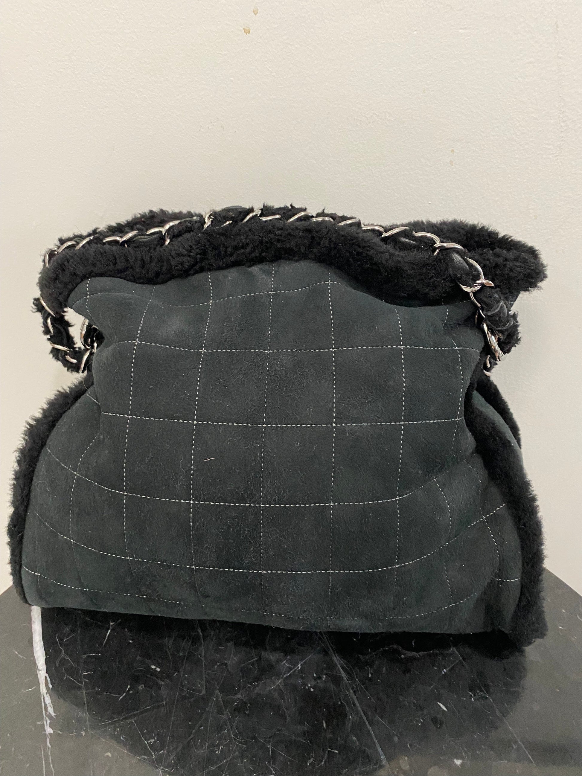 Features a double chain and suede shearling handle, a unique front design with Chanel logo, snap closure, and shiny silver hardware.