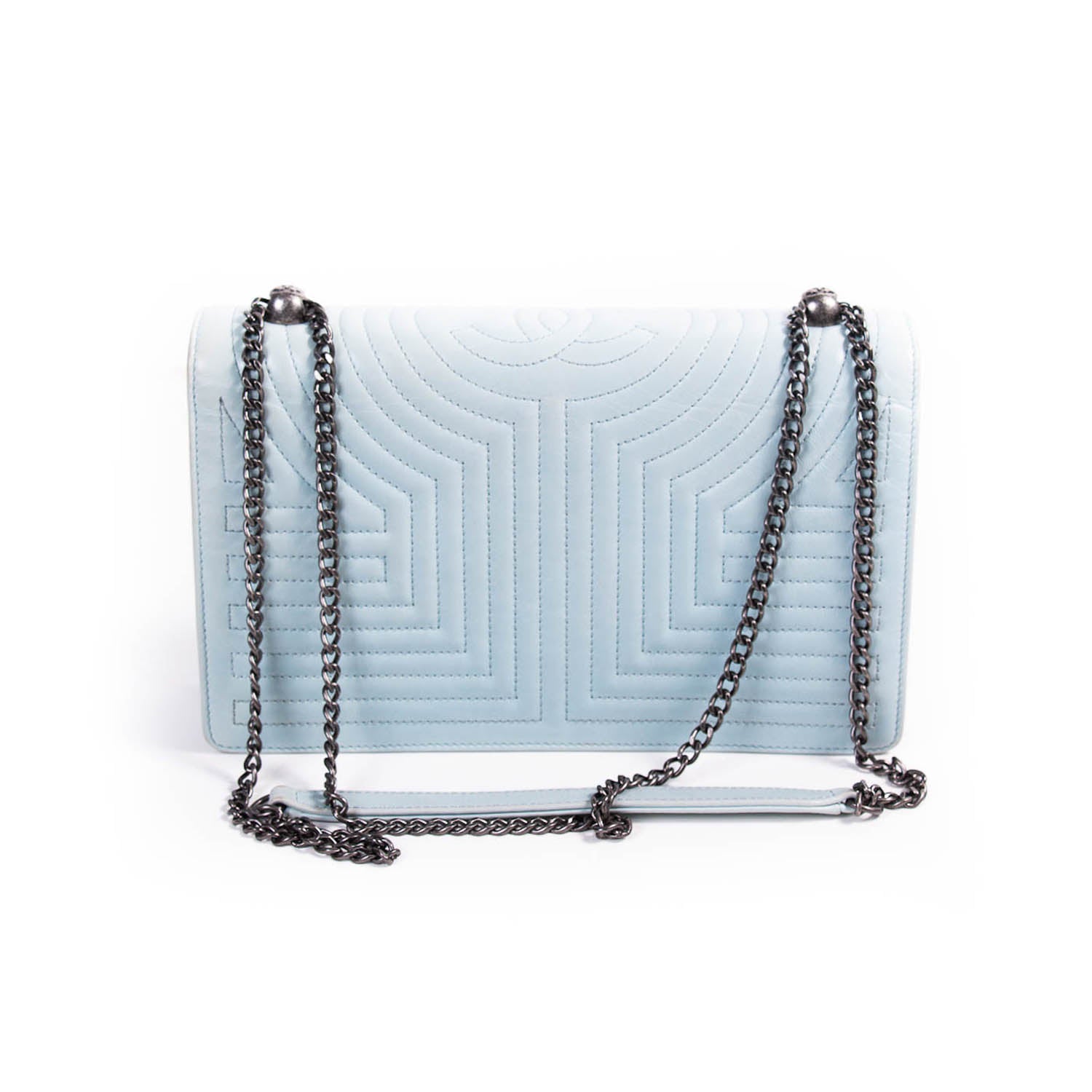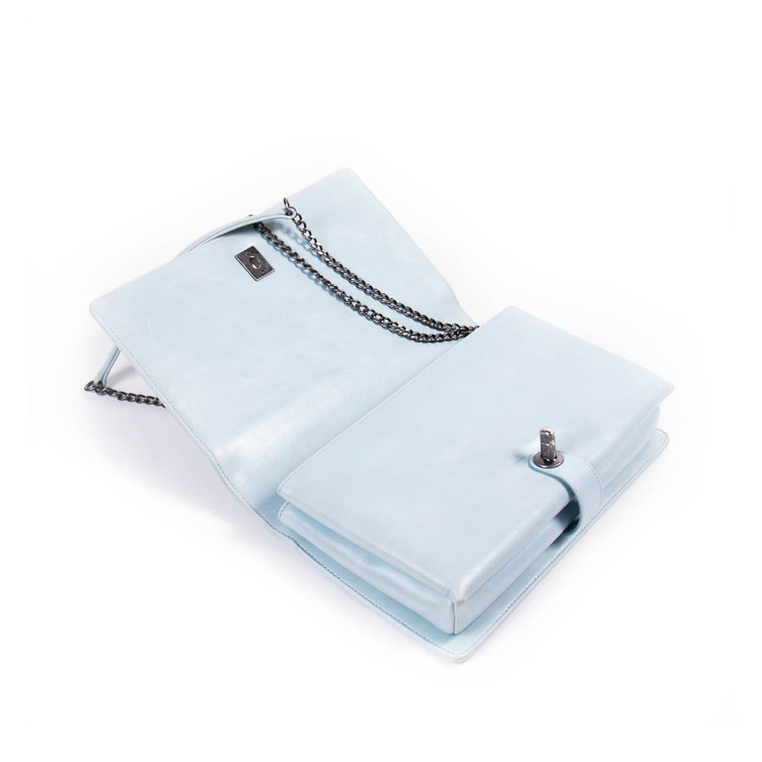 Details: Light Blue Aged Calfskin Leather / Black-Tone Hardware / Chain-Link Shoulder Strap with Leather Pad / Grey Fabric Lining / Dual Compartments with Zipper Pocket at Inside / Turn Lock Closure at Front Flap.