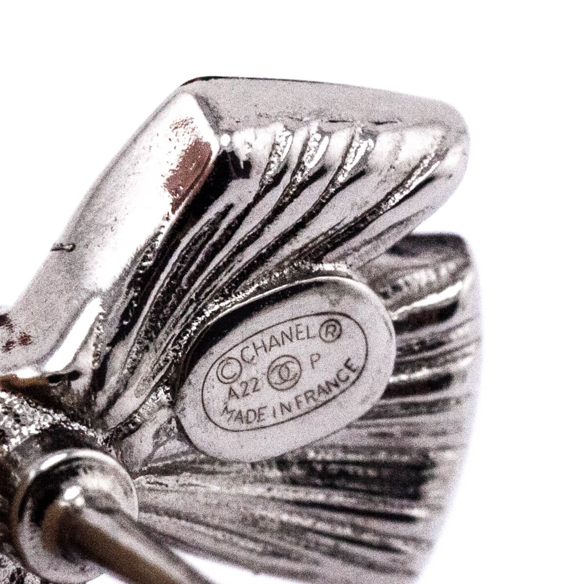 These Chanel Bow Drop Earrings provide a playful approach to the bow trend, utilizing the shape along the silver-tone hardware-crafted silhouette. Each French-made bow earring is adorned with miniature strass stones and presents a small white faux pearl along the center. A miniature CC logo suspends from the bow, and is also embellished with matching strass stones for added glamour. Use the post-back closures for a secure fit. Pair these Chanel earrings with a high ponytail, a glossy lip, and the Chanel Black Quilted Lambskin Chocolate Bar Camellia No. 5 Pochette to show off!