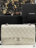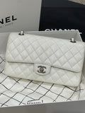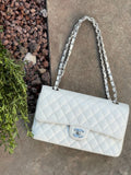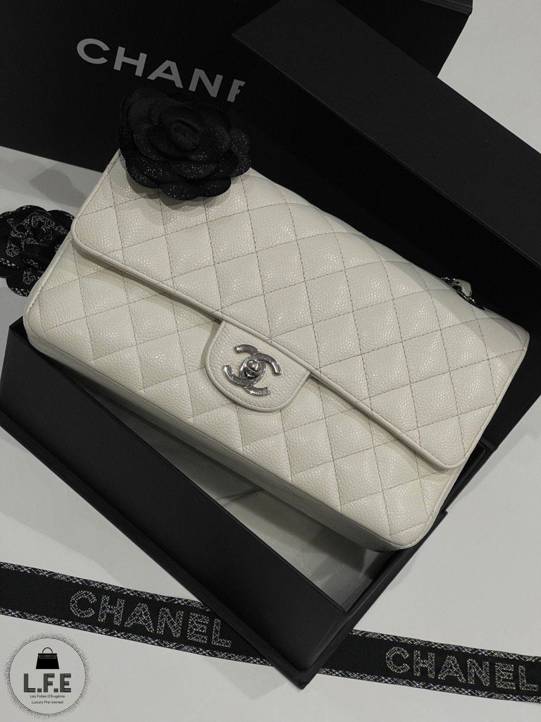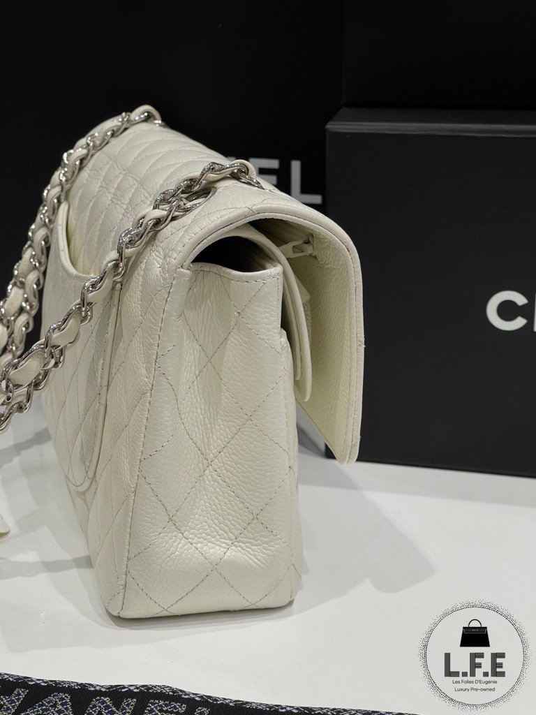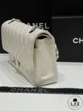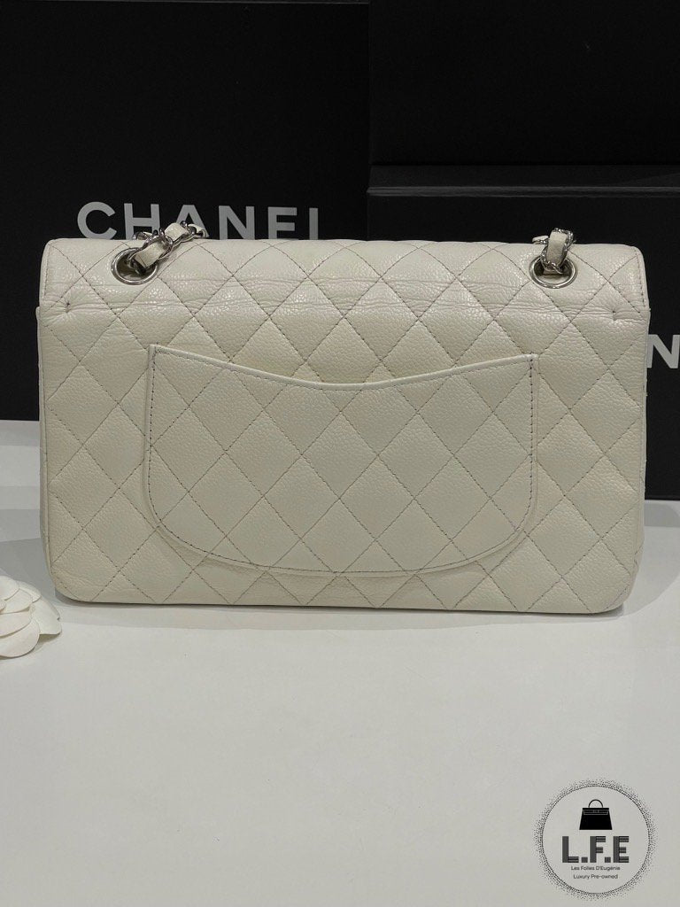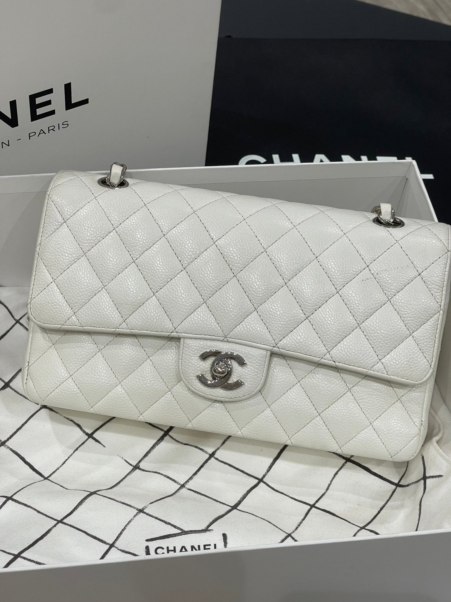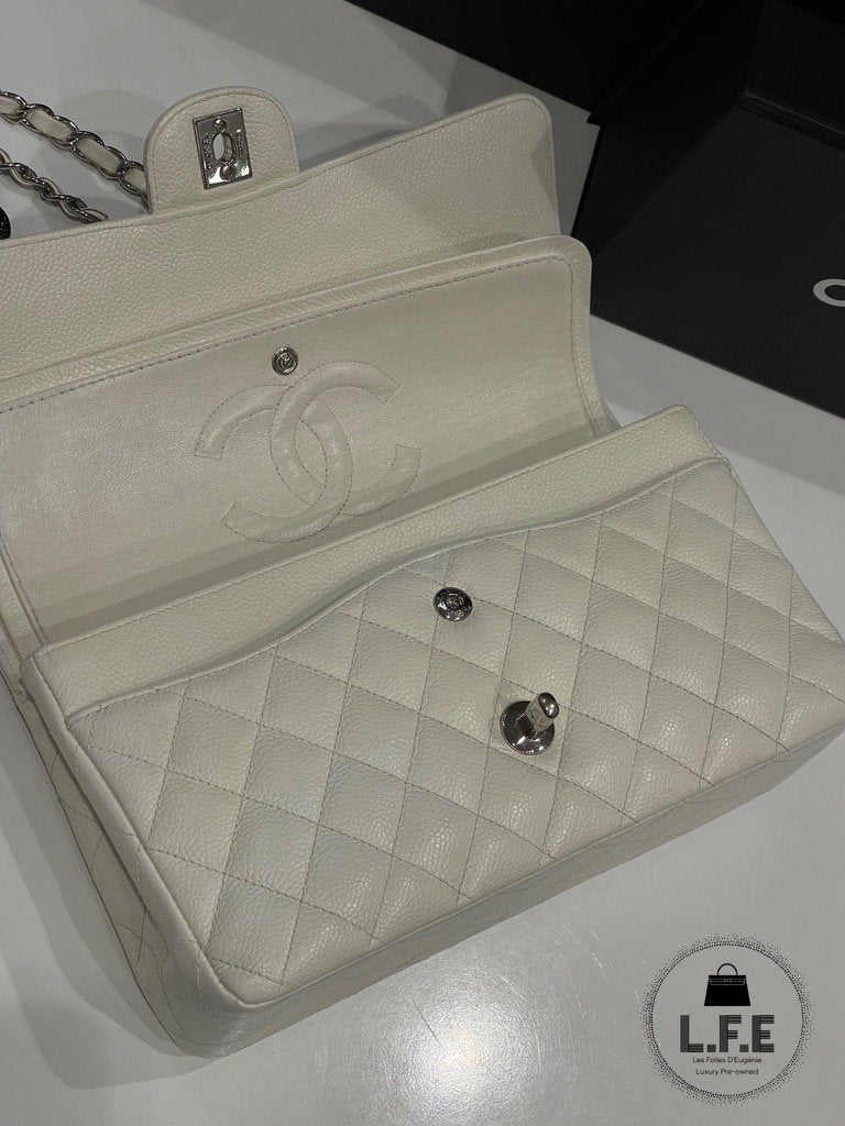 Timeless 25 de la maison Chanel en cuir caviar blanc. Très difficile à trouver dans ce coloris produit en 2006 il est en superbe état. Profiter de son look elegant croisière pour ravir vos tenues. Ayant encore augmenté pour la énième fois cette année au sein de la maison mère ce sac est un réel investissement sur le long terme. Il ne tardera pas à devenir aussi désirable que le Kelly ou le Birkin dans les prochaines années. Ici présenté dans sa version la plus classique et la plus demandée avec le double rabat.