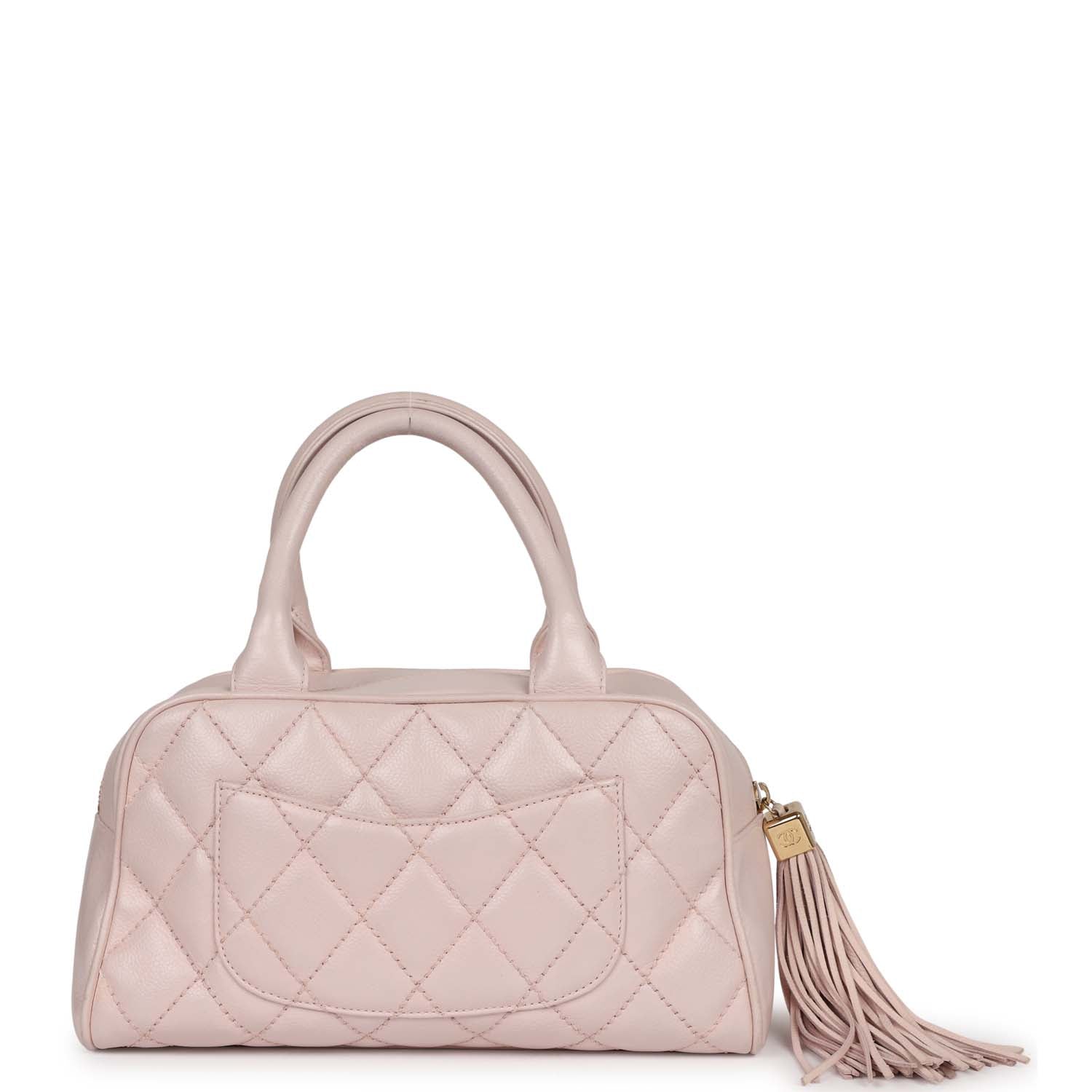 This Timeless Bowler bag is in light pink caviar with gold hardware, has tonal stitching, large CC applique on front, tassel zip closure, and half moon exterior pocket.