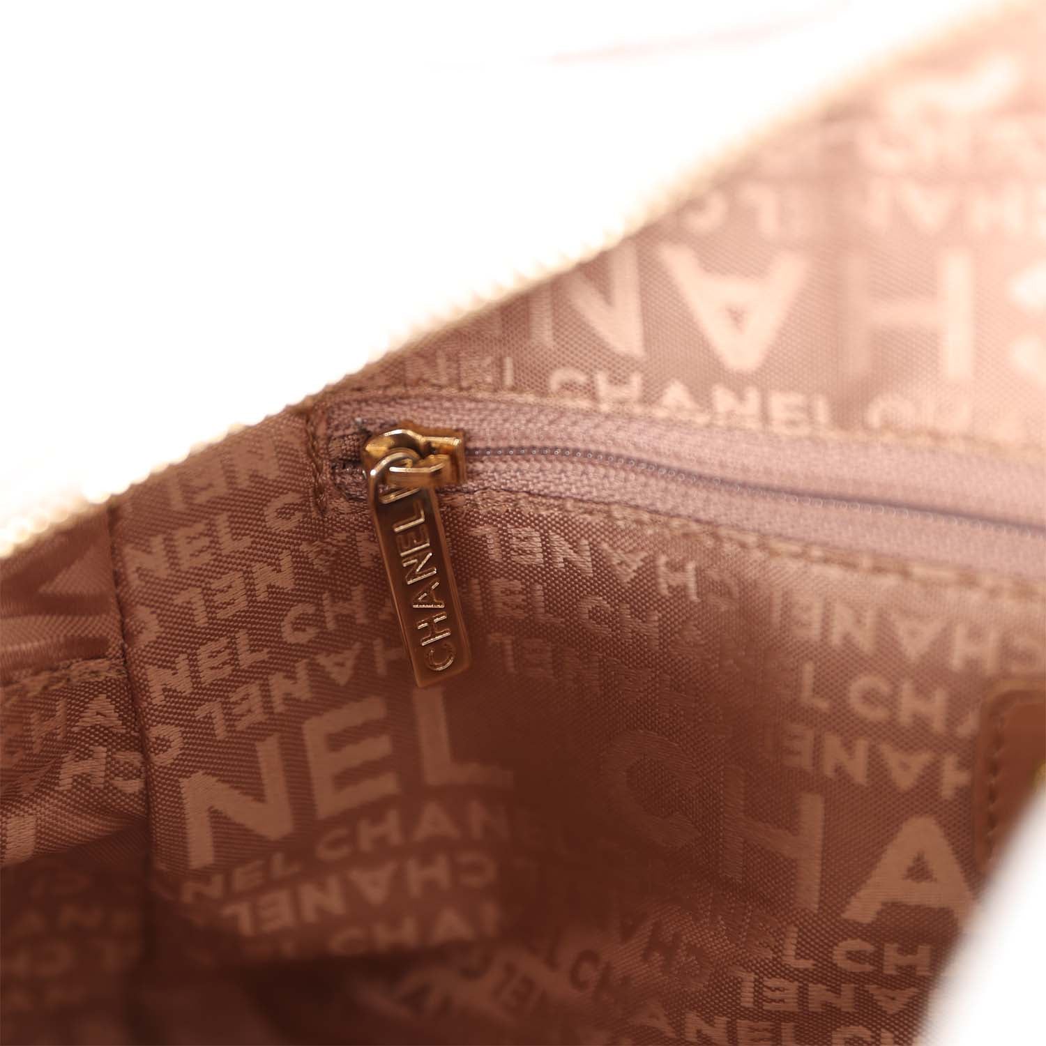 The interior is lined in pink chanel logo nylon and includes one zip pocket with logo pull on the rear wall.