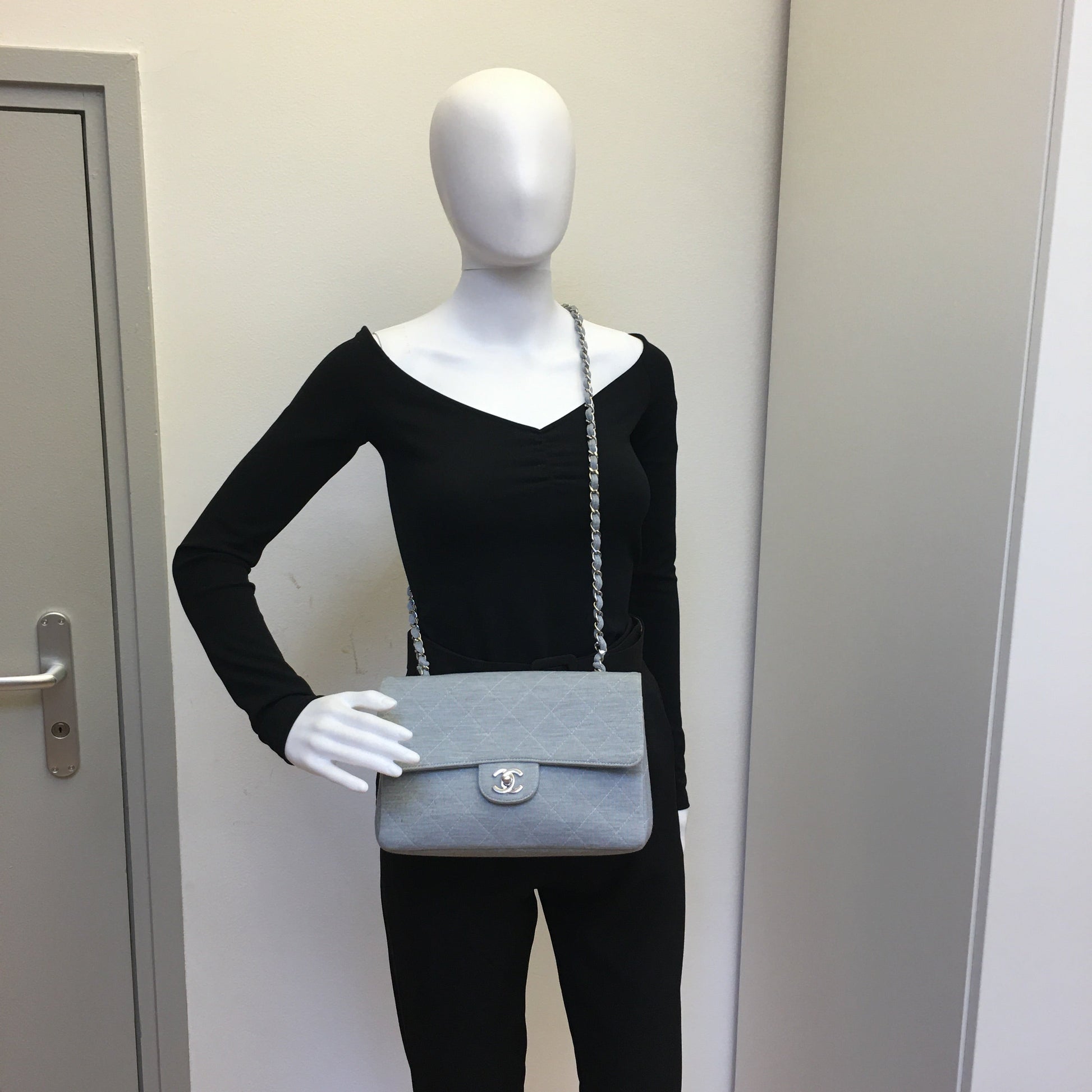 This very chic shoulder bag is beautifully crafted of light Blue denim