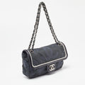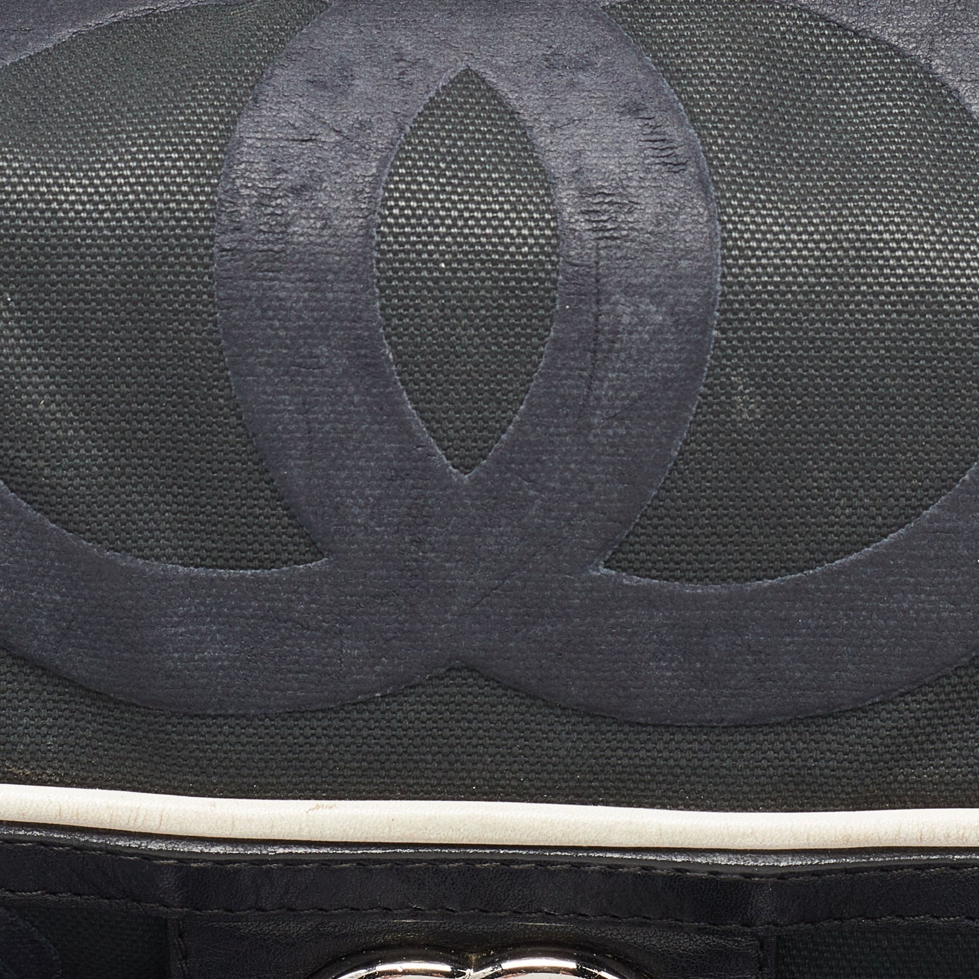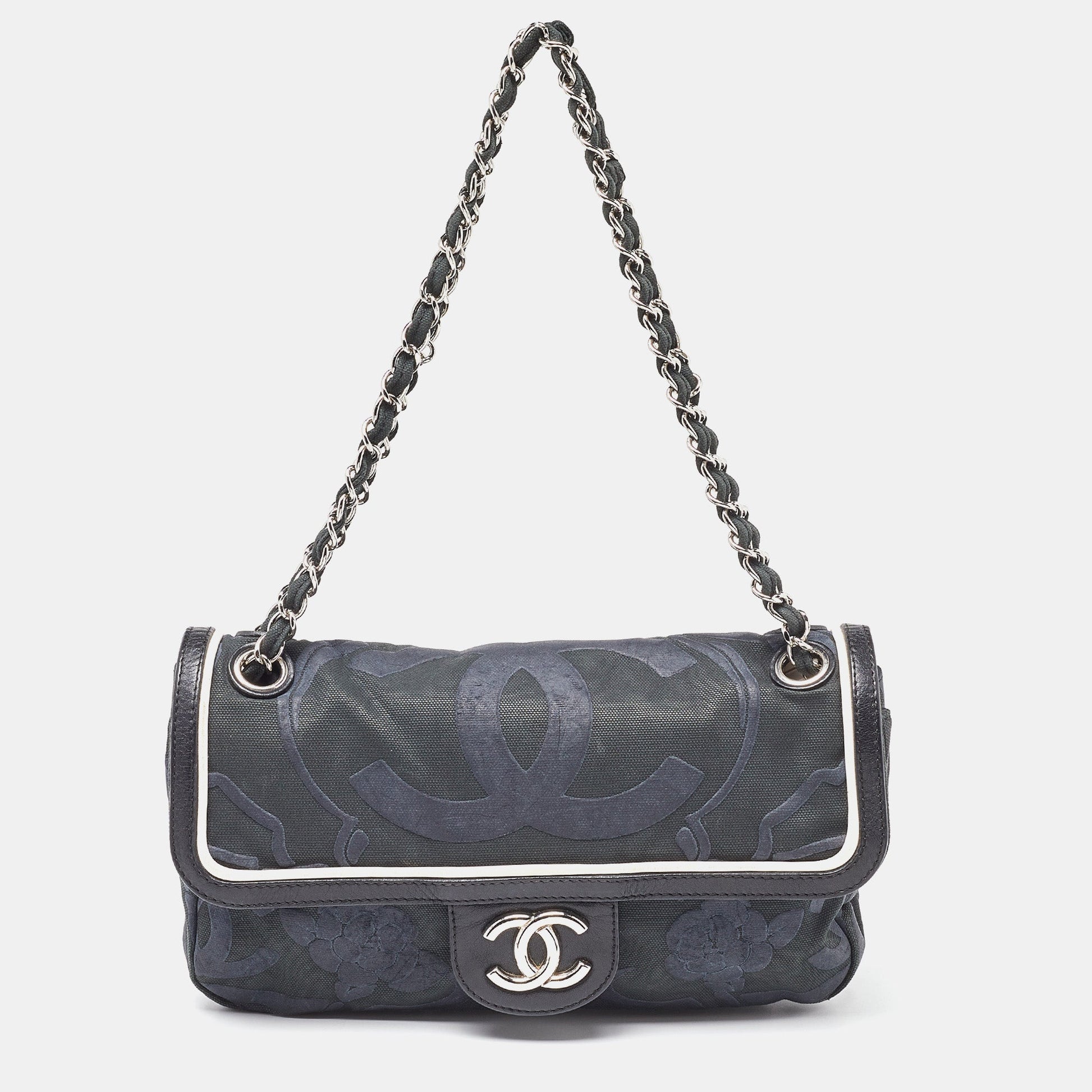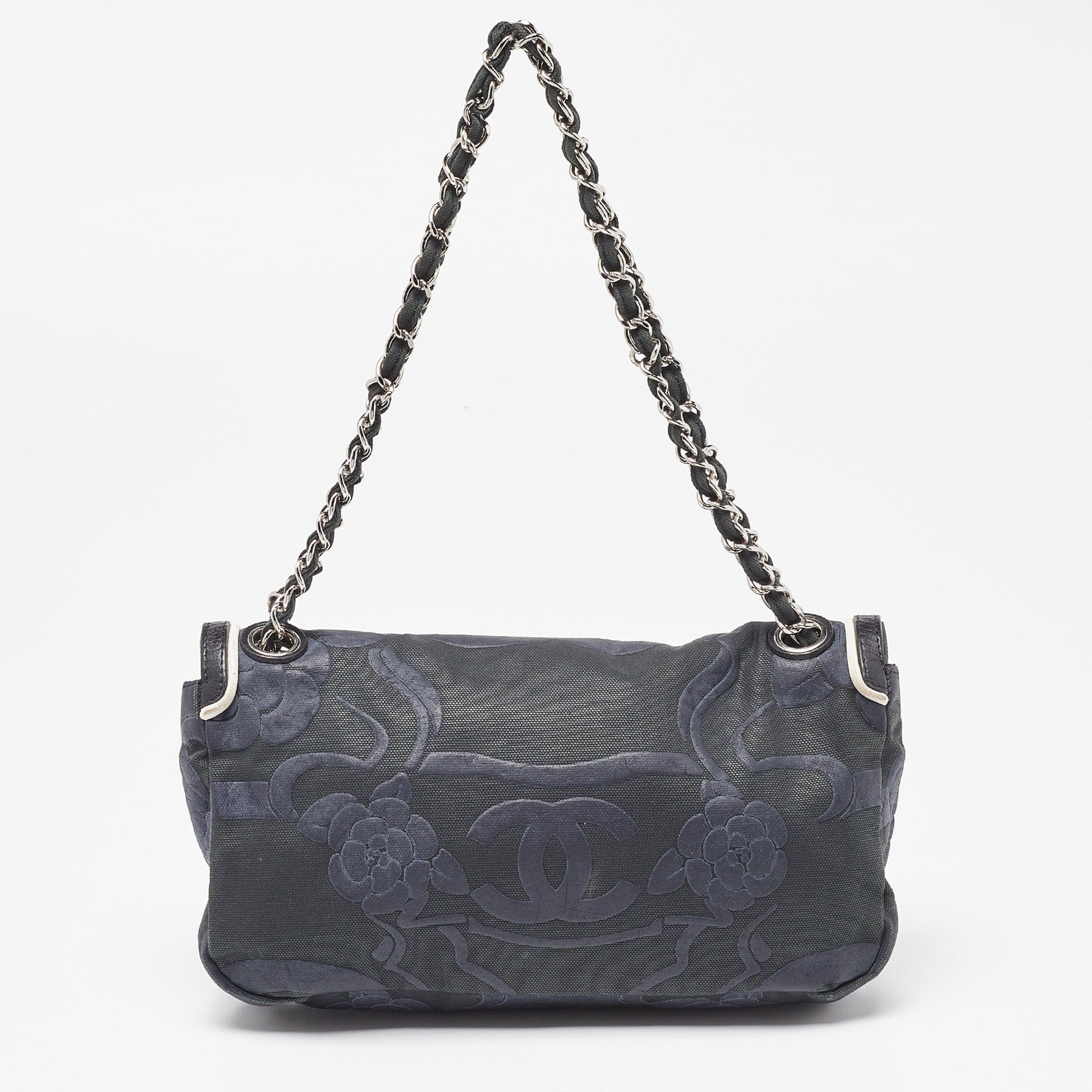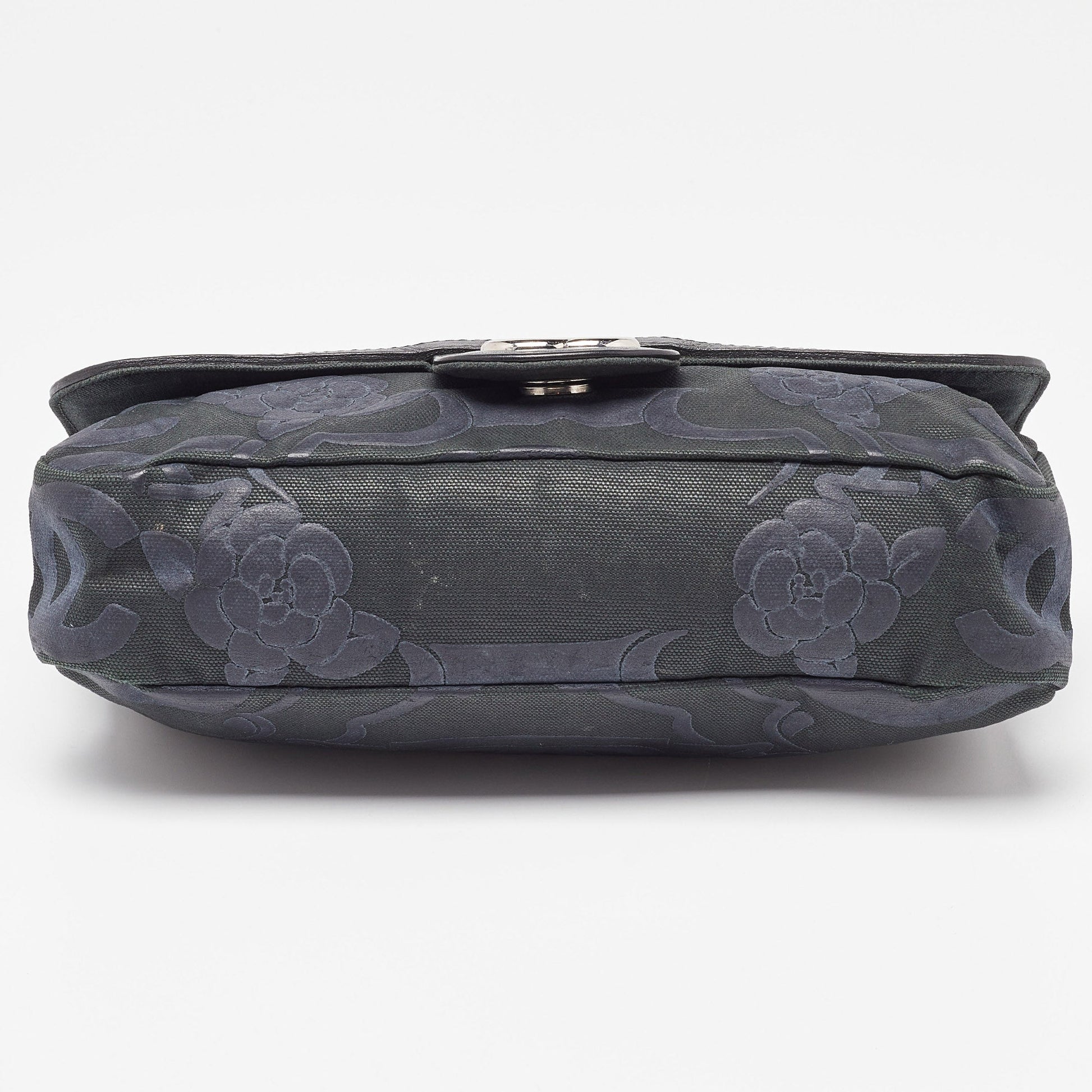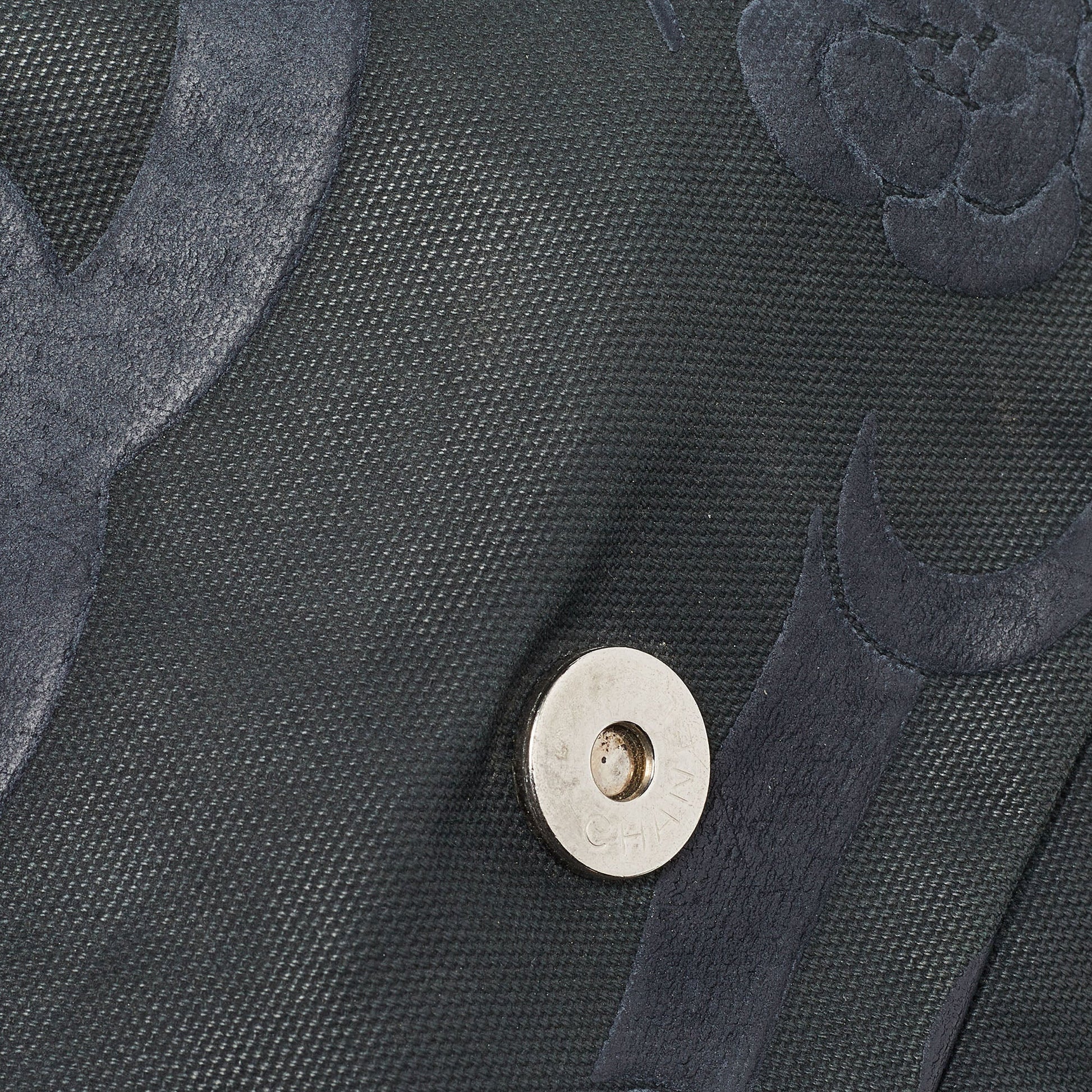 CHANEL Tri Color CC Logo Camellia Embossed Canvas and Leather East West Flap Bag
