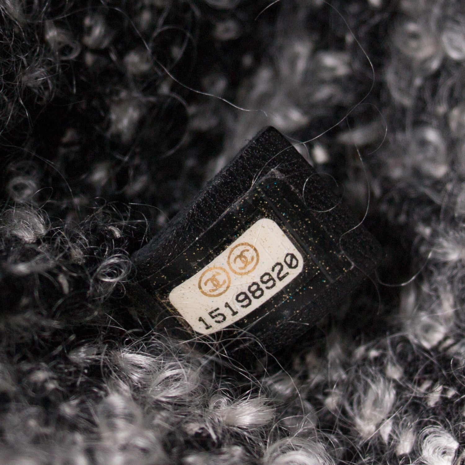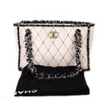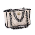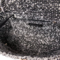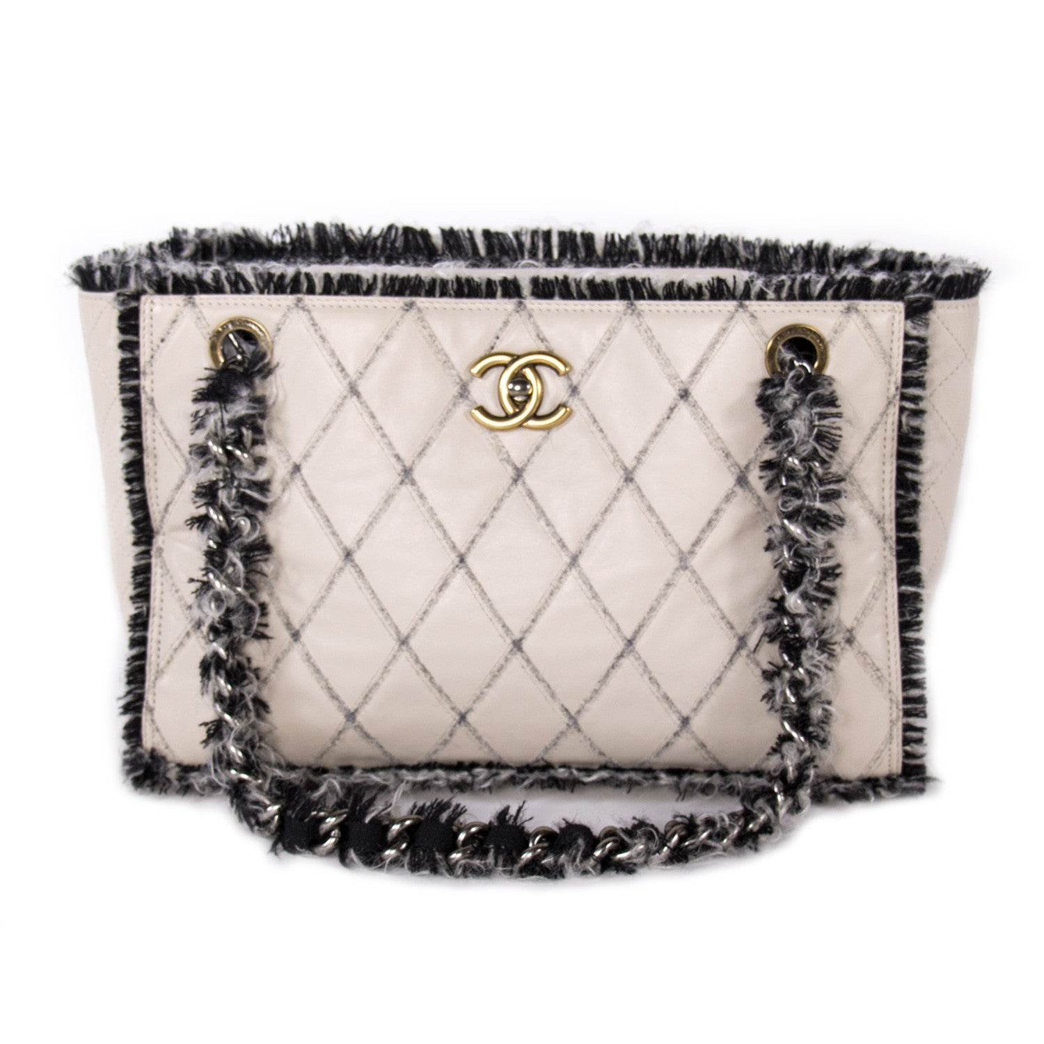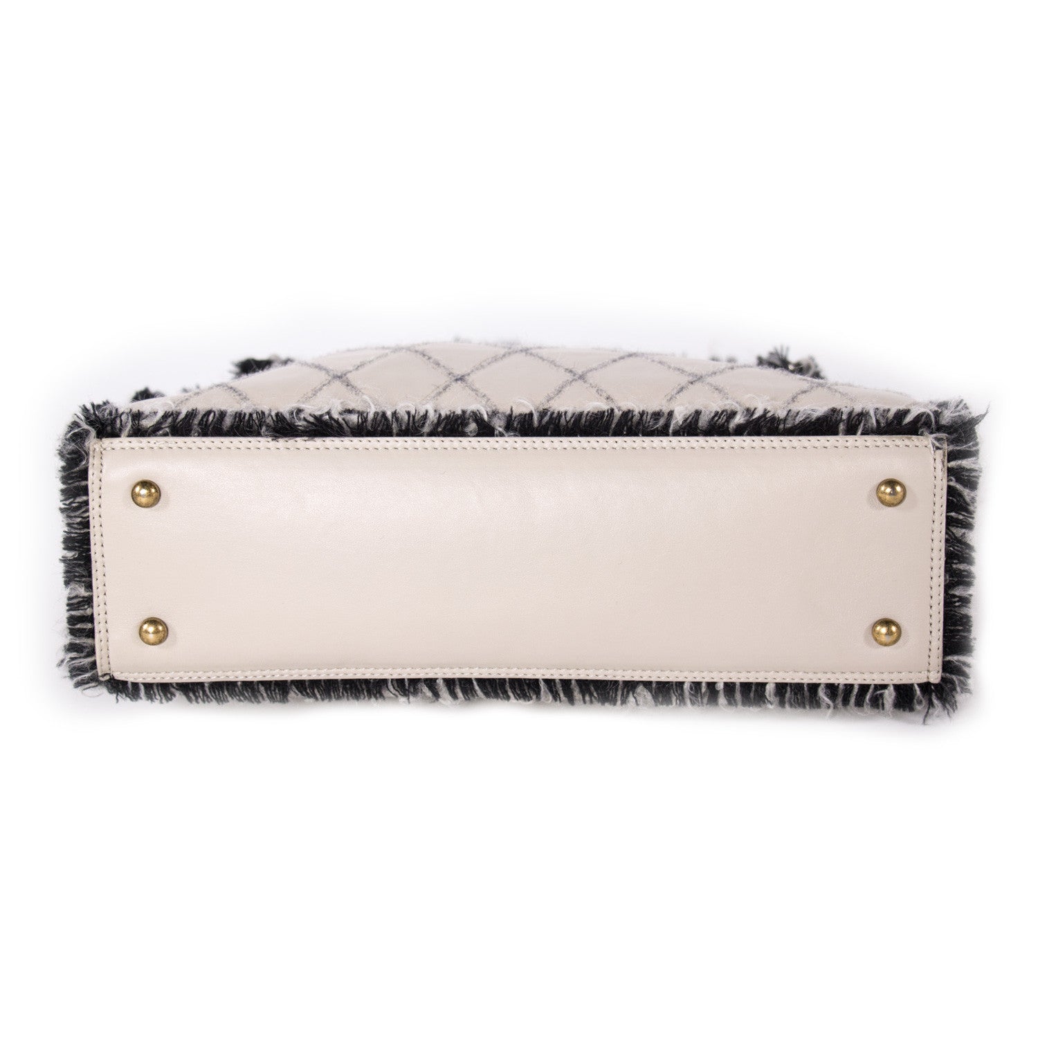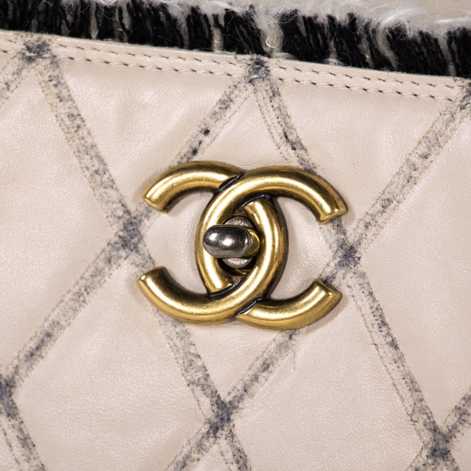 Details: Beige Quilted Leather / Antique Gold Hardware / Dual Chain-Link Tweed Shoulder Strap / Black and Ivory Tweed Trim at Front and Back / Black and White Tweed Lining / Single Compartment / Zip Pocket At Wall / Turn-Lock Closure at Front Fold-In Flap