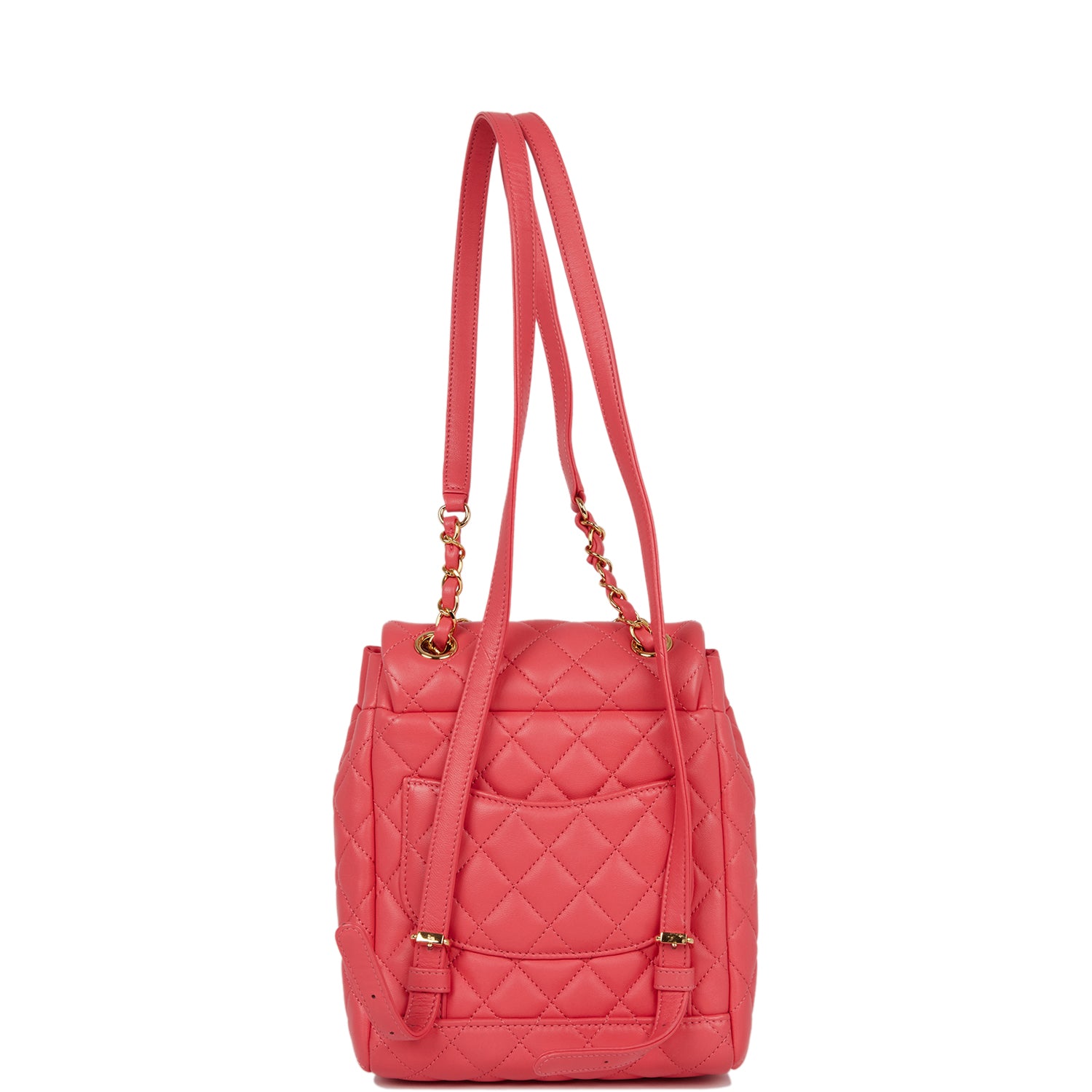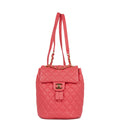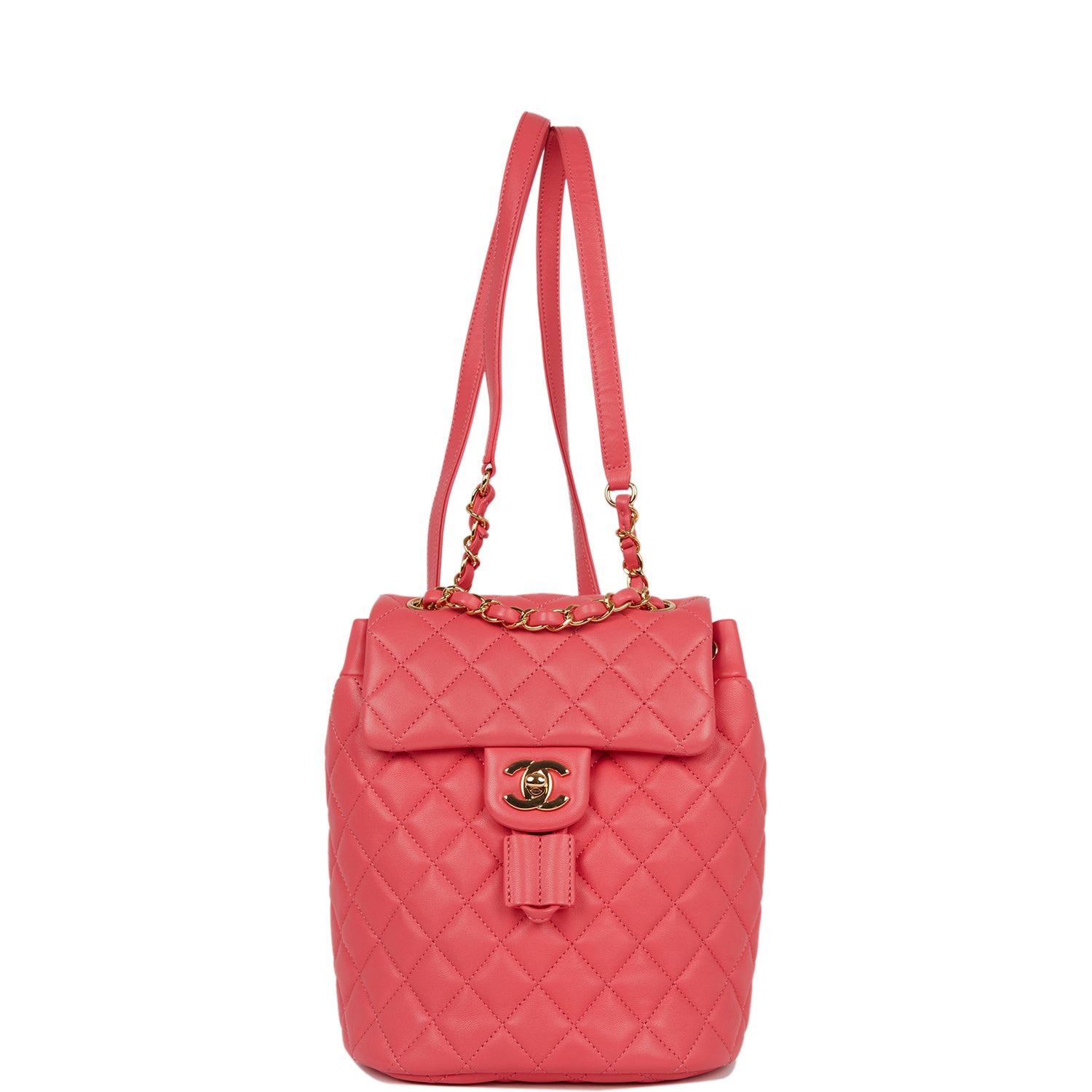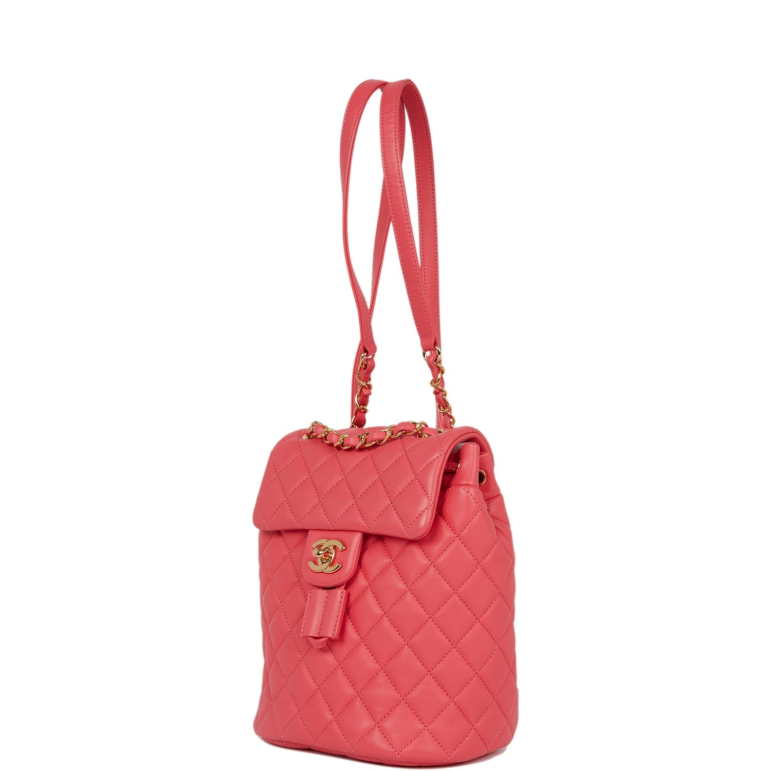 This Urban Spirit backpack is of rose pink lambskin leather with gold tone hardware and has a front flap with signature CC logo, rear slip pocket, single interwoven rose leather and gold tone chain link top handle and adjustable straps.