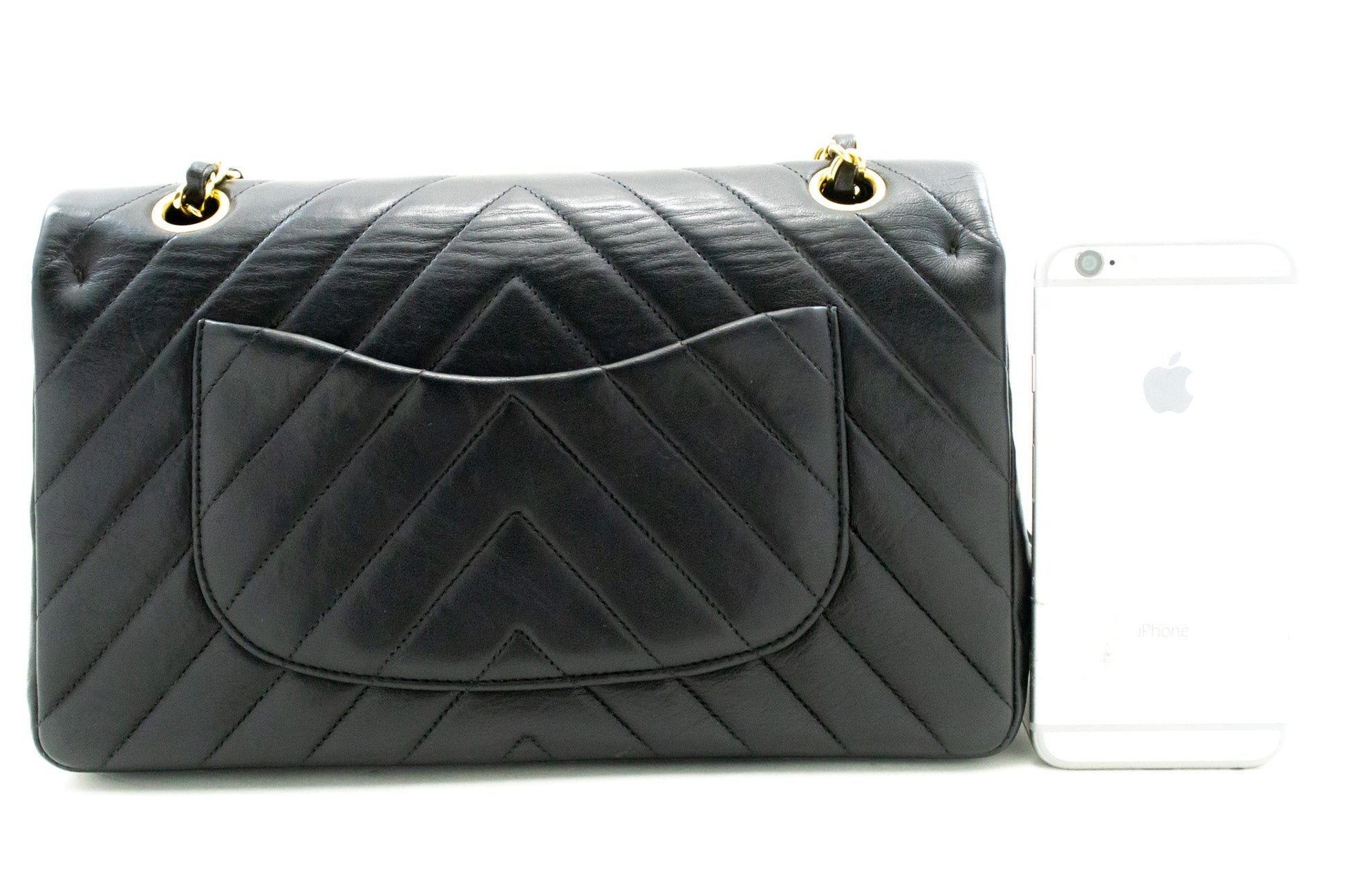 An CHANEL V-Stitch Double Flap 10" Chain Shoulder Bag Black made of black Lambskin.