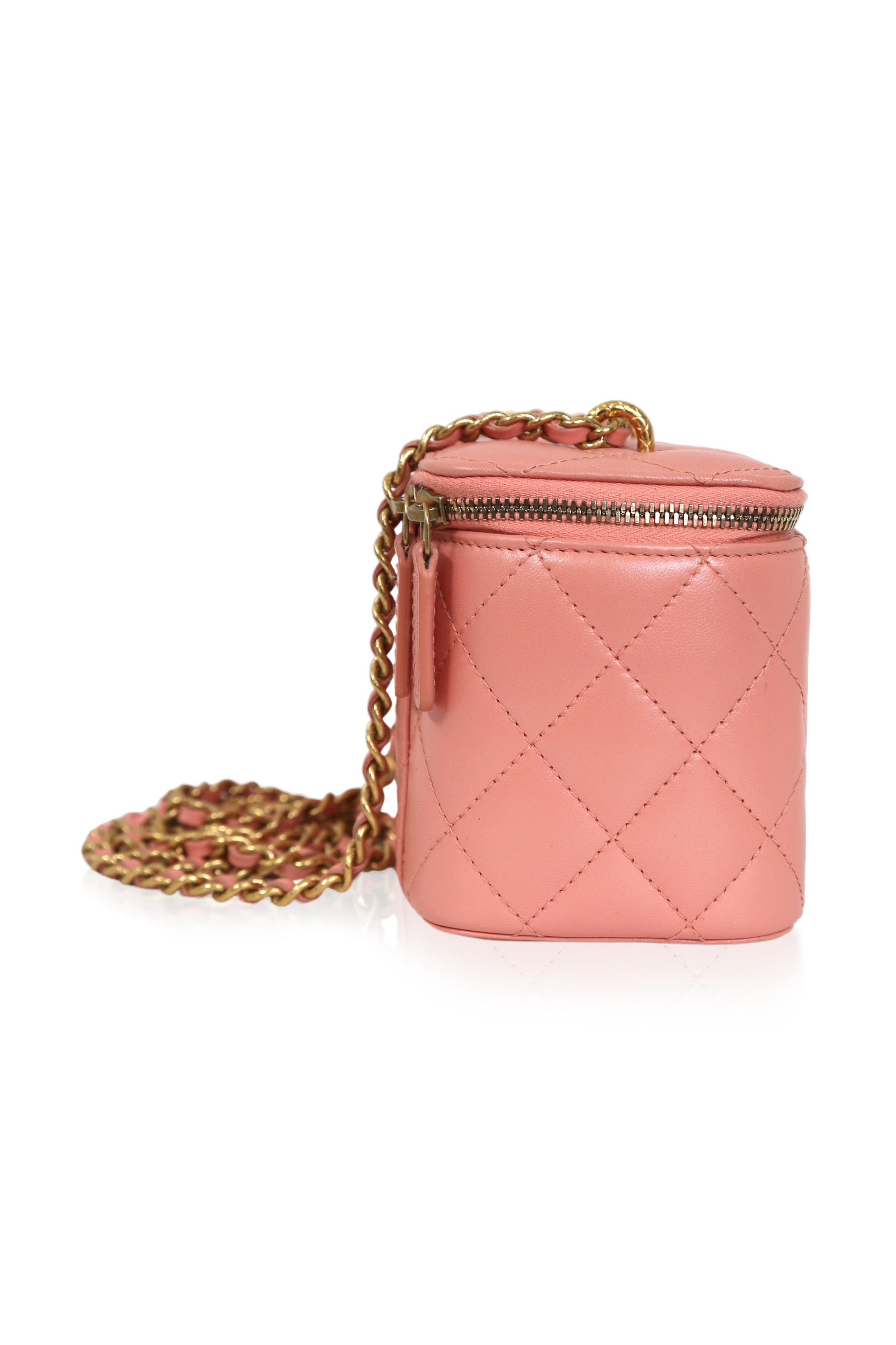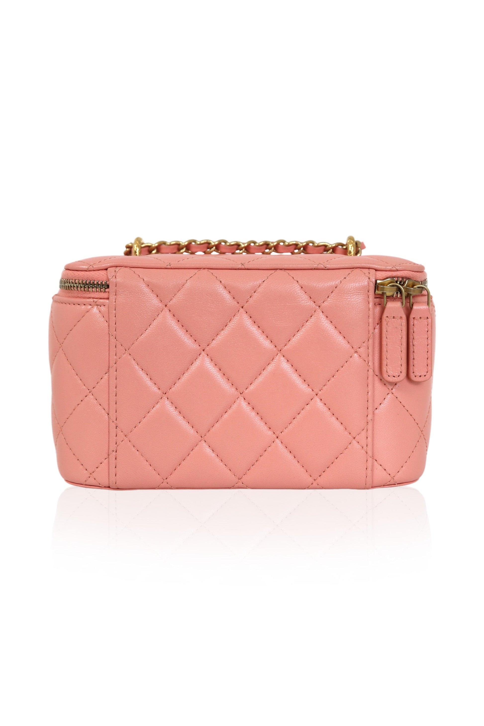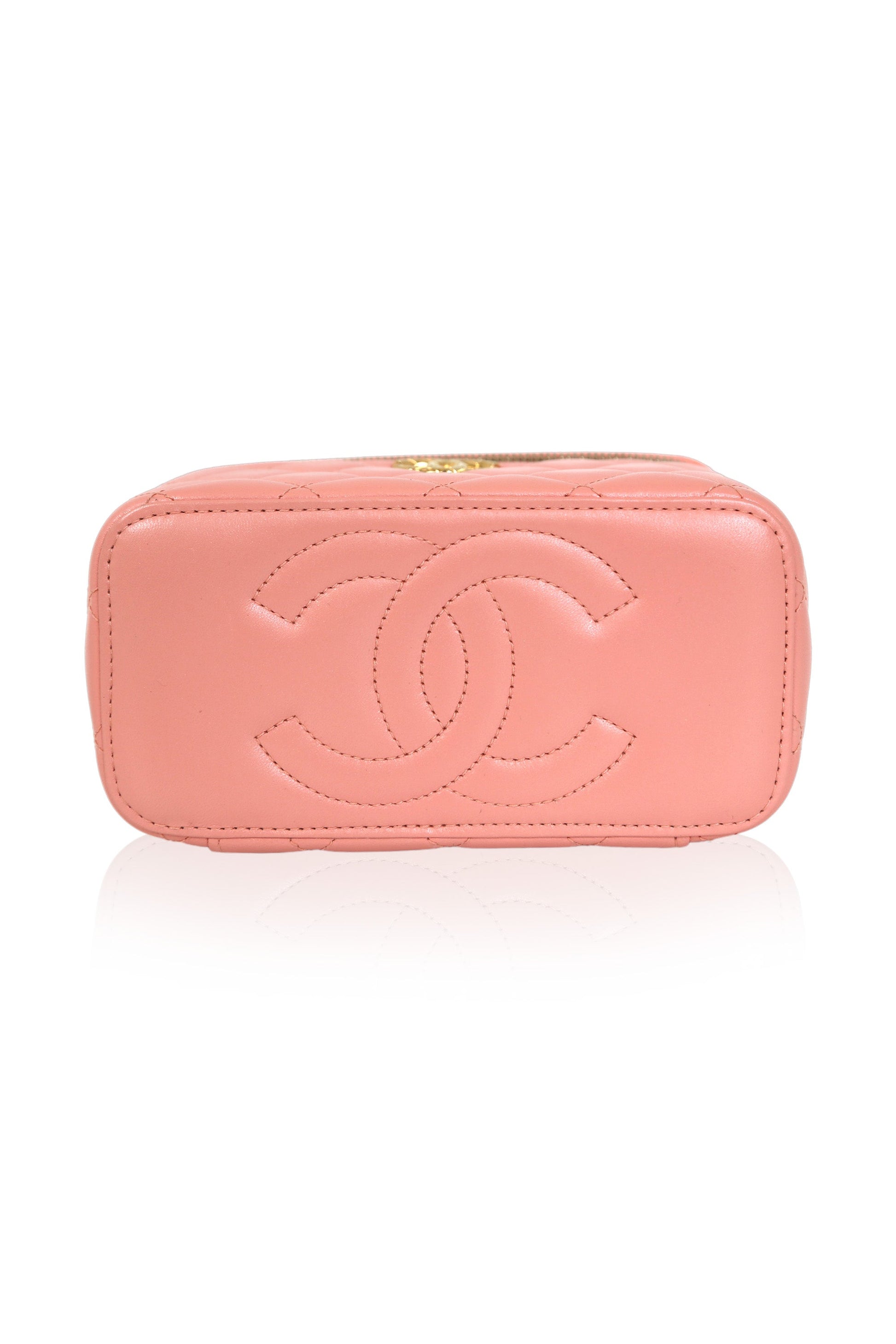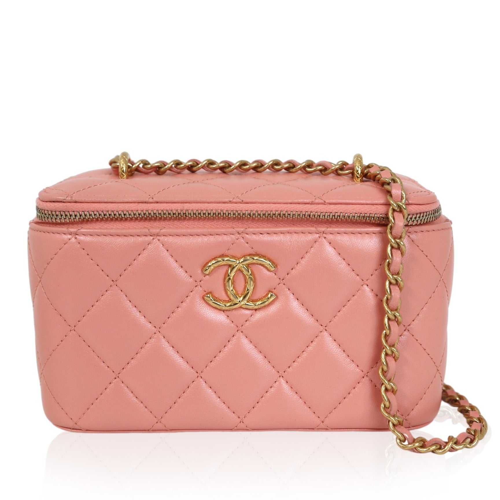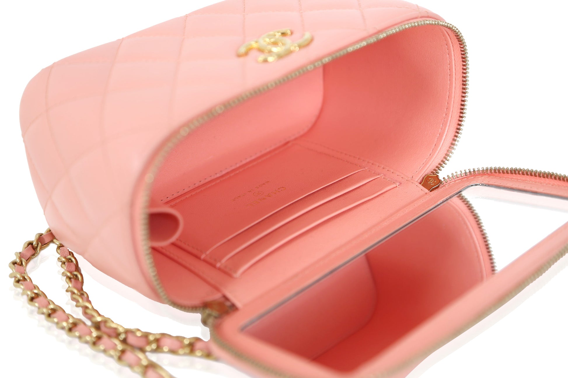 Quilted-grained pink leather Gold-tone hardware Interior mirror? Interior card pockets ? Includes original Chanel dust bag ? Excellent condition with few signs of wear