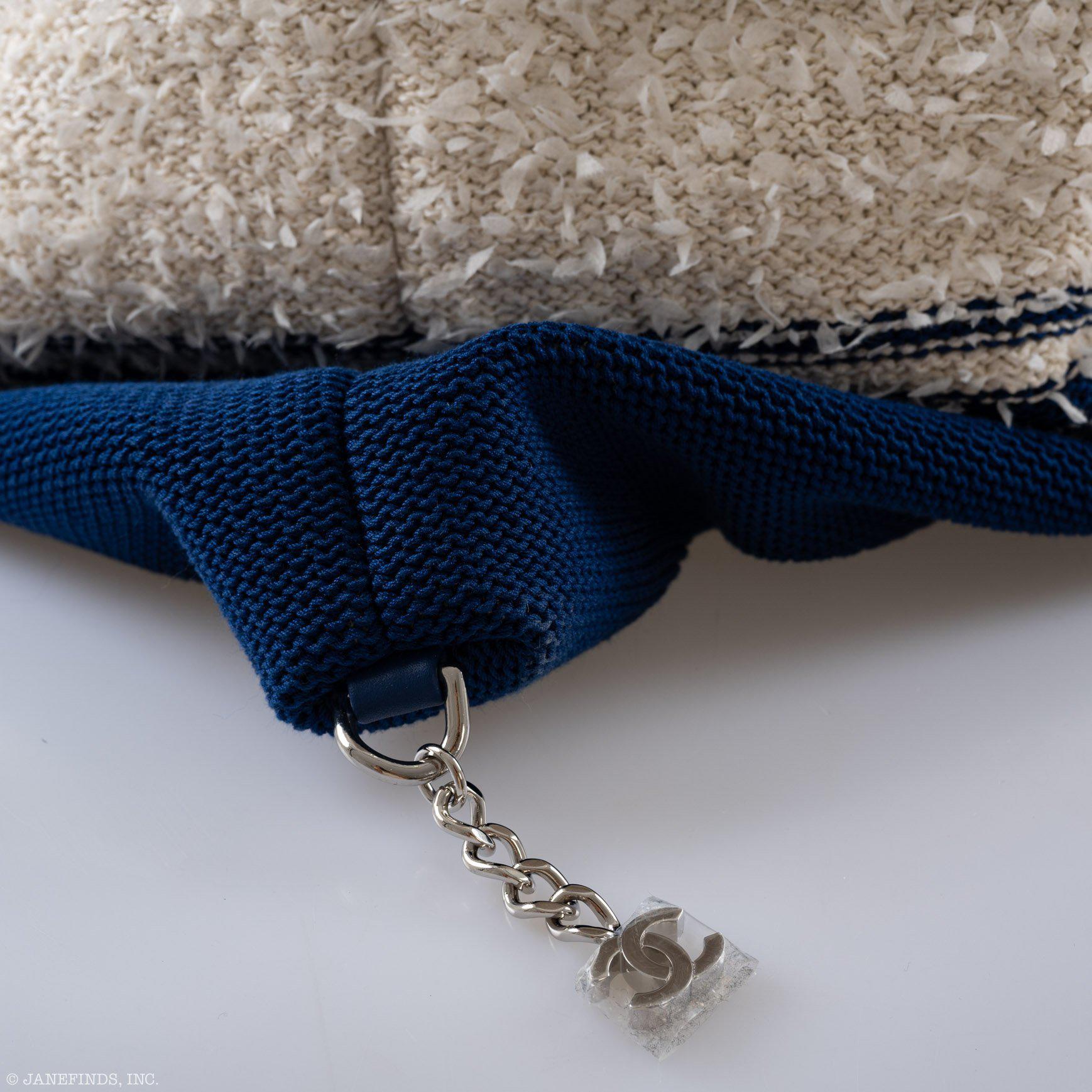 This Chanel Venise Biarritz CC Tote, crafted in a chic white and navy terricloth canvas, is a stylish and functional accessory that embodies the essence of casual luxury. This tote, with its spacious and practical design, makes a statement of effortless elegance and is a nod to Chanel's timeless aesthetic. The bag's white canvas base is both crisp and versatile, offering a bright and clean look. It's complemented by navy blue accents, including the iconic Chanel CC logo, which adds a classic nautical touch, along with Navy lambskin handles and iconic Chanel chains. This color combination evokes the relaxed elegance of seaside resorts and luxury yachting, making the Venise Biarritz tote an ideal accessory for summer getaways and coastal retreats. This is more than just a beach bag; it's a versatile piece that blends the relaxed vibe of a seaside holiday with the luxury and sophistication of Chanel, appealing to those who love to merge fashion with functionality.