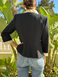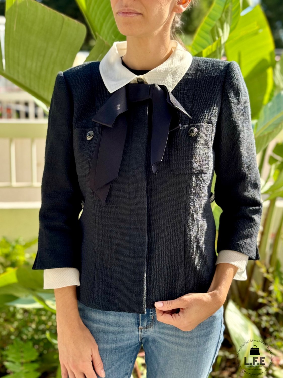 Cette veste en coton bleu marine de la maison Chanel est doublée de soie. Avec son col Claudine blanc et son noeud amovible, qui l’a rend polyvalente.