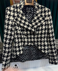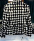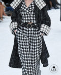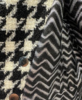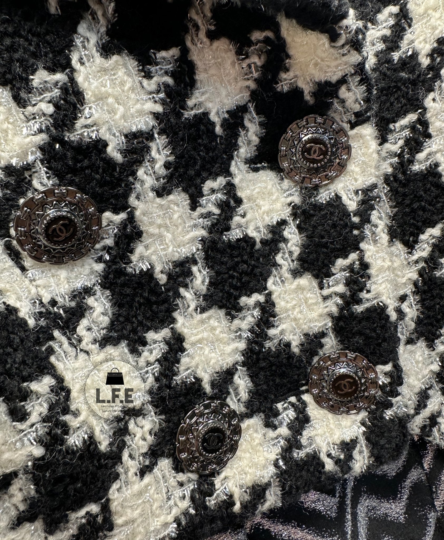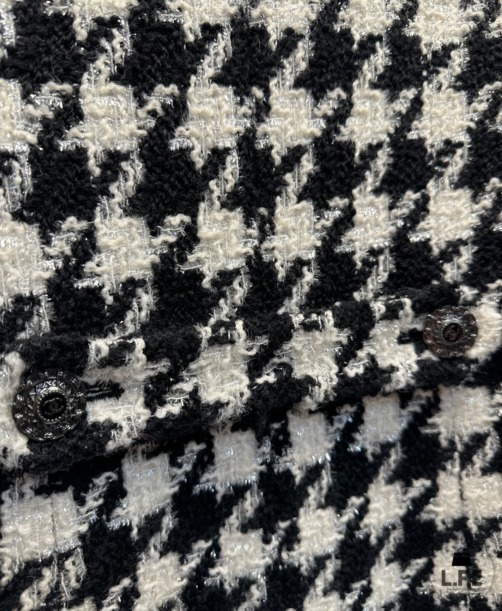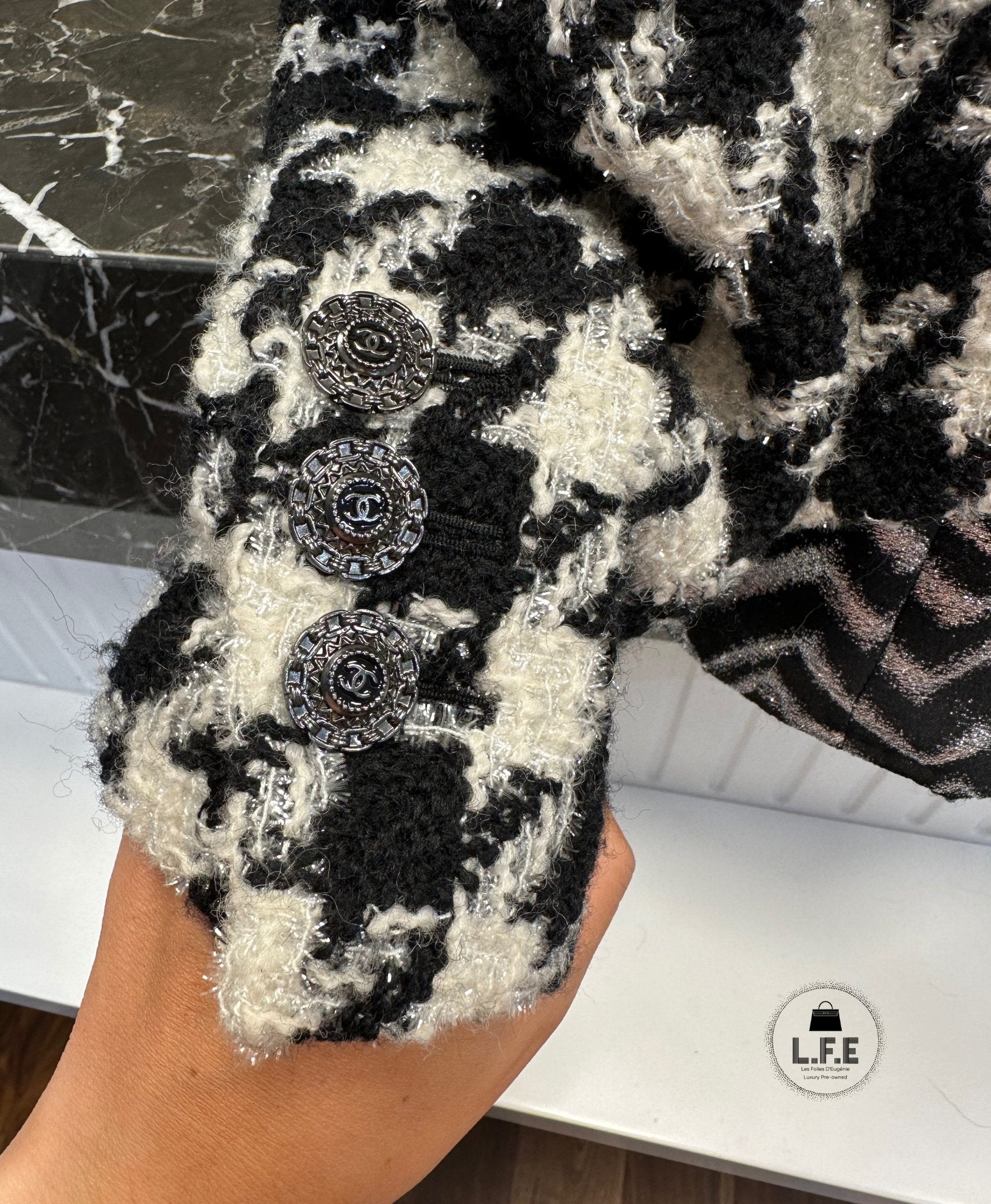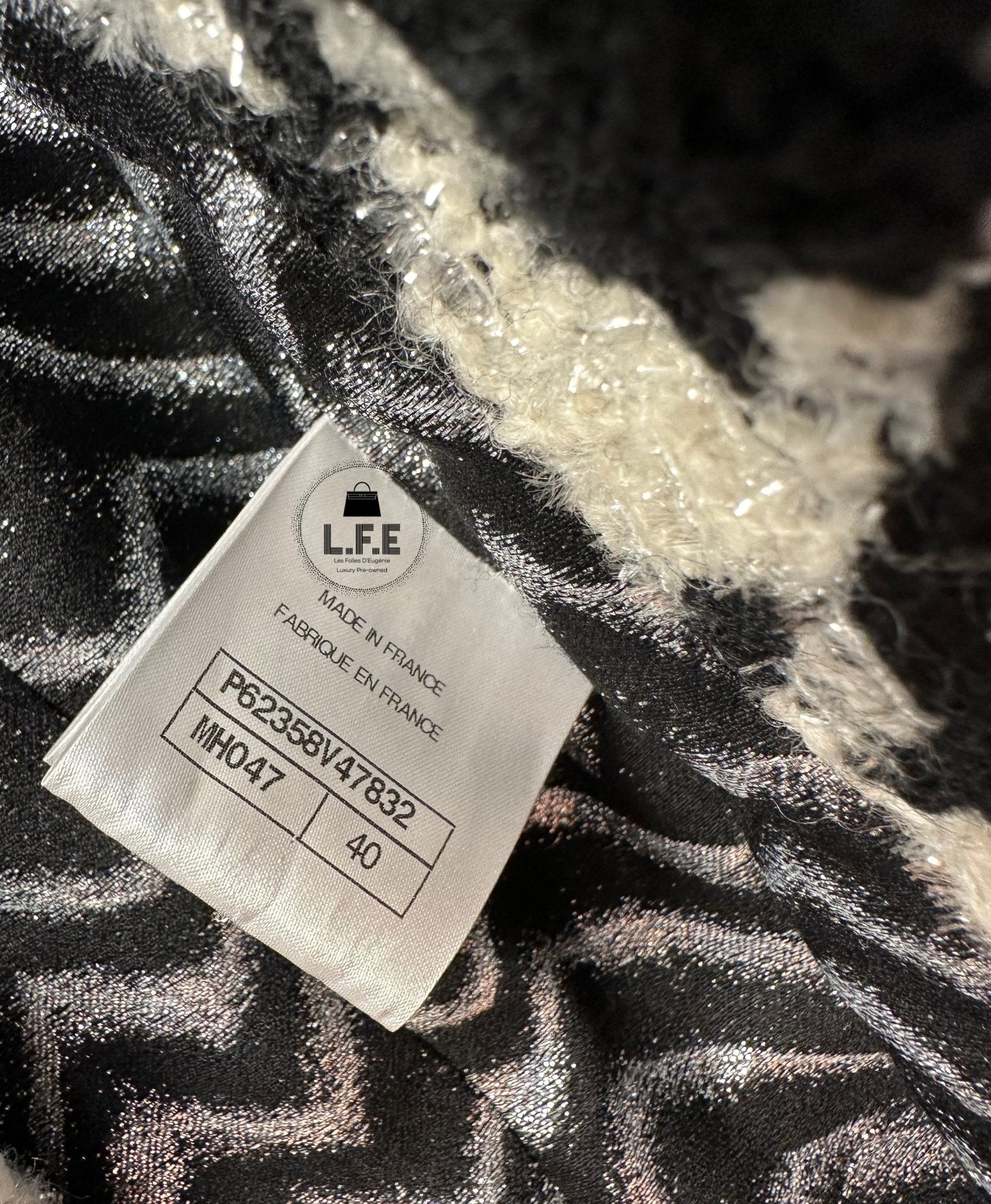 • Coloris noir, blanc et lurex argent, boutons noirs