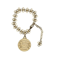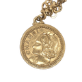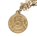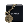 * A large medallion pendant hangs from the chain and features a side profile of a woman with "CHANEL" on one side while the opposite side contains branches, the number "5", and "CHANEL".