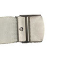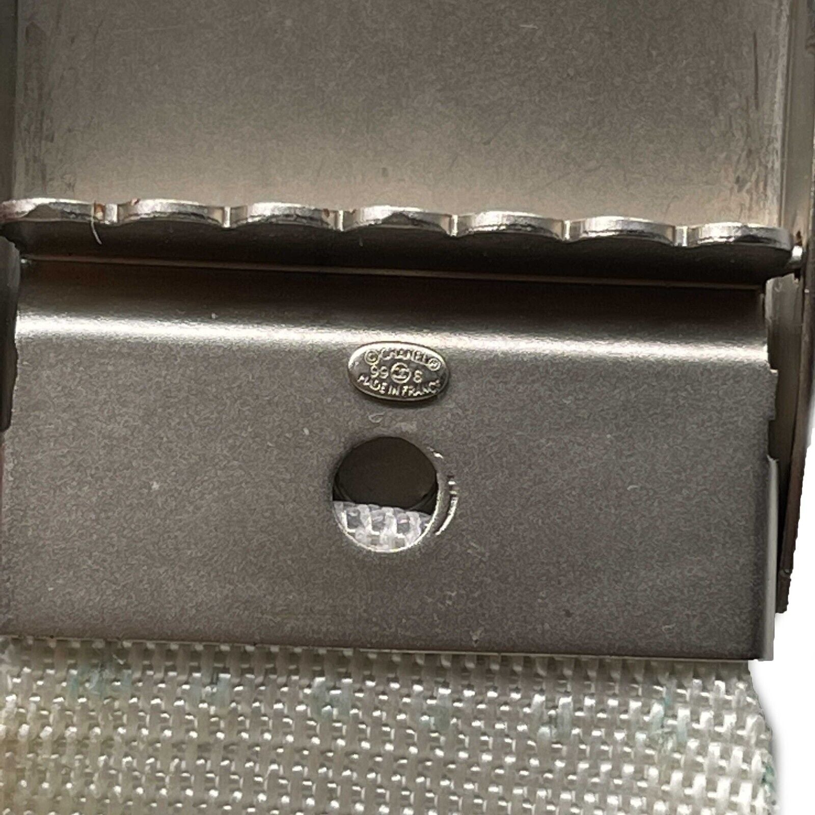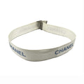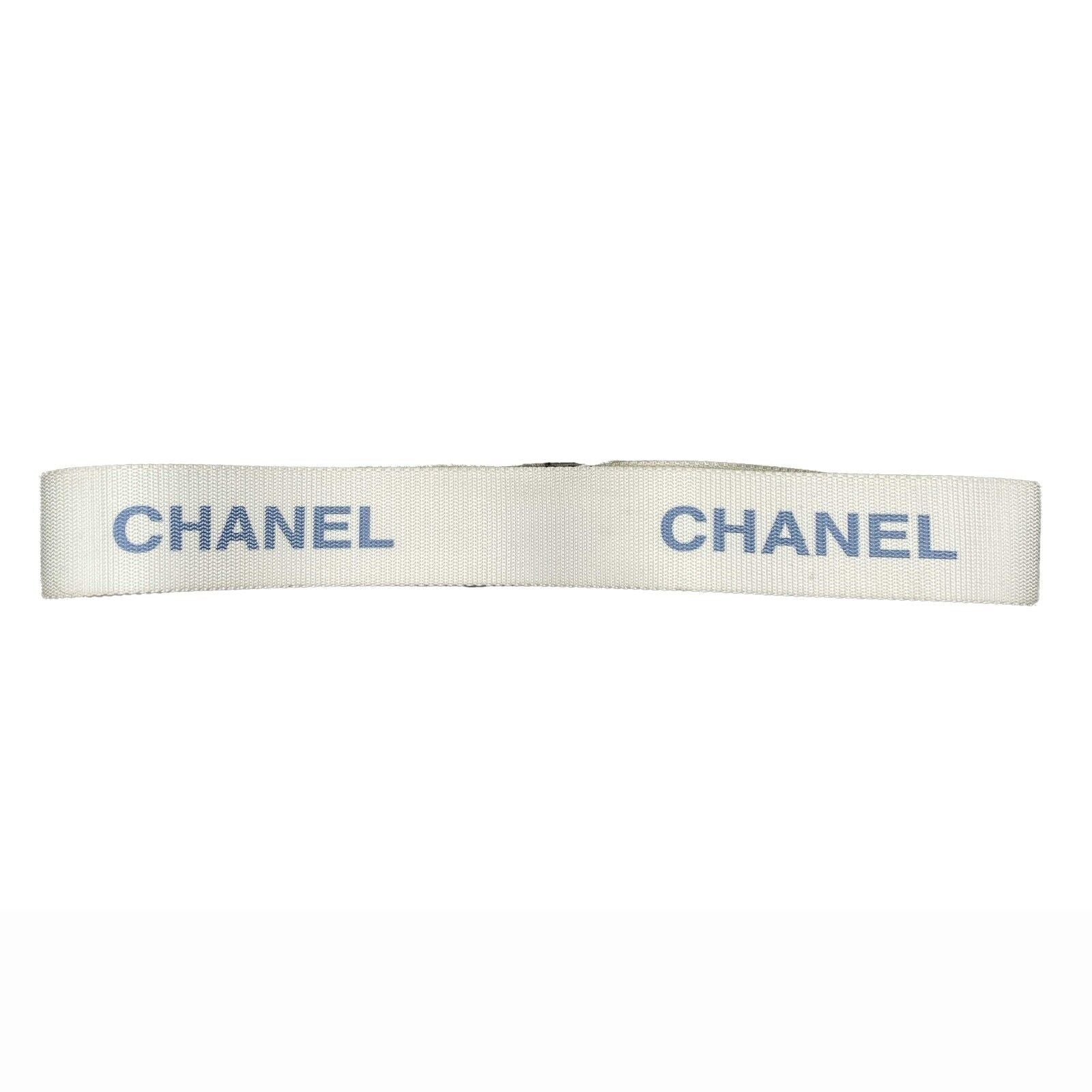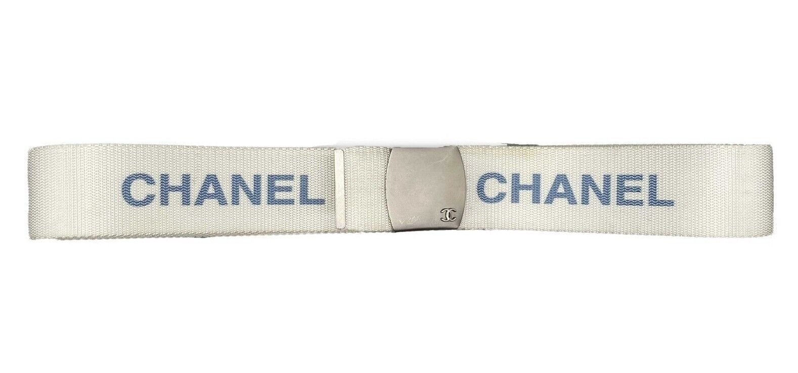 * White nylon web belt with blue CHANEL logo repeating.