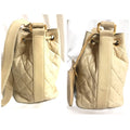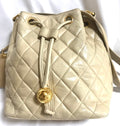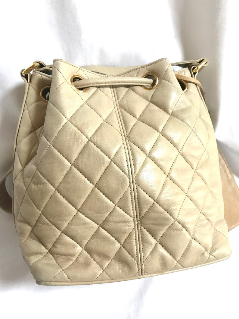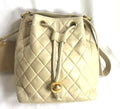 Chanel Vintage beige quilted lamb leather hobo bucket shoulder Bag with drawstrings and golden CC mark ball