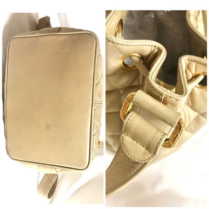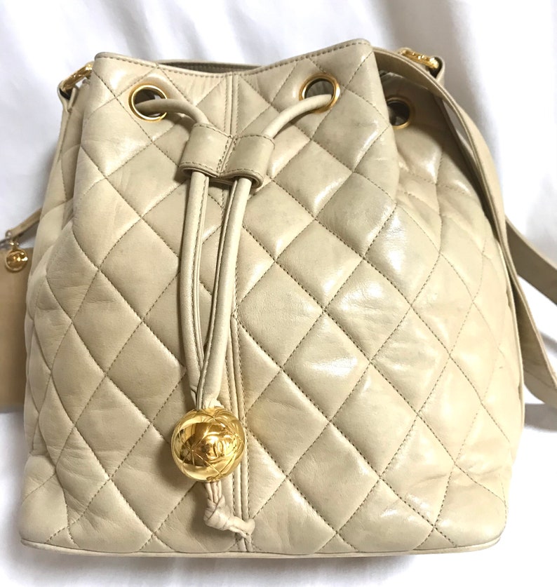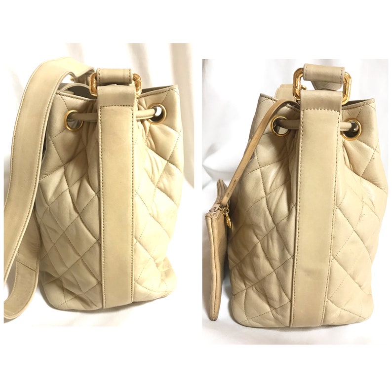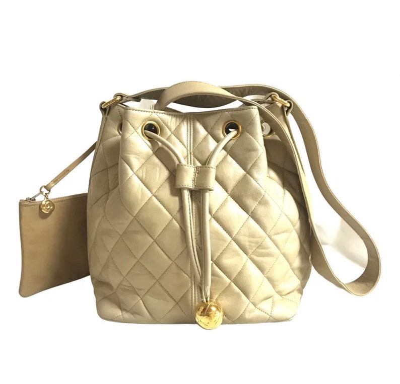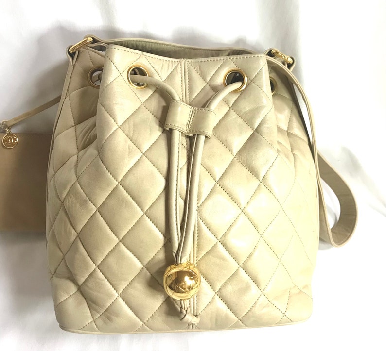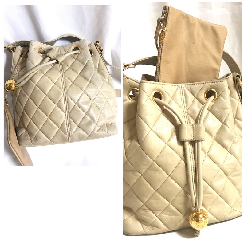 vintage Chanel beige quilted lamb leather hobo bucket shoulder Bag with a matching pouch and a golden CC mark ball.
