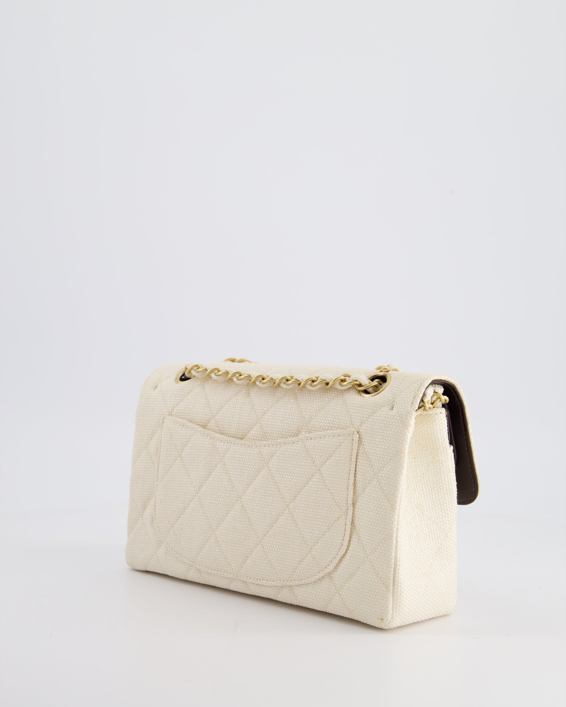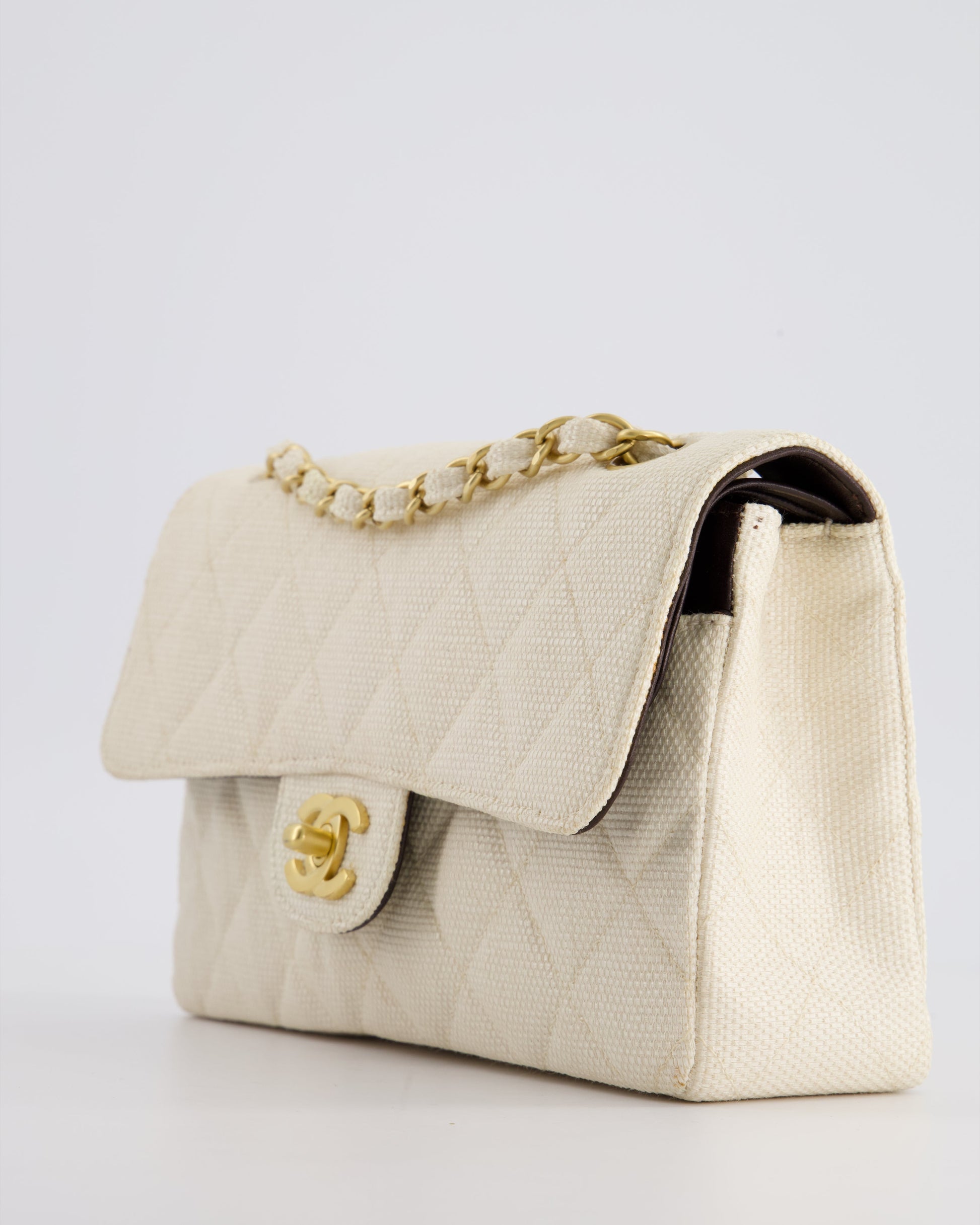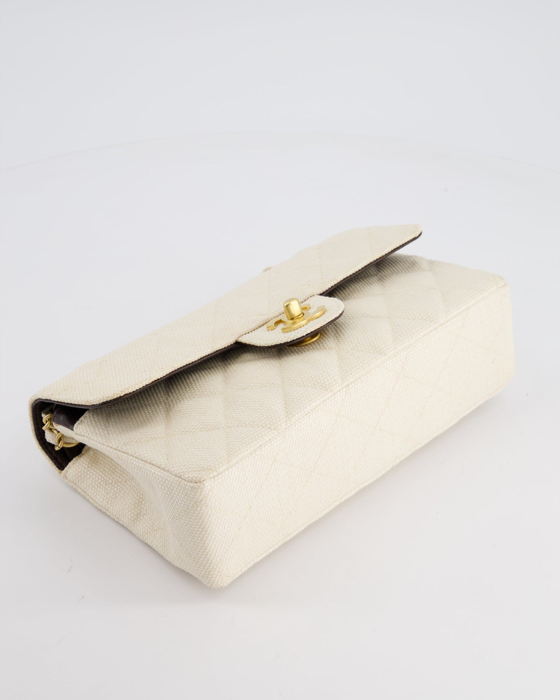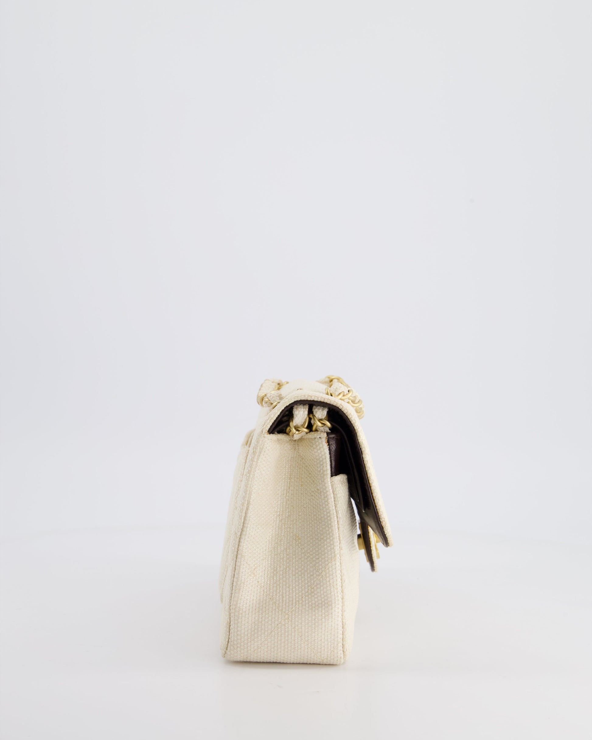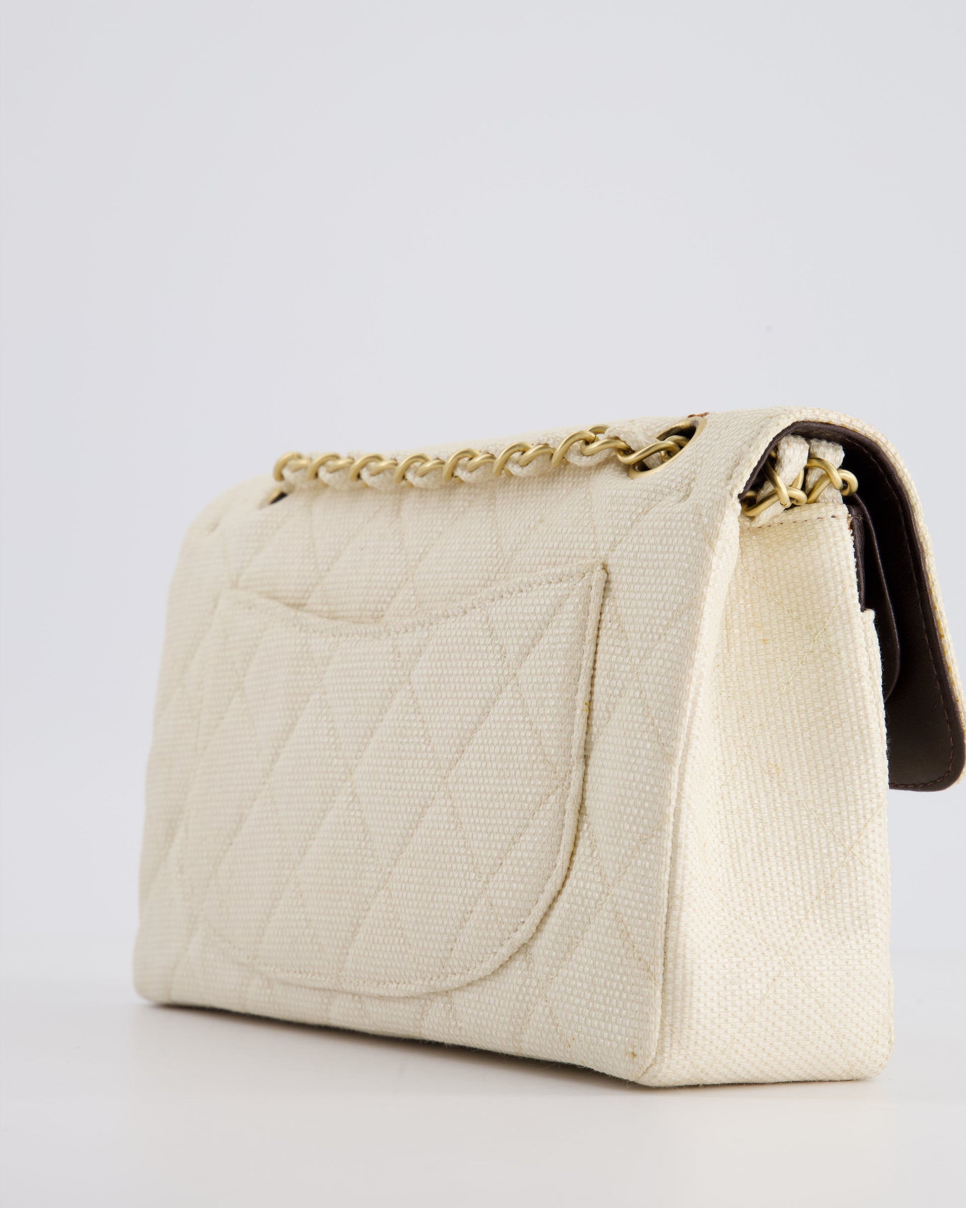 Chanel Vintage Beige Raffia Small Classic Double Flap Bag with Chocolate Brown Lambskin Interior and Brushed Gold Hardware
