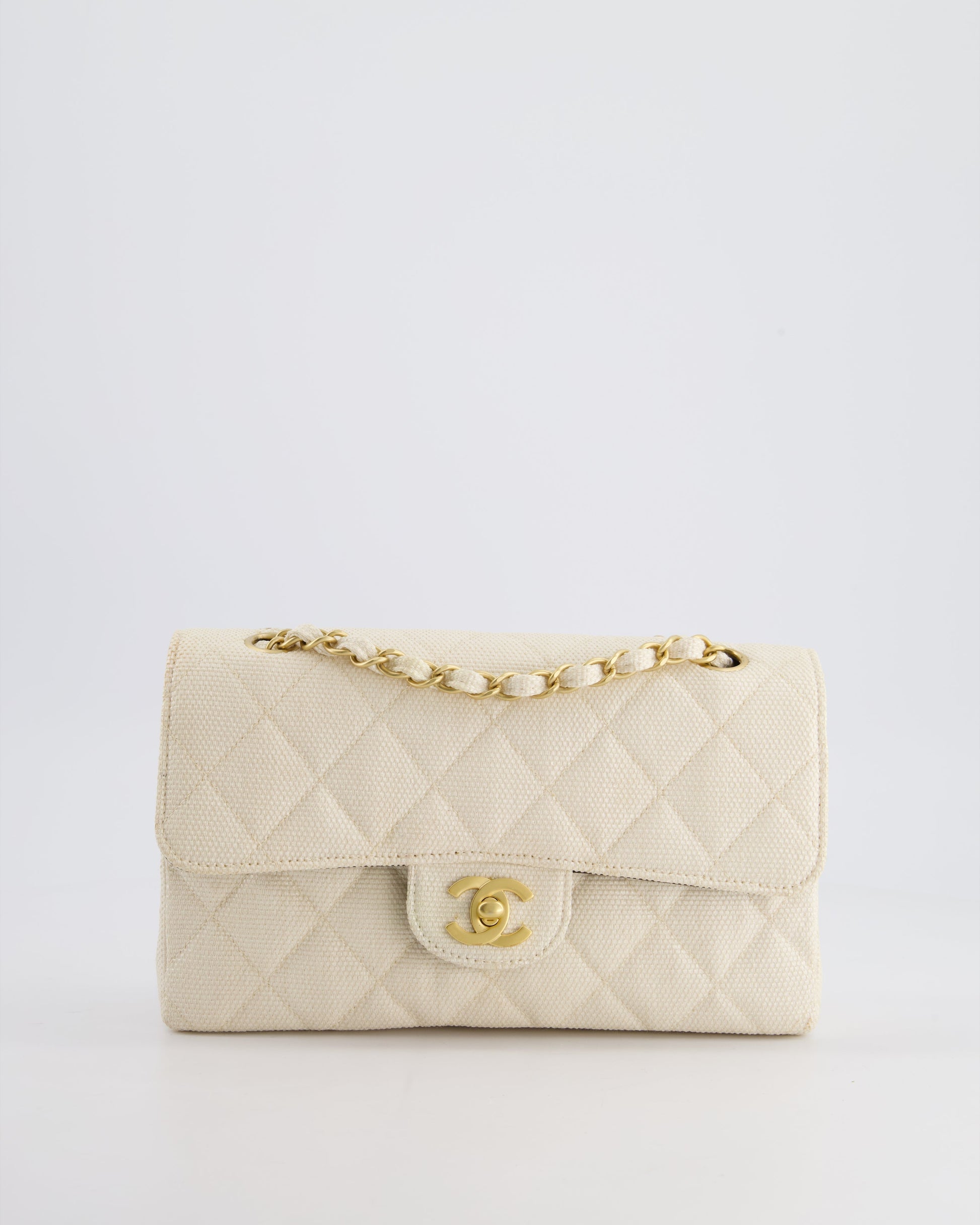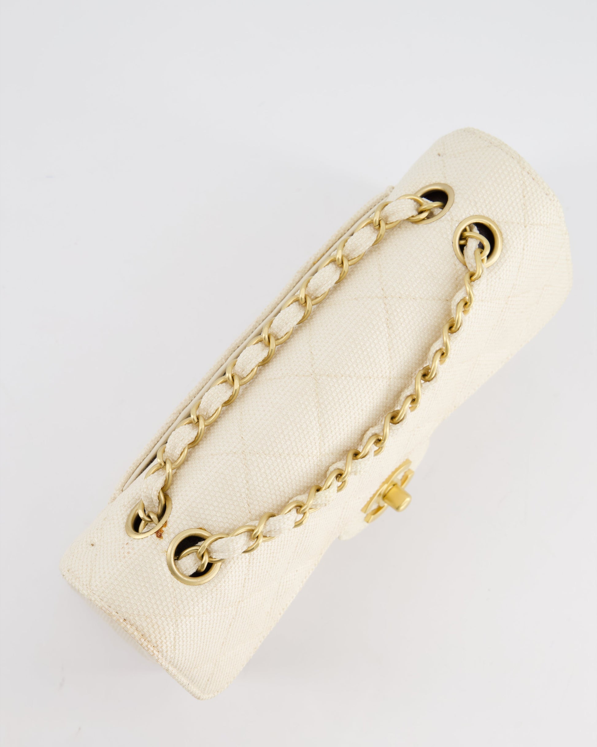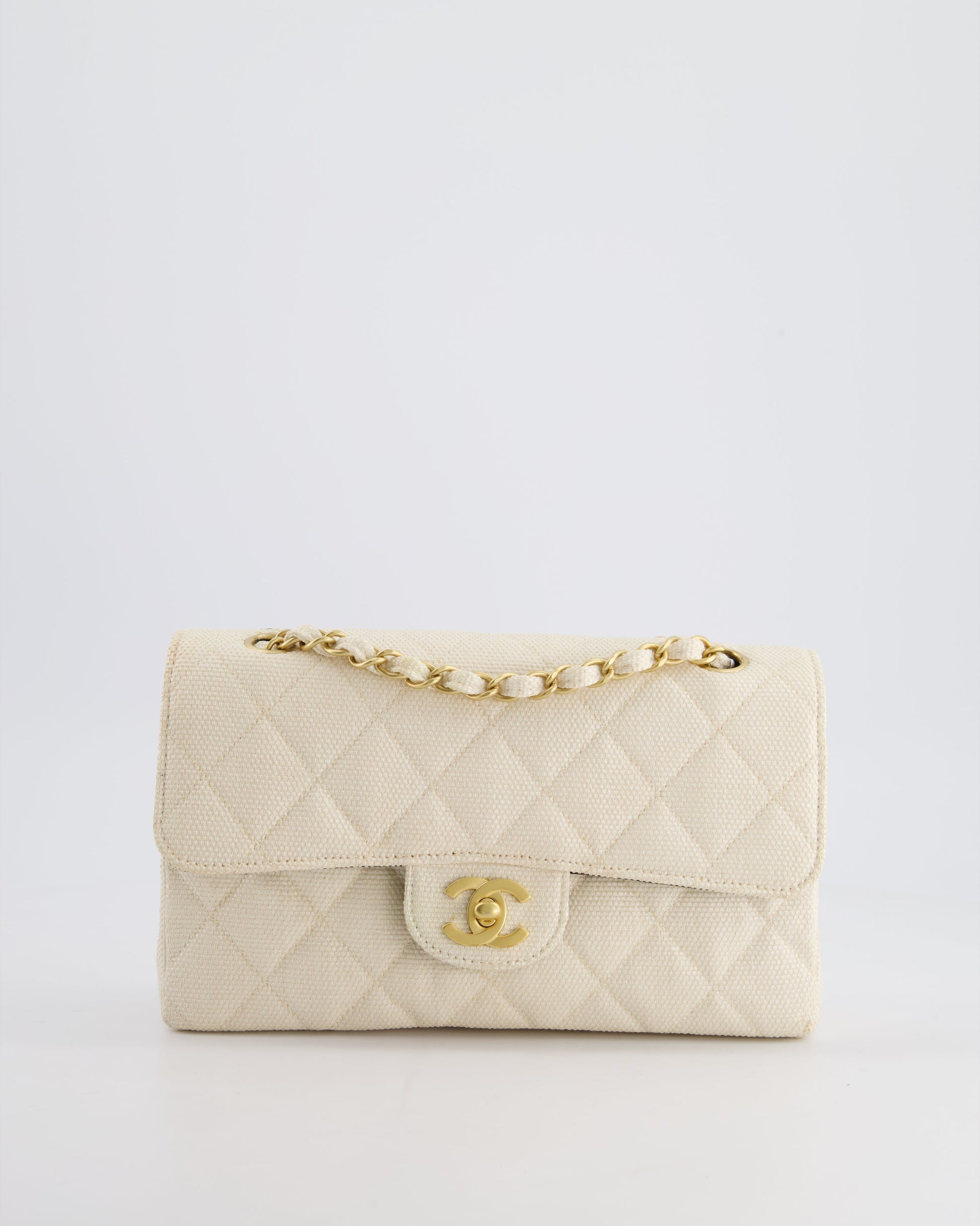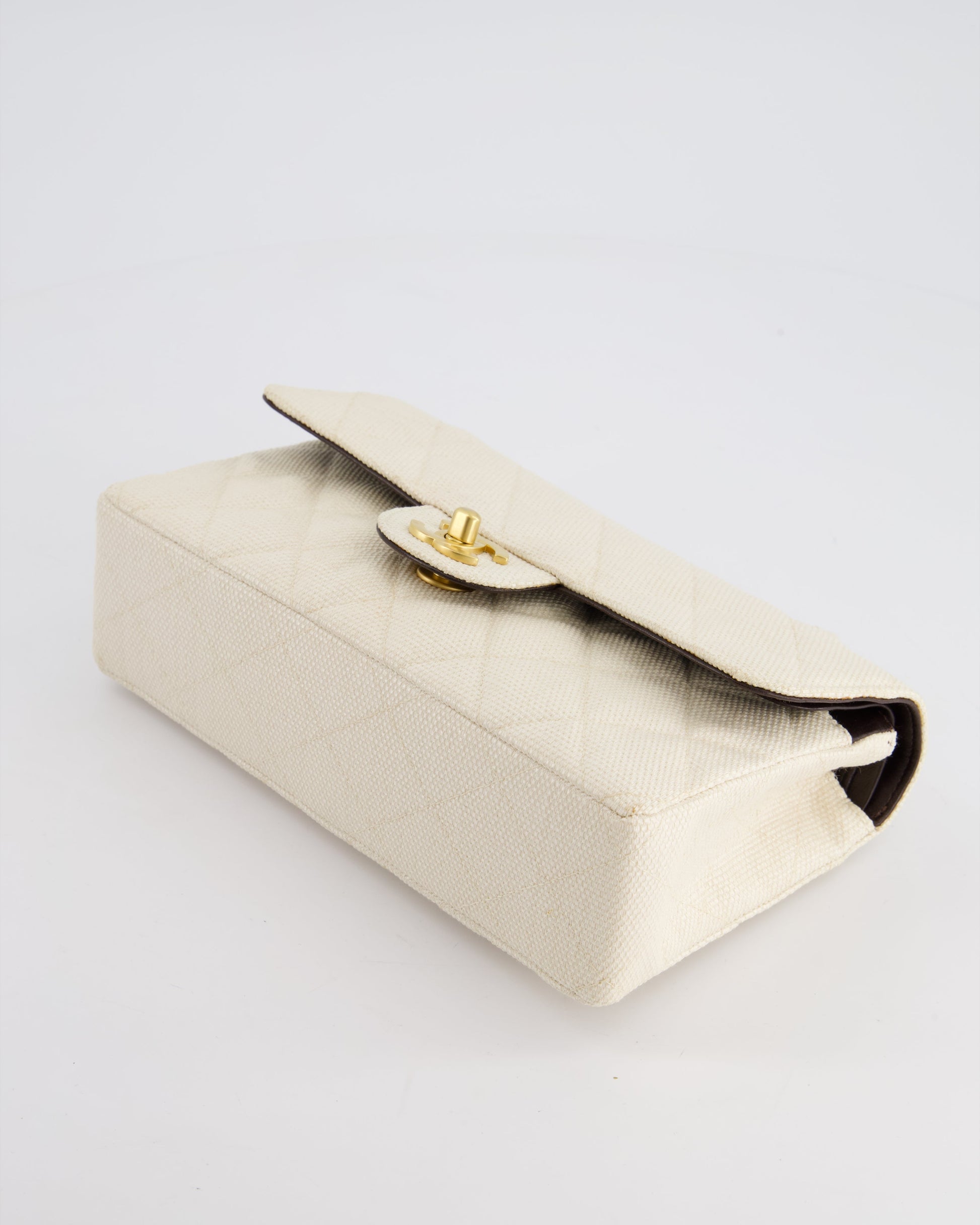 Chanel Vintage Beige Raffia Small Classic Double Flap Bag with Chocolate Brown Lambskin Interior and Brushed Gold Hardware