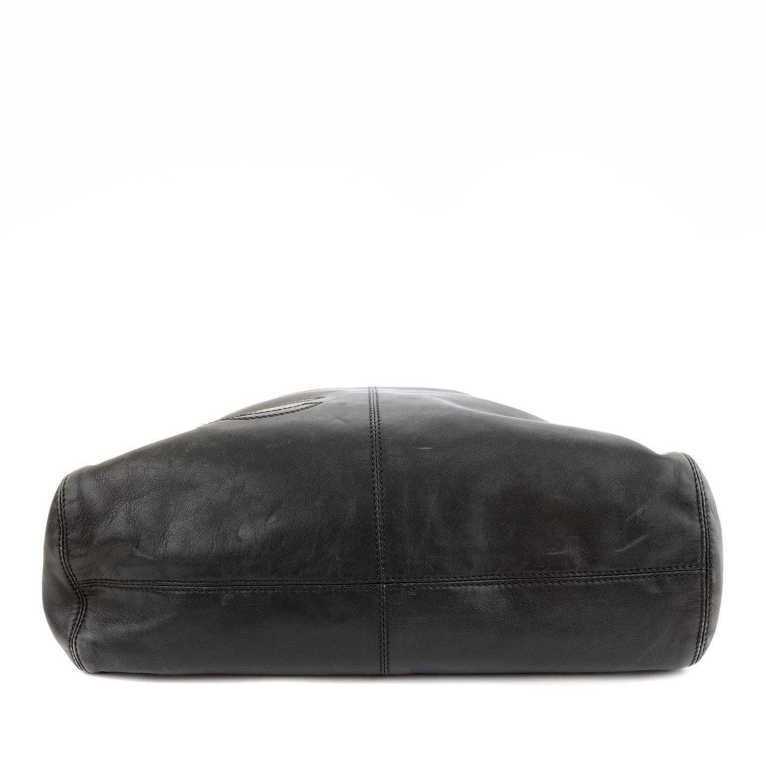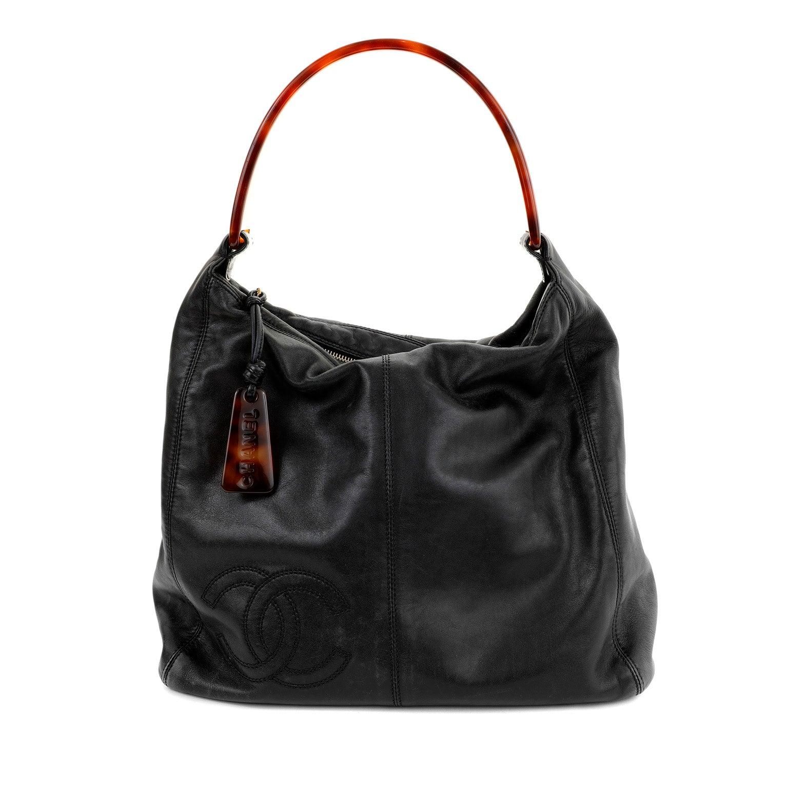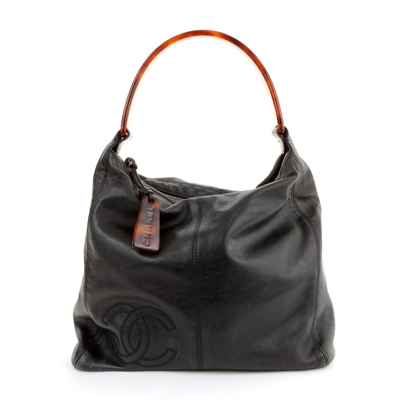 This Chanel Black Lambskin CC Tortoise Handle Hobo is in excellent vintage condition. Luxe black lambskin hobo with interlocking CC tonally stitched off center. Secure zippered top closure with tortoise CHANEL engraved pull. Single tortoise handle may be carried snugly on the shoulder. Dust bag included.