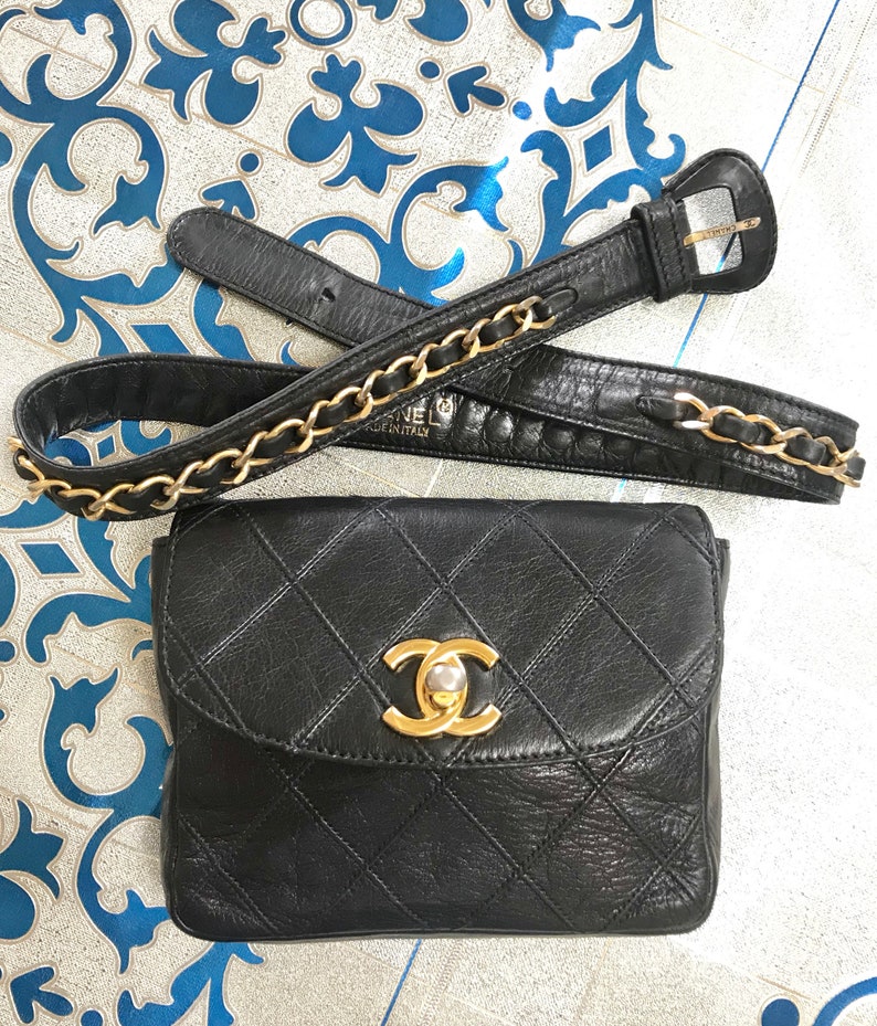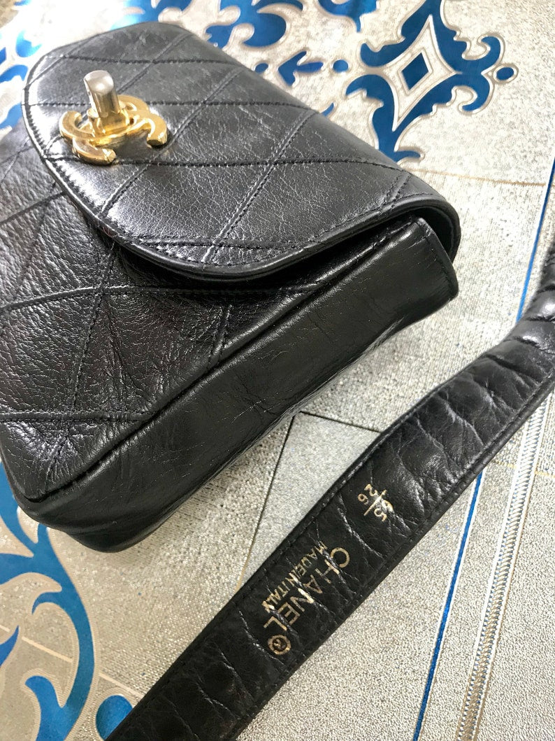 Introducing one of the most popular and iconic items from Chanel back in the old era, 2.55 classic design goatskin fanny pack with leather chain belt.