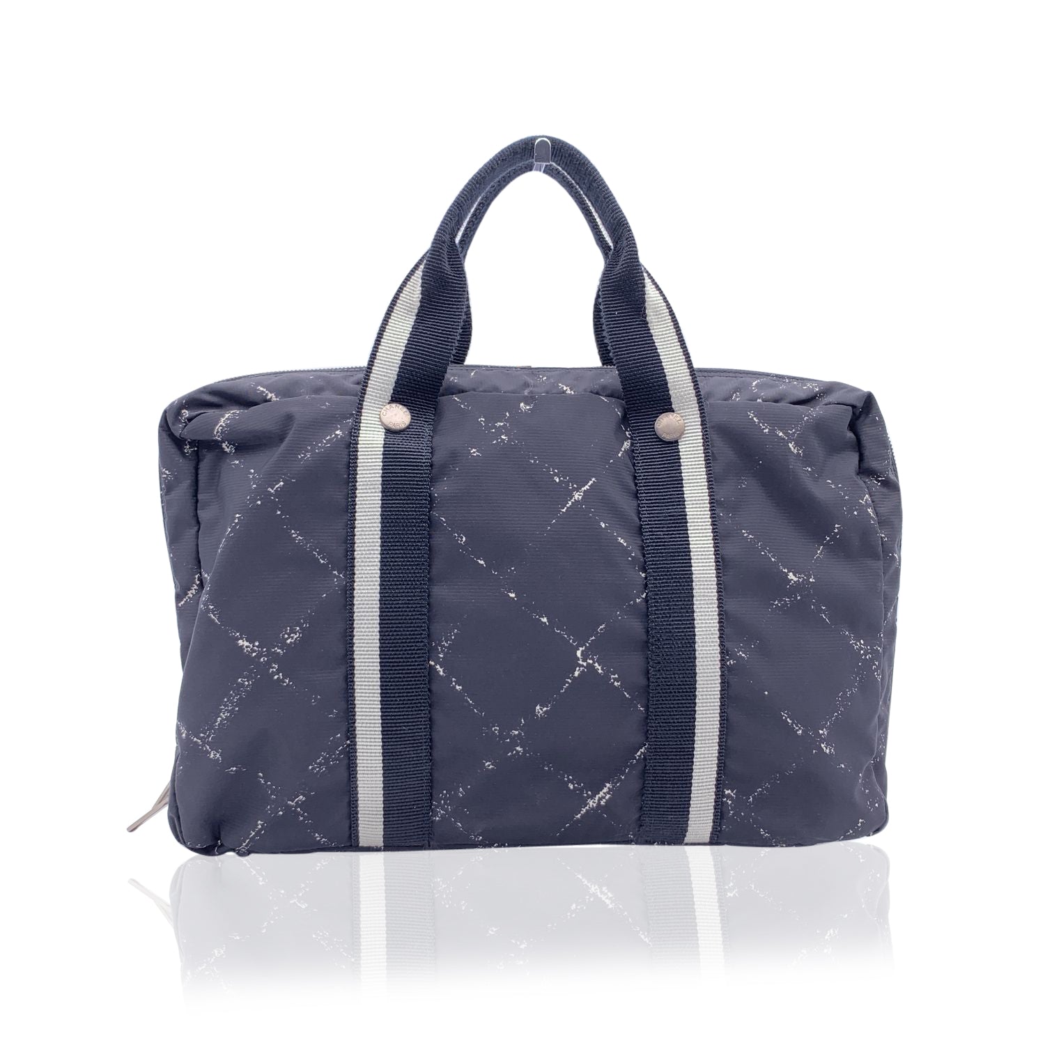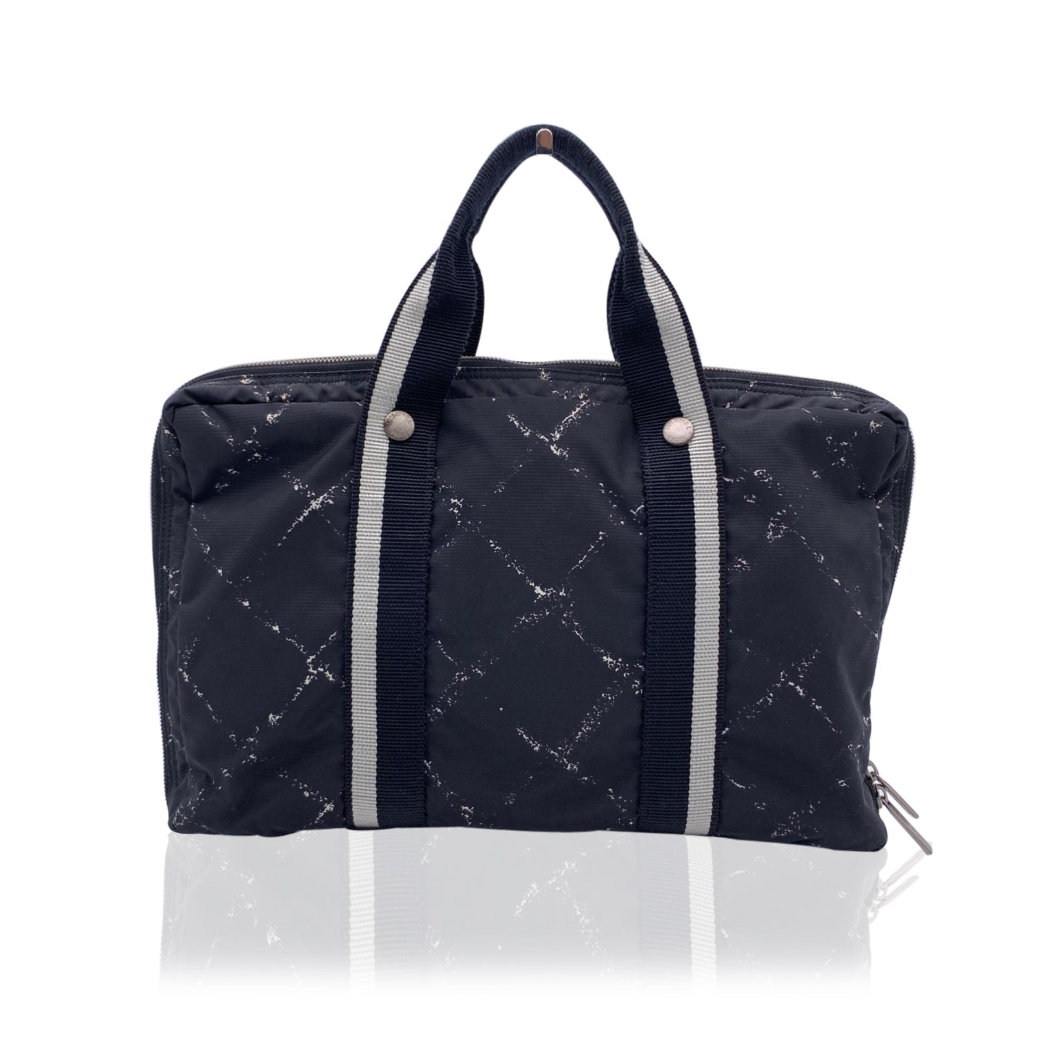 Chanel Black Nylon Old Travel Line satchel bag. Period/Era: Late 90s. Nylon canvas. Silver metal hardware. Flat canvas handles. It features 1 main zip compartments. Red nylon interior 'CHANEL', 'Made in France' and hologram tag inside