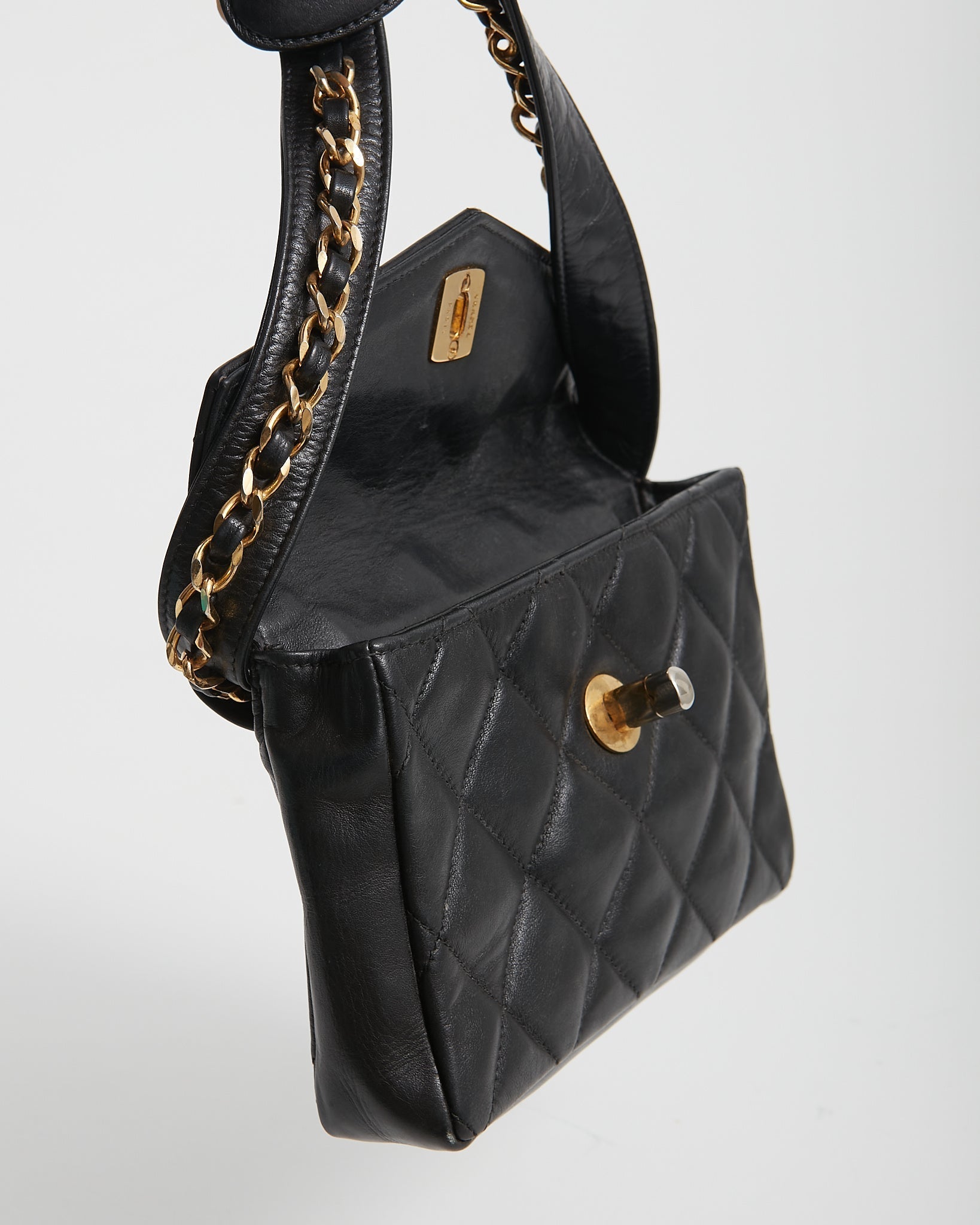 Condition Exterior: 7/10 - Good Condition. The bag shows signs of wear. Minor scuffings to the corners of the bag. Scratches & discoloration throughout the hardware. Wrinkling throughout the leather & minor loss of structure due to storage. Delicate front closure system & grainy feeling to leather quilting, due to dryness & age.