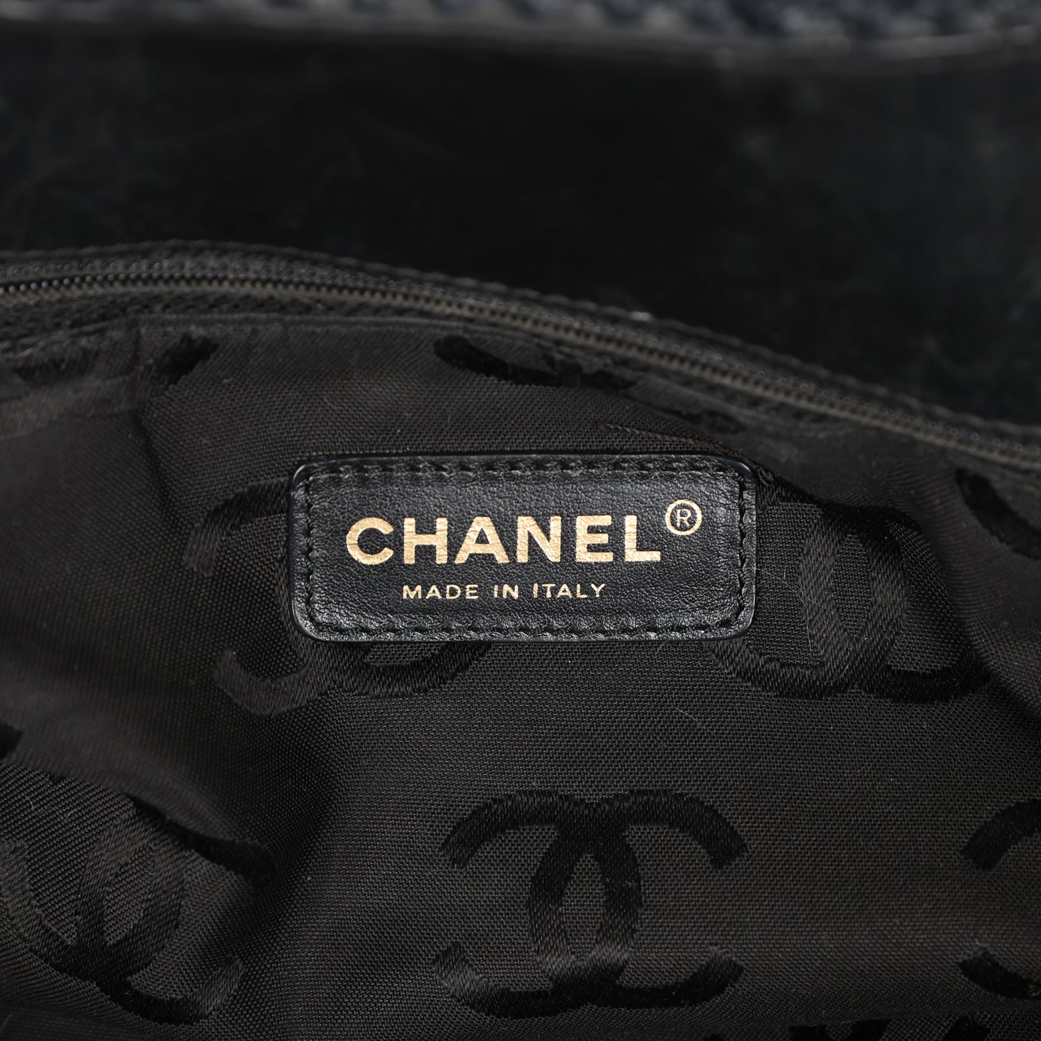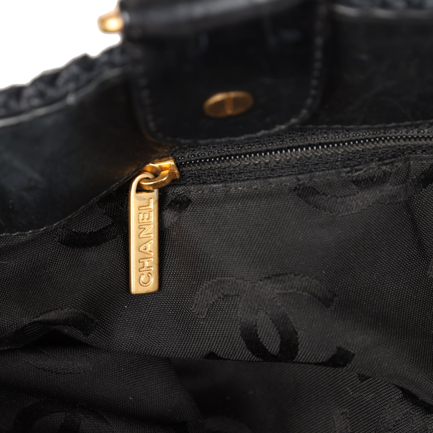 The interior is lined in black leather and features a zipper pocket with Chanel pull.