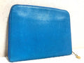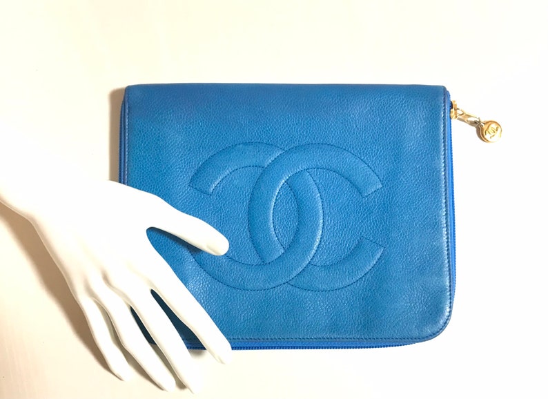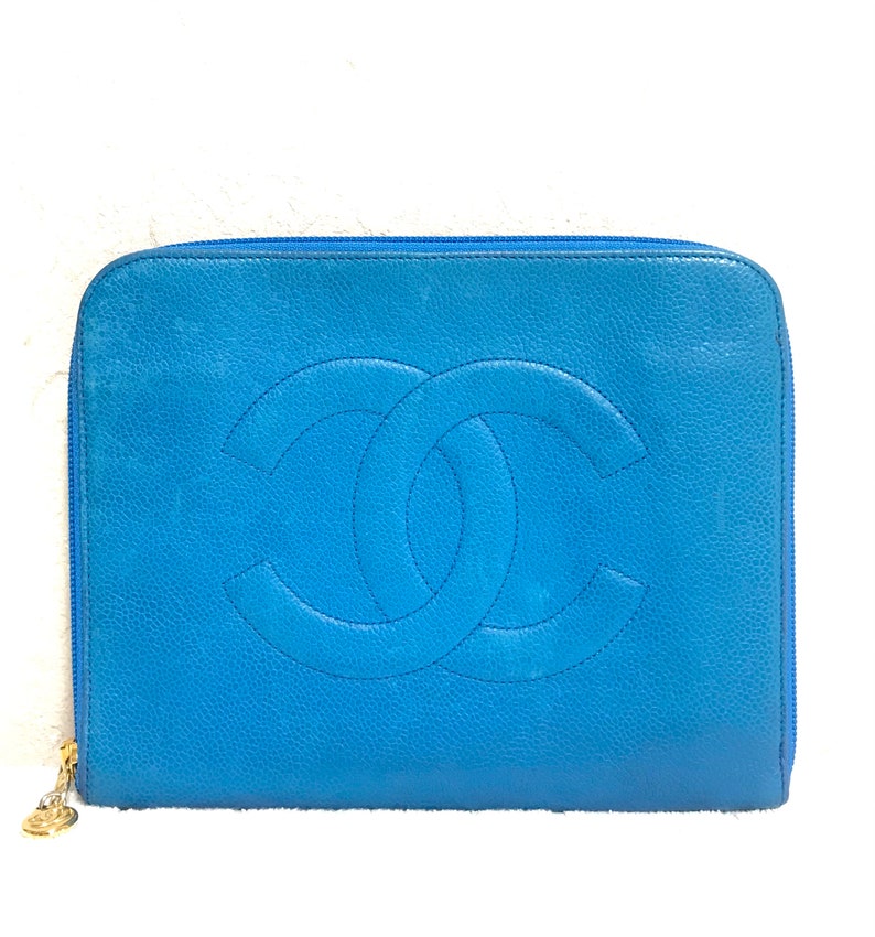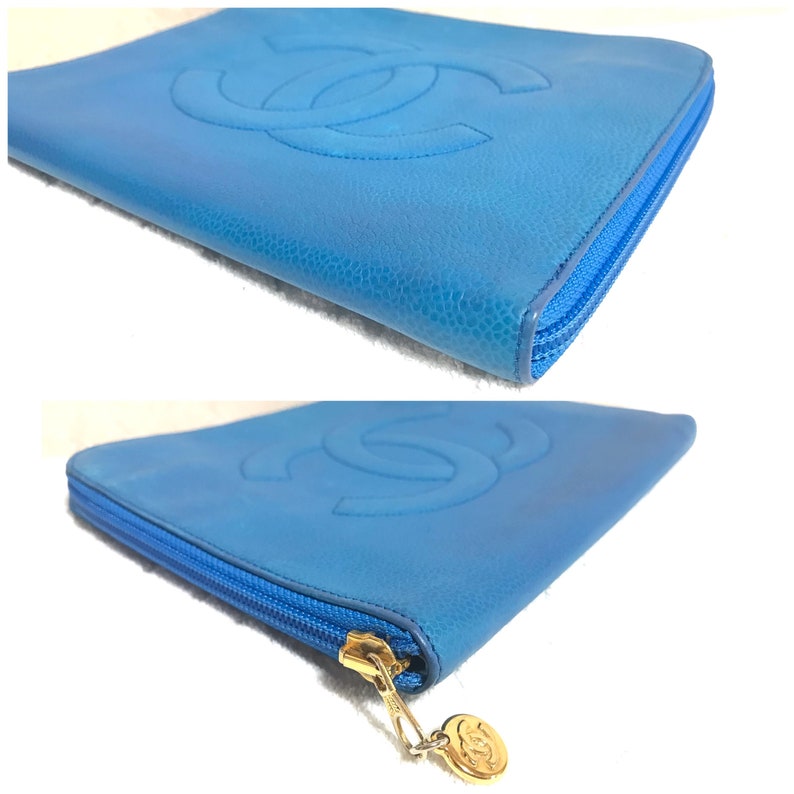 Introducing a vintage caviar leather round zipper clutch Bag/wallet pouch from Chanel in the 90s! Beautiful vivid blue color! Has 2 main compartments with 1 slit in pocket and 1 zipper pocket.