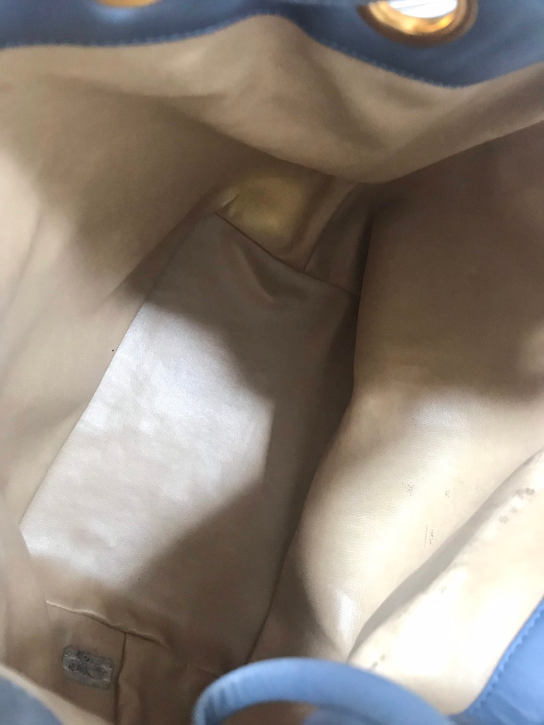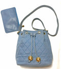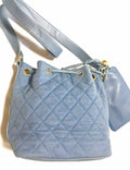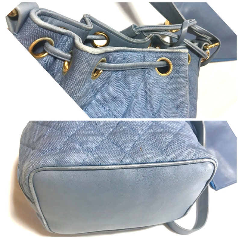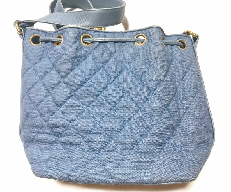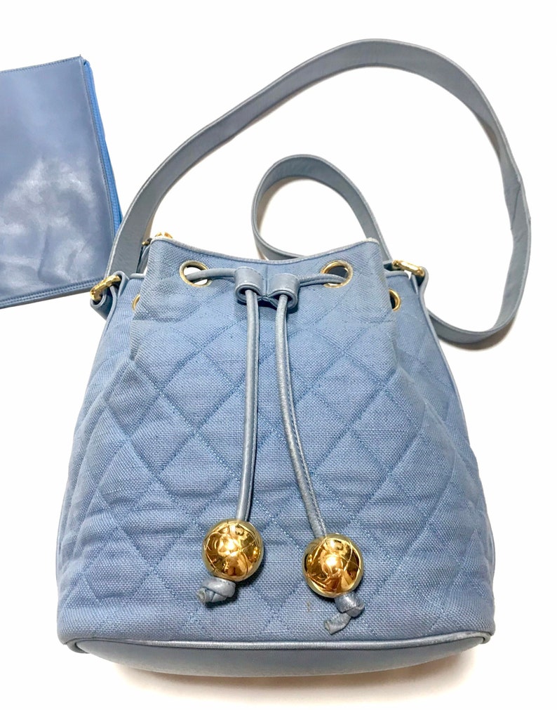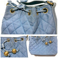 Chanel Vintage blue quilted canvas and leather combo hobo bucket shoulder Bag with drawstrings and golden CC mark balls