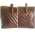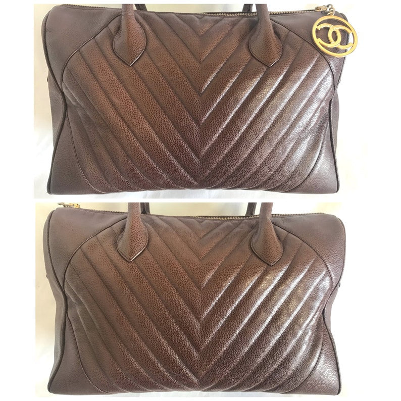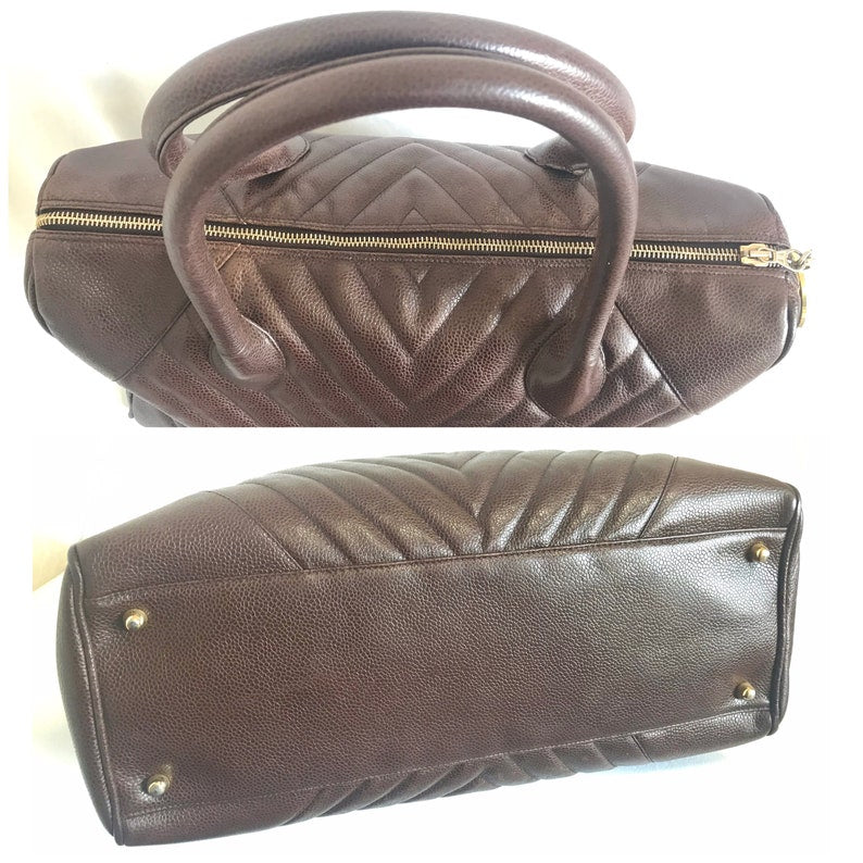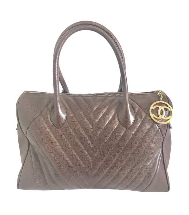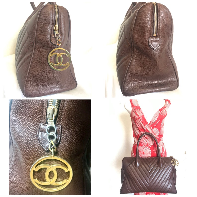 Chanel Vintage brown caviarskin v stitch, chevron style Bag, Speedy Bag with golden CC charm